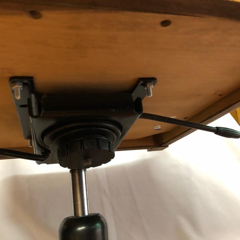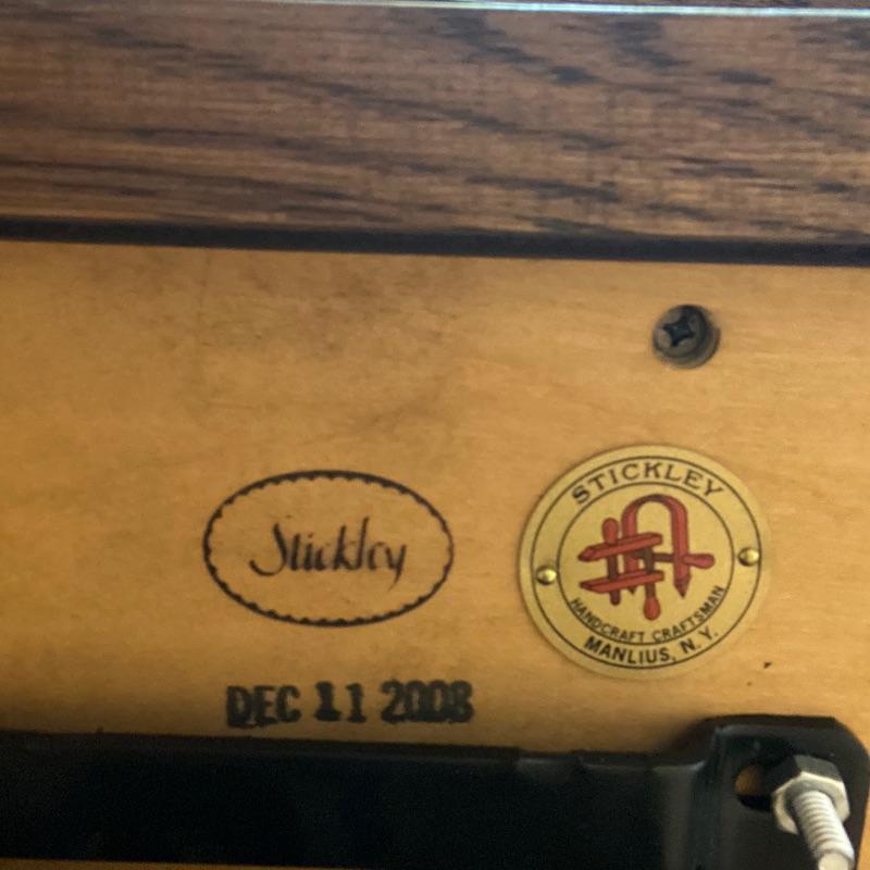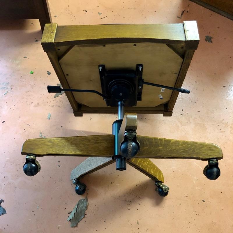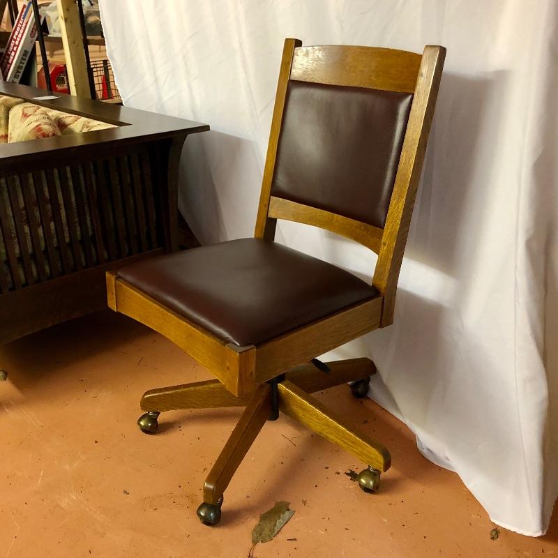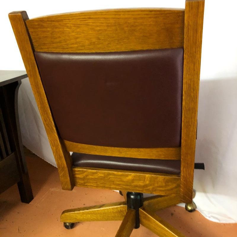 This handsome Stickley swivel Desk chair is very solid and very well cared for. Cordoba Leather seat and back and the wood appears to be oak. Good quality caster wheels make this a smooth moving and comfortable chair that can be lowered for height adjustment. At its highest setting it sits 21”. Chair measures 20” x 21” x 42”.