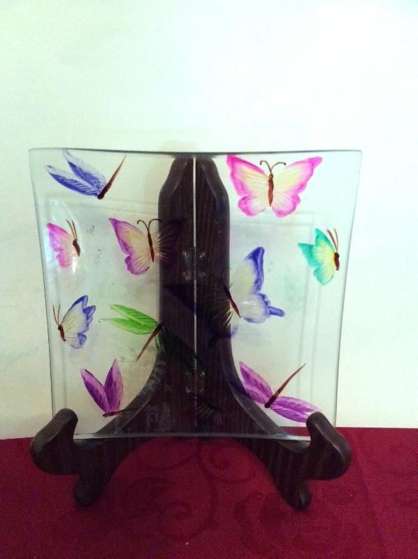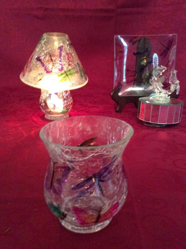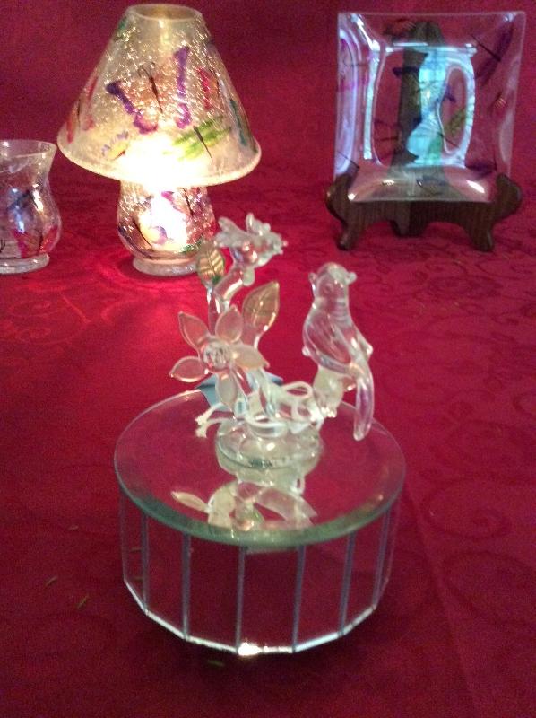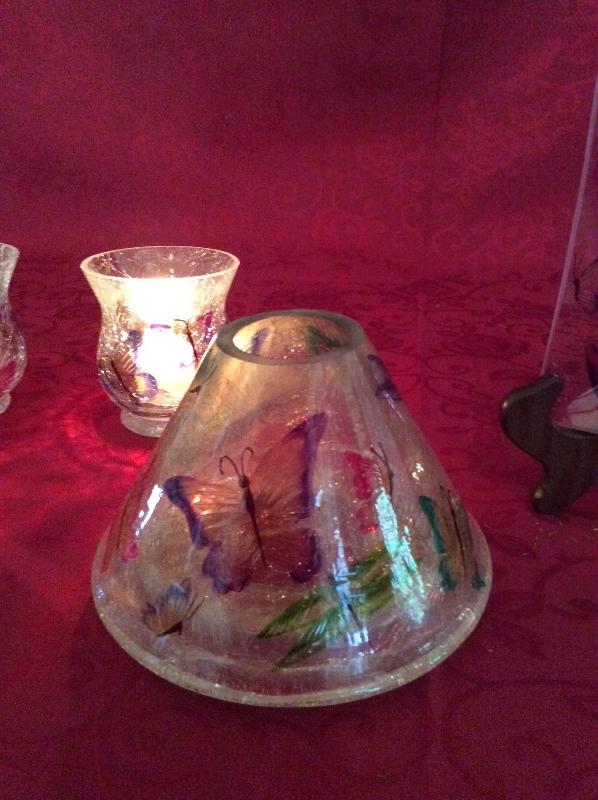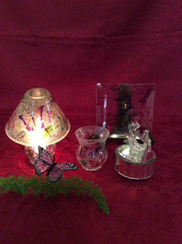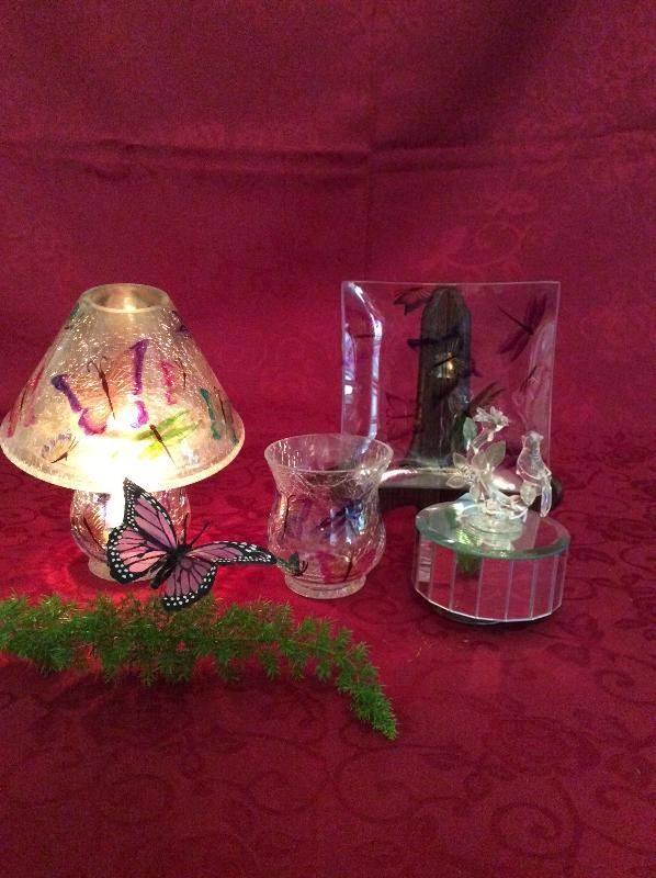 Yankee Candle Grouping and Bird Musical Box Painted with Butterfly Glass candle shade, 5” square candle tray, 2 Butterfly votive holders and mirrored music box with hand blown floral and bird.