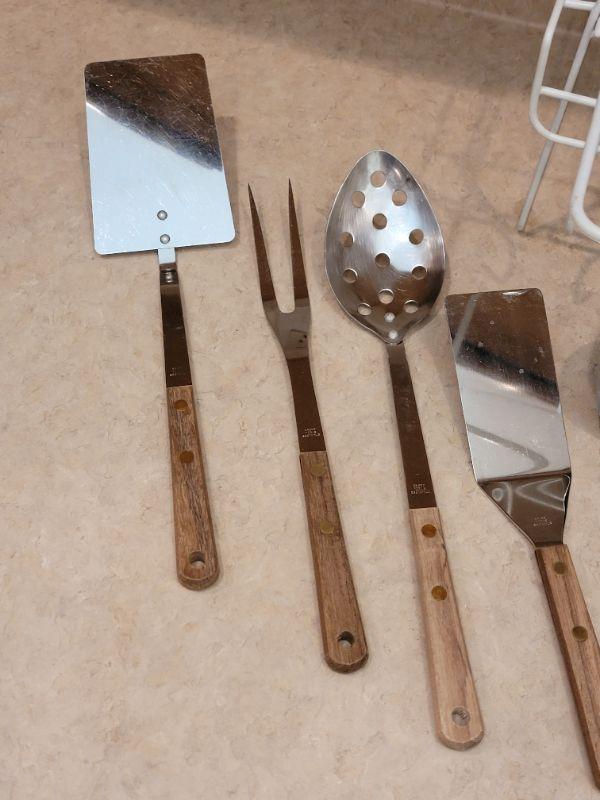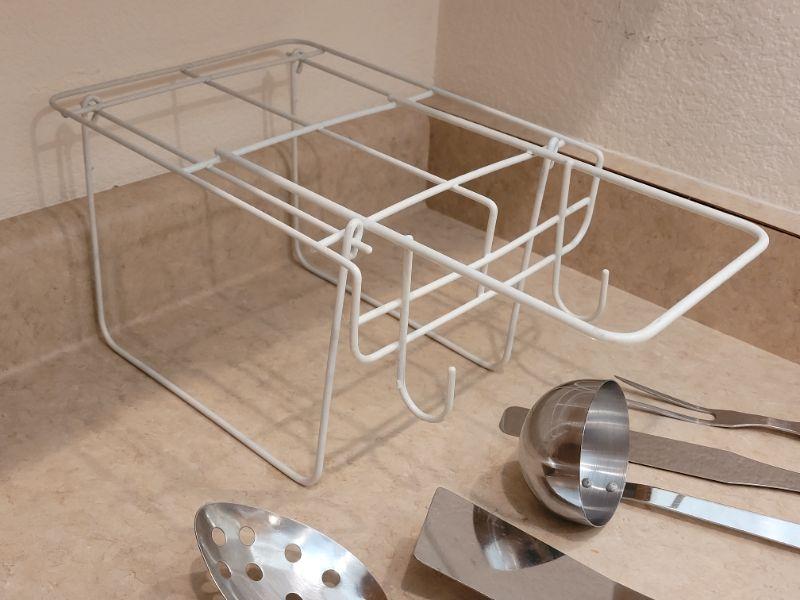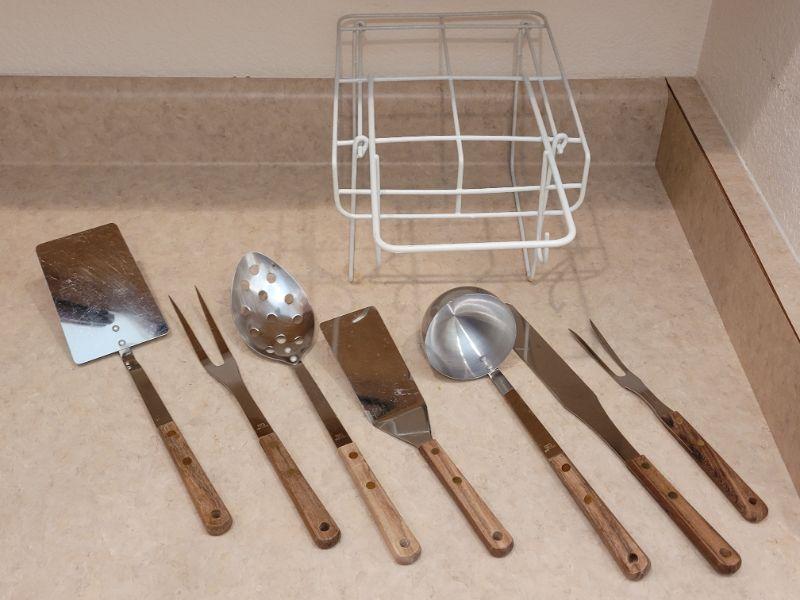 Lot 6: Vintage Set of Kitchen Utensils and a Space Saving Shelf/Rack