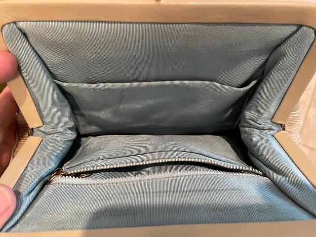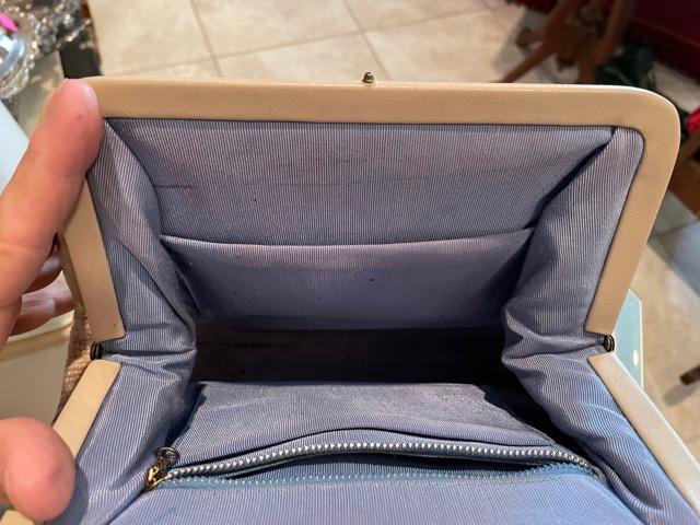Ivory background with 2 Roses needlepoint purse. Blue satin lining.