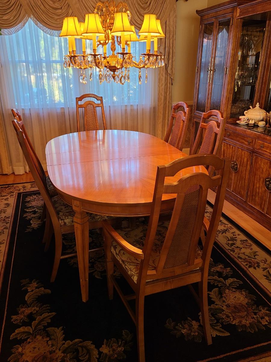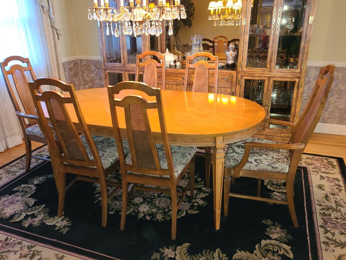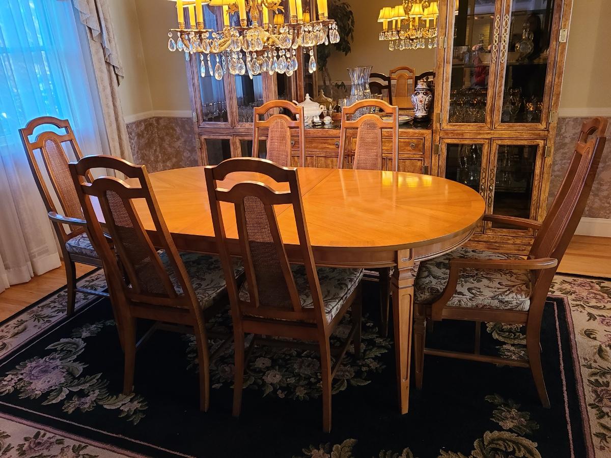 Vintage dining room table and chairs. This set still looks new, with very minimal wear. There are one or two marks on the table, but hard to see. This piece is part of a unit that we are breaking up into three in case people want one part of the unit since they can stand alone. If you want all three, then you will need to bid on all three. This is for the left hand display case. The back is mirrored, there are glass shelves, and brass hardware. This will be sold individually and the only place it will share wear is the two small holes where the top unit is connected, they can be plugged. This makes a gorgeous display cabinet, book cabinet, or art display in any room! This is one long piece so you will need to bring a truck. Glassware not included. Please see all pictures as they are the best representation of the items. The pictures show condition, measurements if taken, and what is included in the lot. Due to the large amount that we photograph and the time frame, we are not always able to take measurements. All items unless noted, are pre-owned and have been used. If you purchased furniture, you must bring help. We do not allow one person to carry large furniture out on their own. Bring help, tools and a truck for the safety of our client’s homes, and your personal safety. Company policy. Thank you.