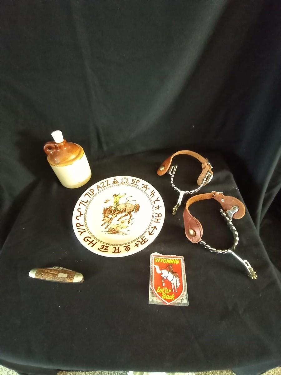 SPURS-RODEO PATCH-CLAY JUG-POCKET KNIFE AND RODEO PLATE