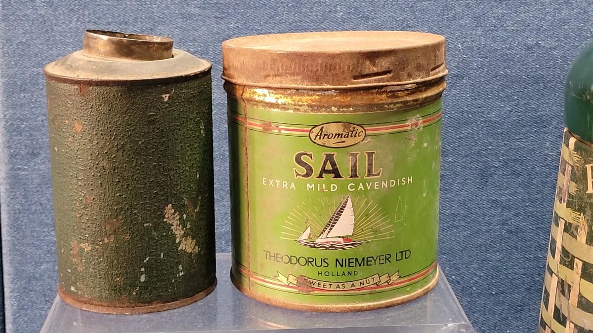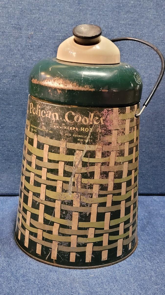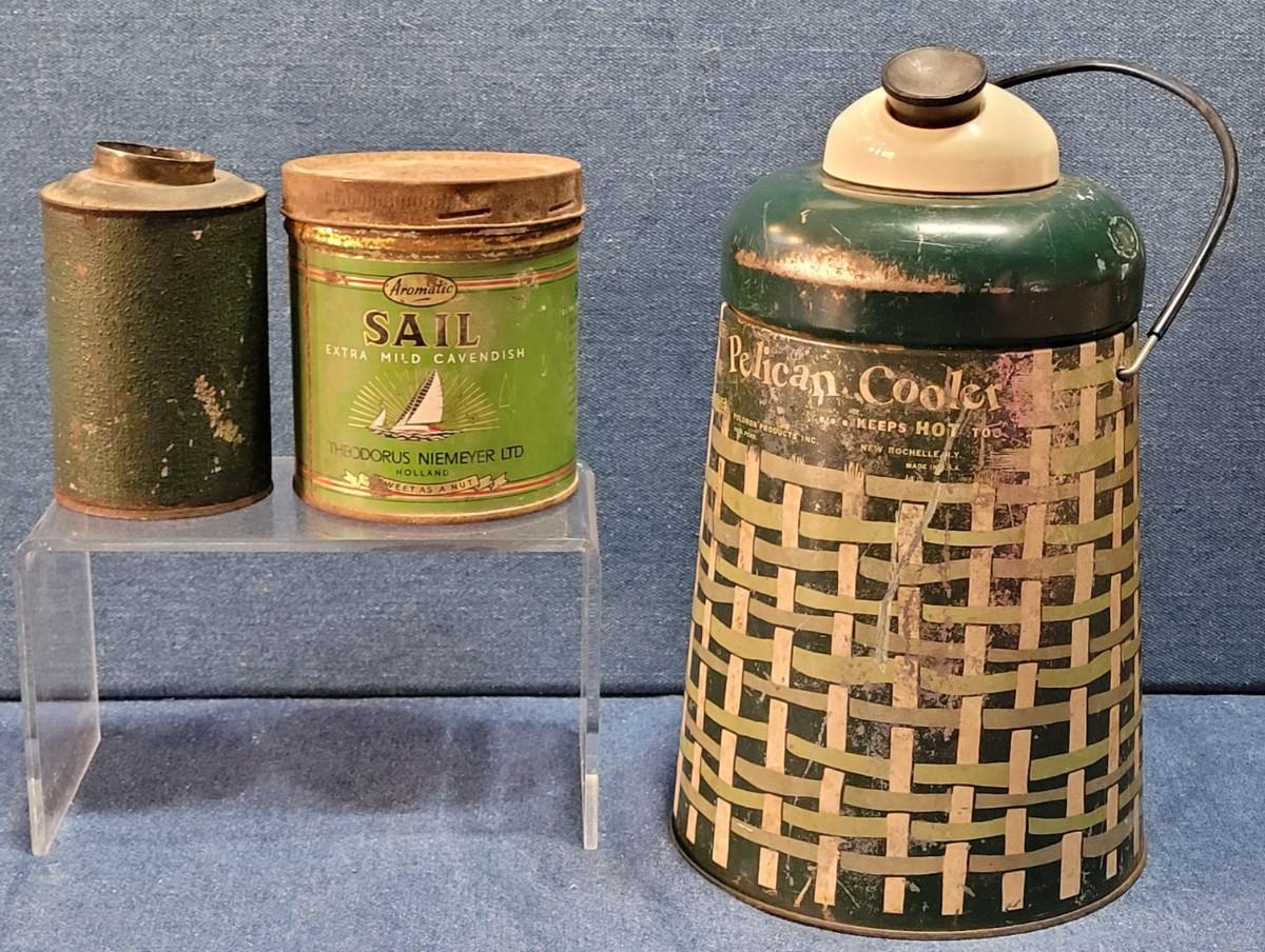 Lot 6: Vintage Green & White Pelican Cooler and 2 Green Metal Tins
