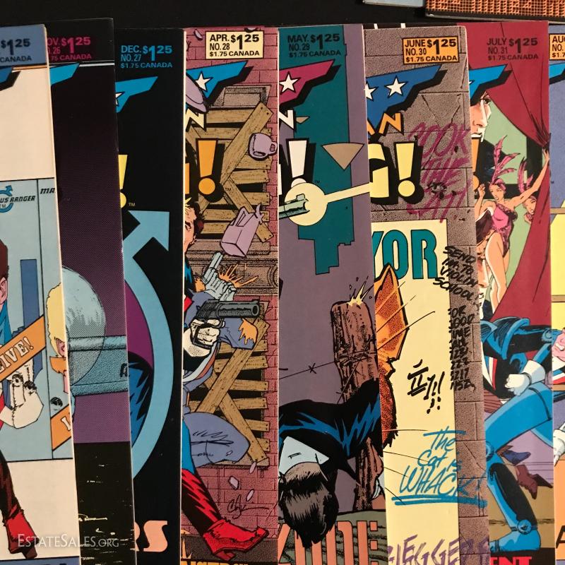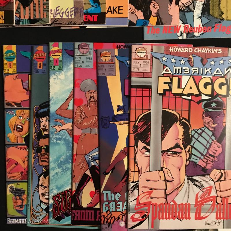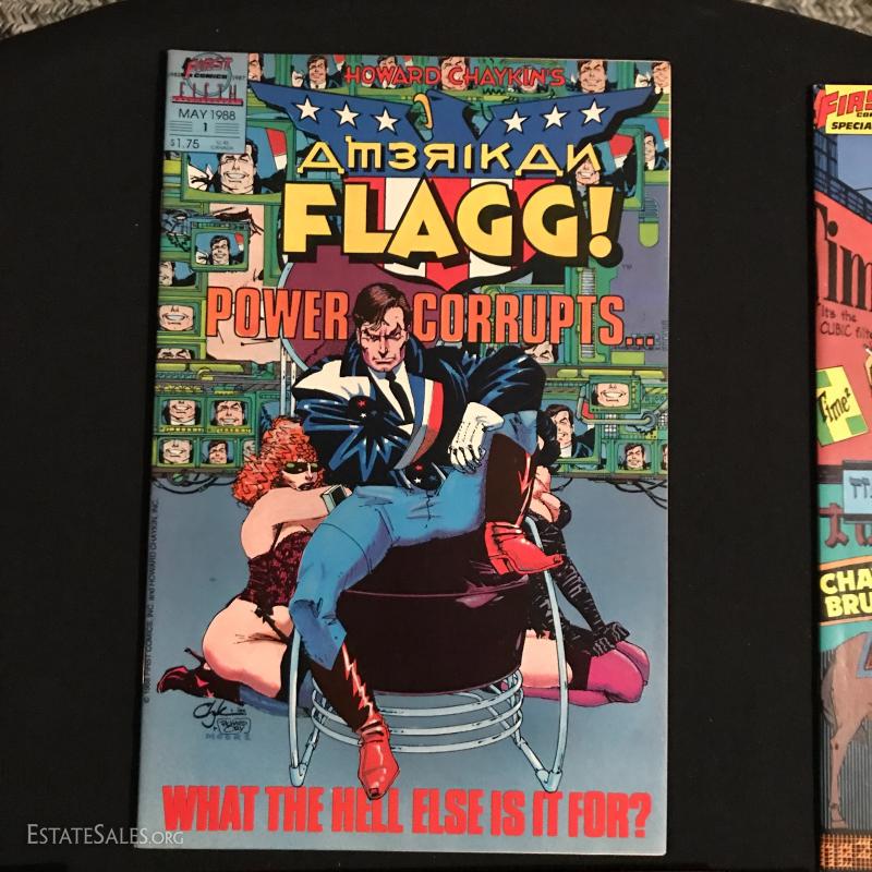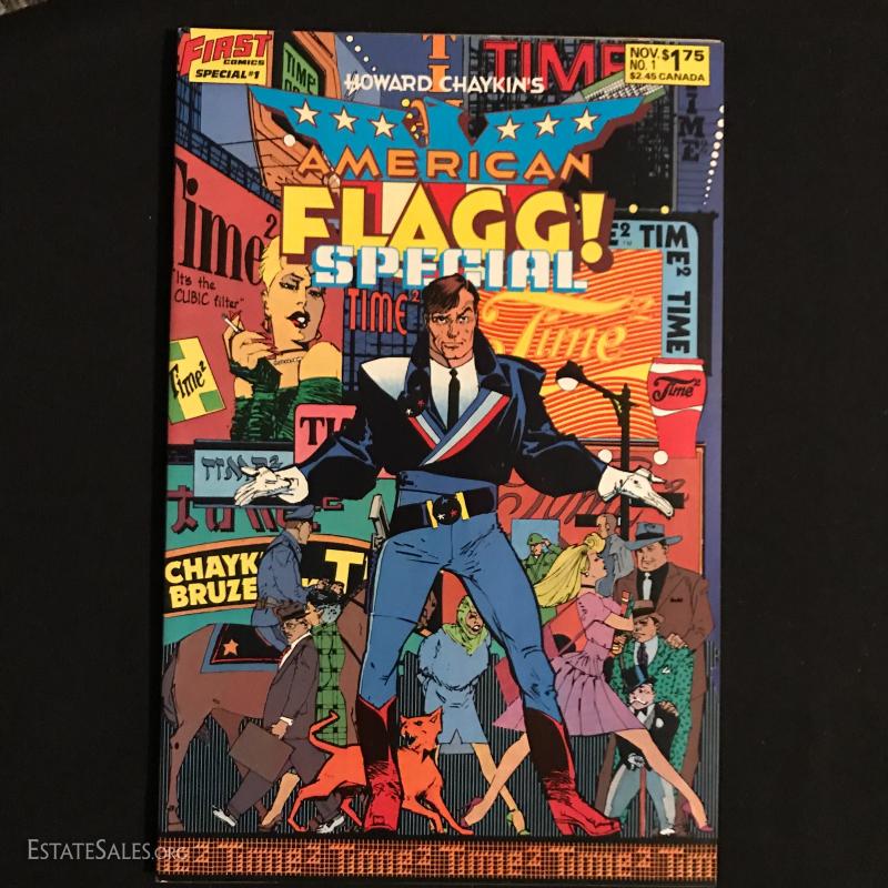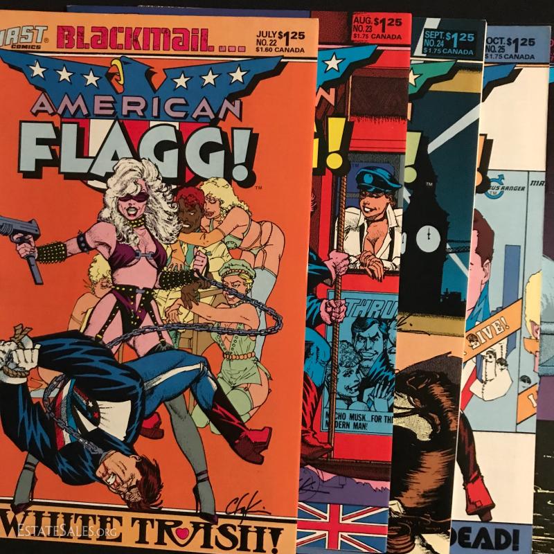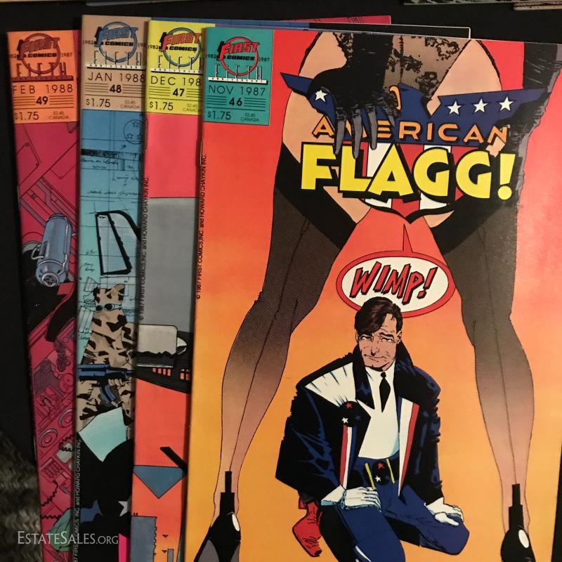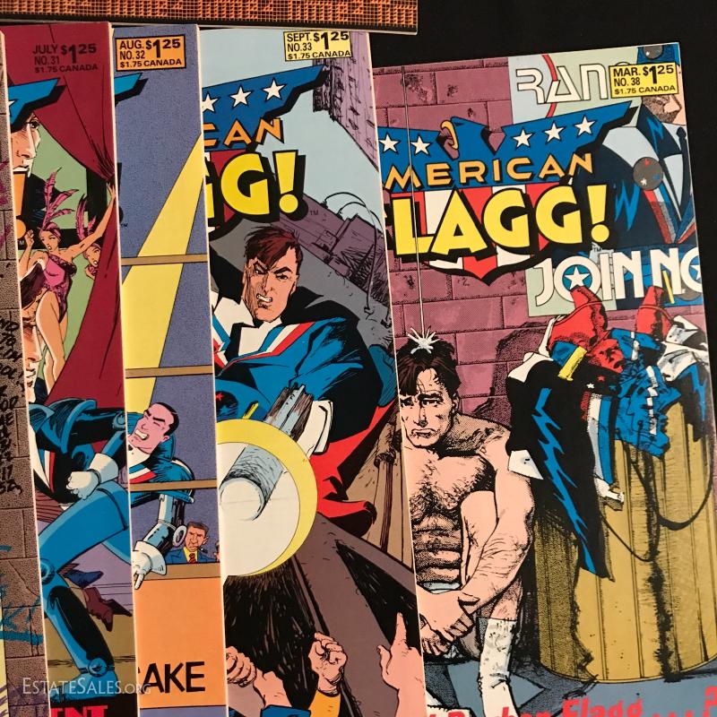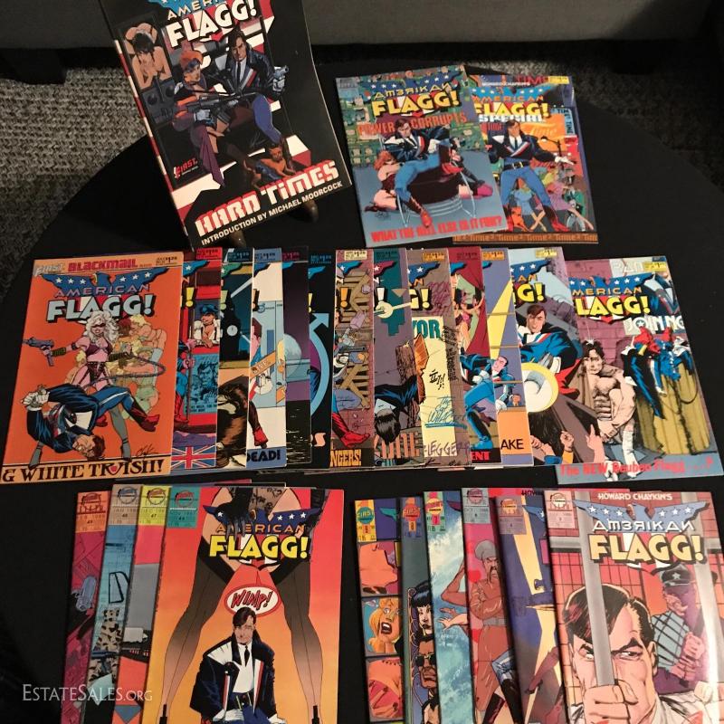 Total of 36 issues. "American Flagg" published by First Comics Inc., by Howard Chaykins Vol 1, 1985 to 1988. Some missing issues. Also includes "American Flagg Hard Times" Book by Howard Chaykin. Lot also includes "Atari Force" by DC Comics Issues from 1984 to 1986. Some missing issues. Shipping in one Priority Box or local pick up in Asheville, NC.