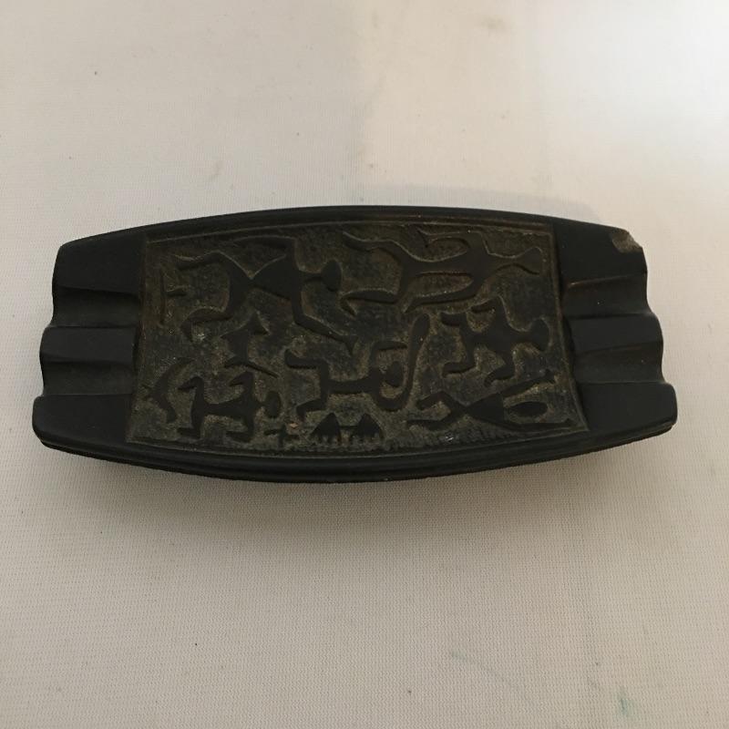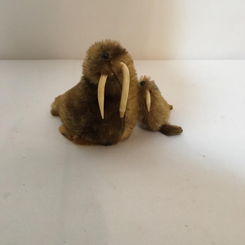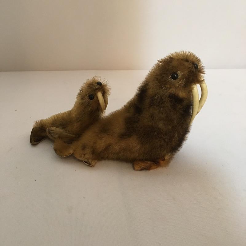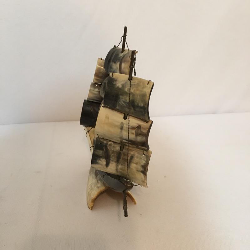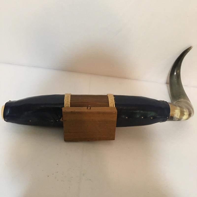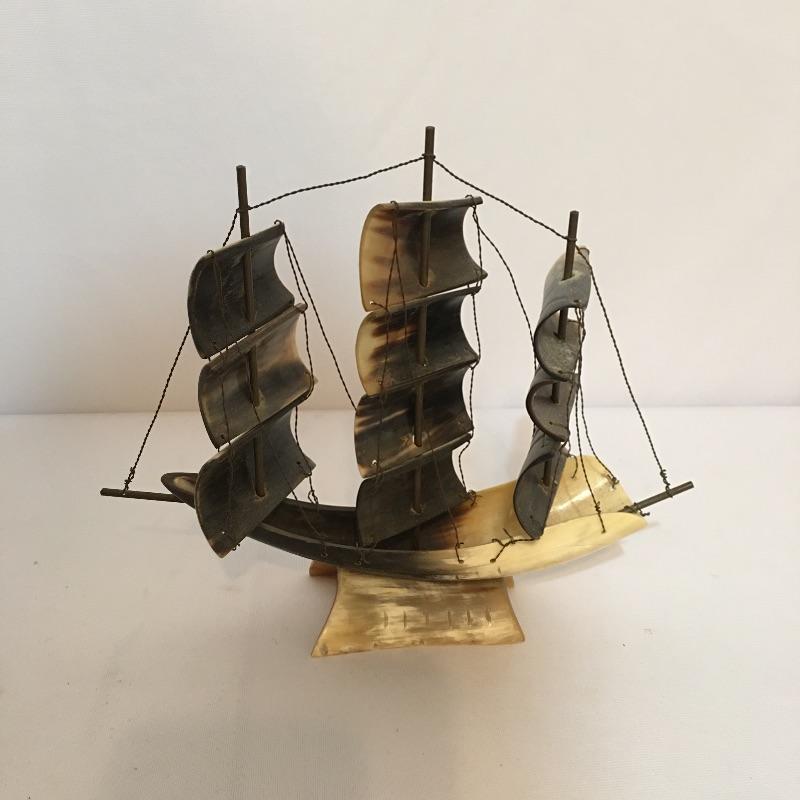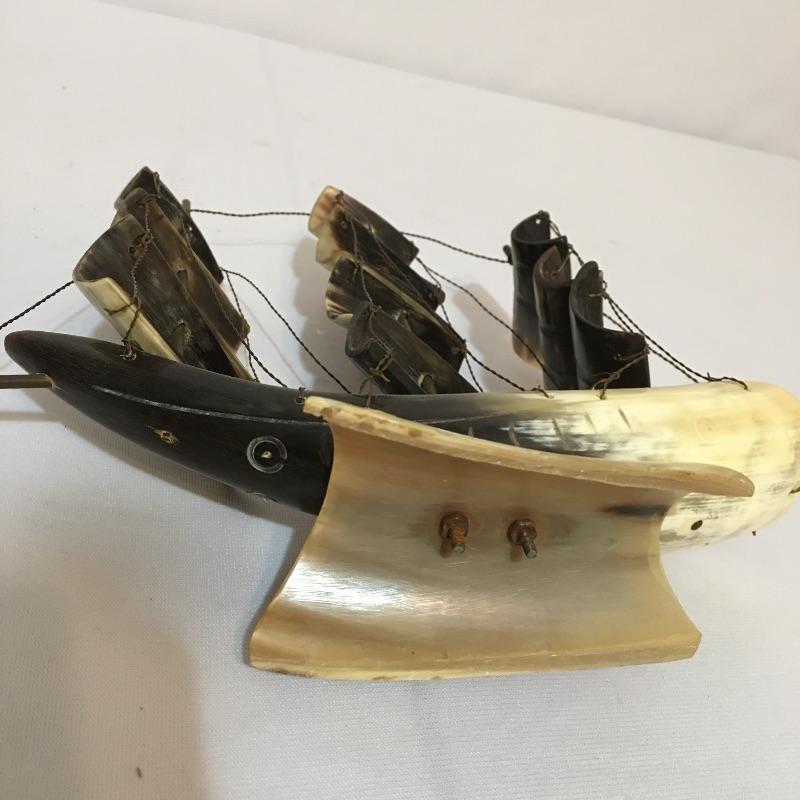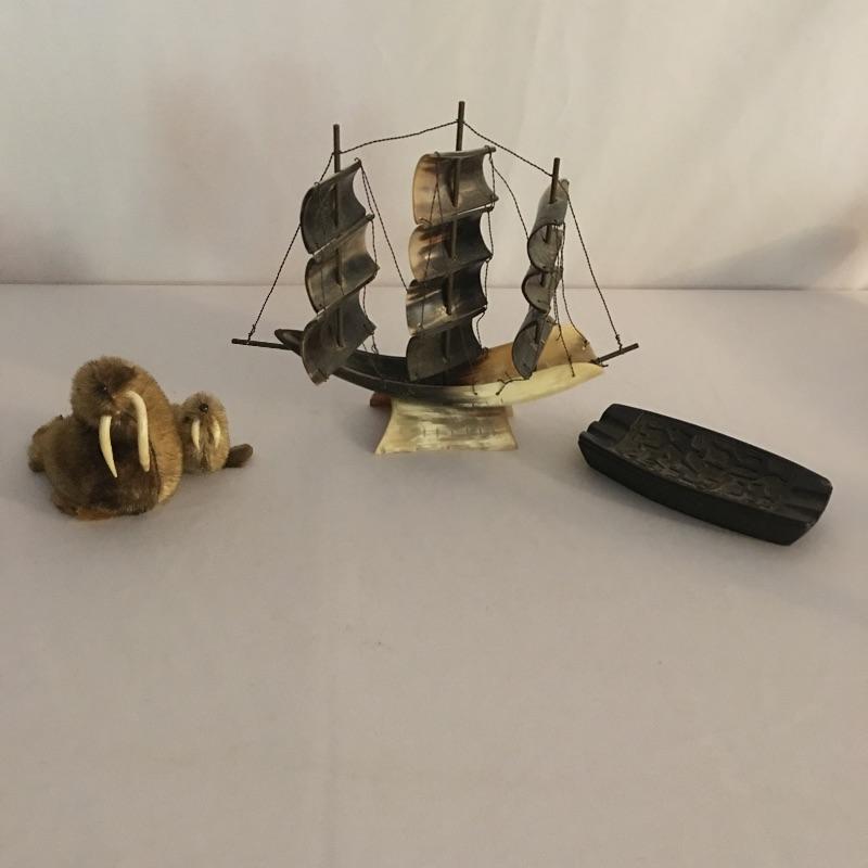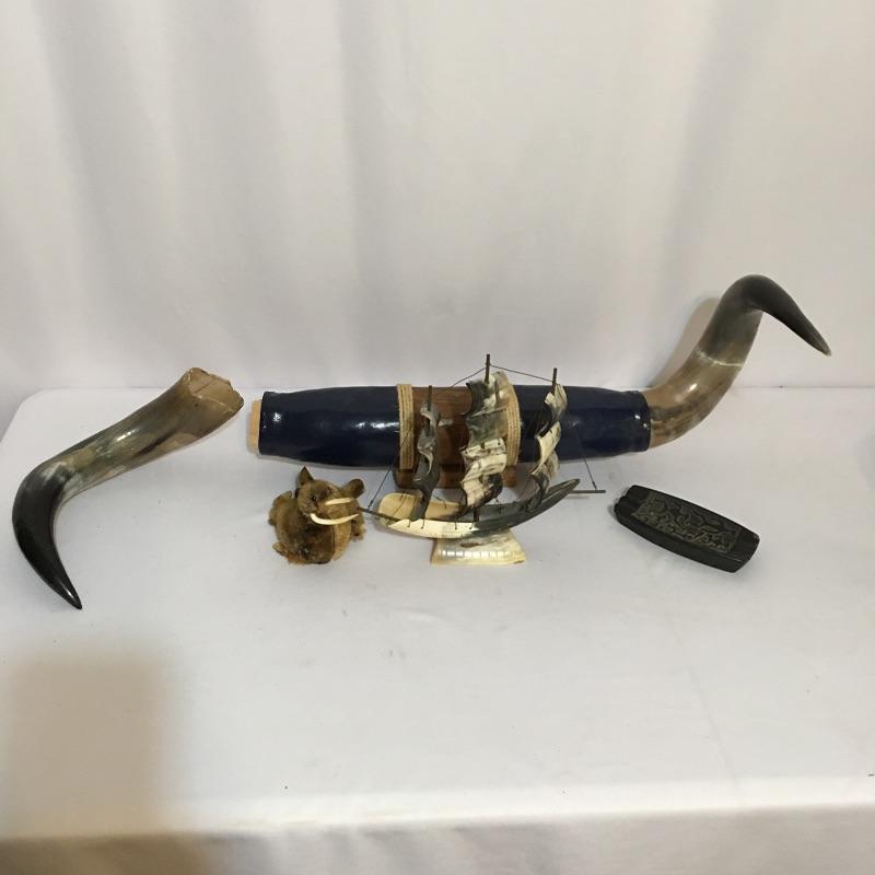 Animal themed decor. Lot includes sailing ship made from animal horn, ashtray made from lava, two small walruses from Alaska and a mounted cow horn that has come apart, see pictures.
