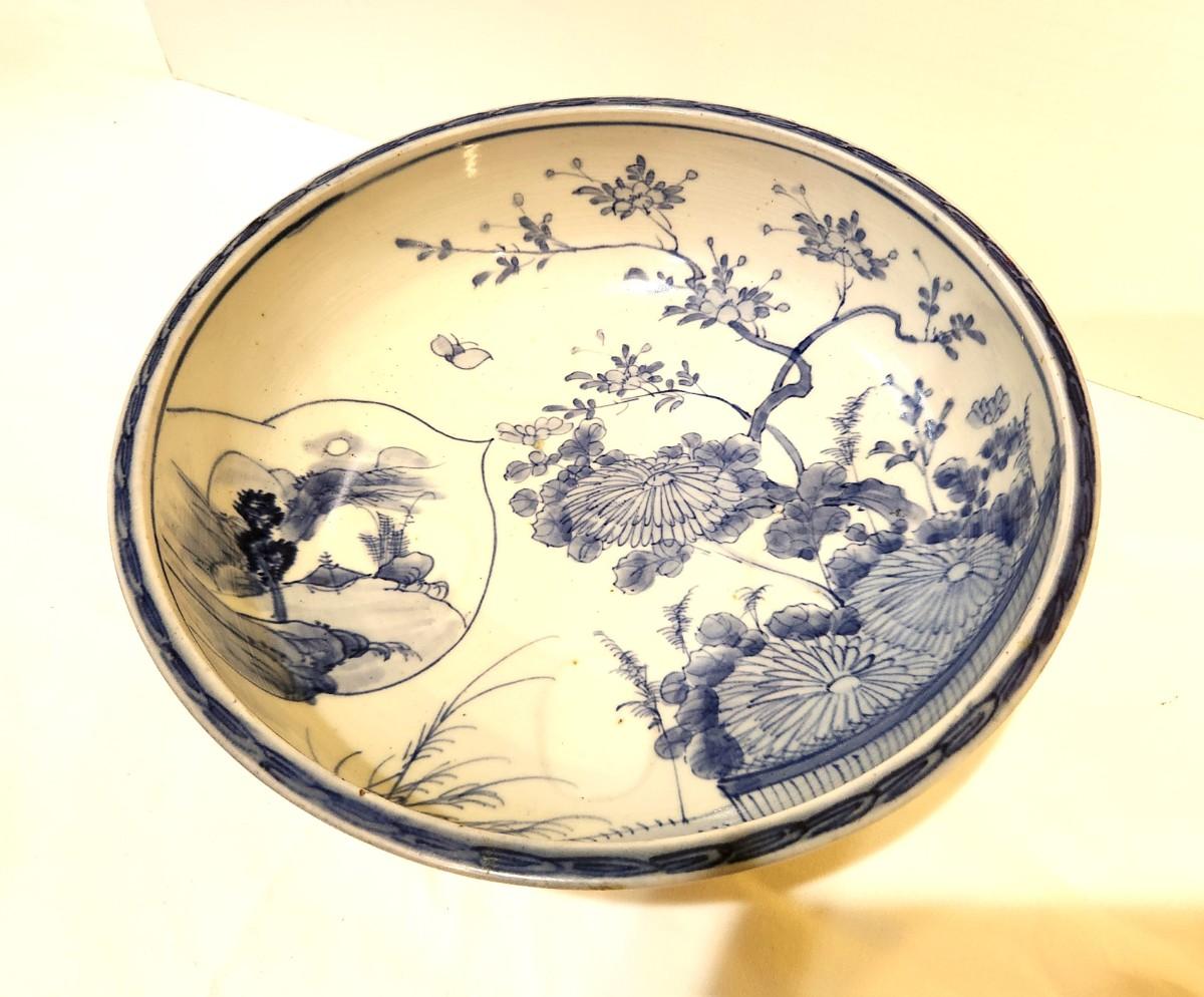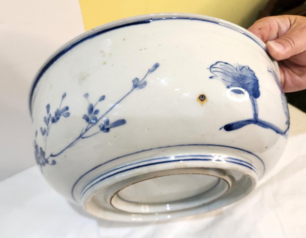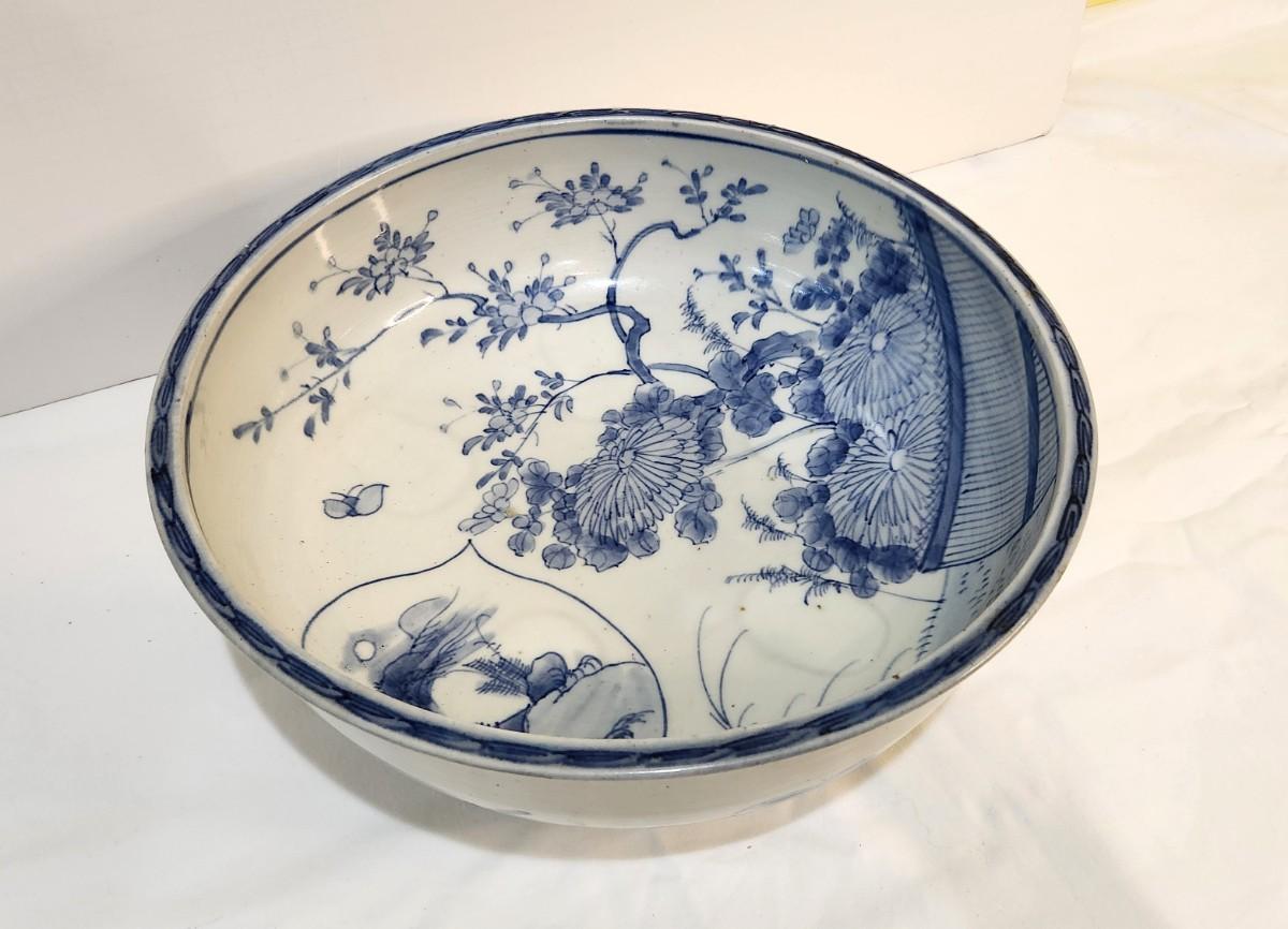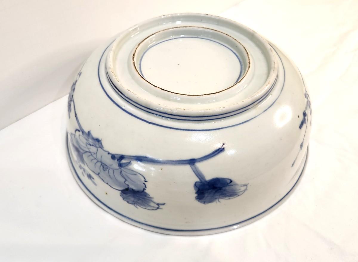 Charming antique Chinese blue/white bowl - chrysanthemums - 4.5" tall, 12" across, antique condition. Probably early 20th century.