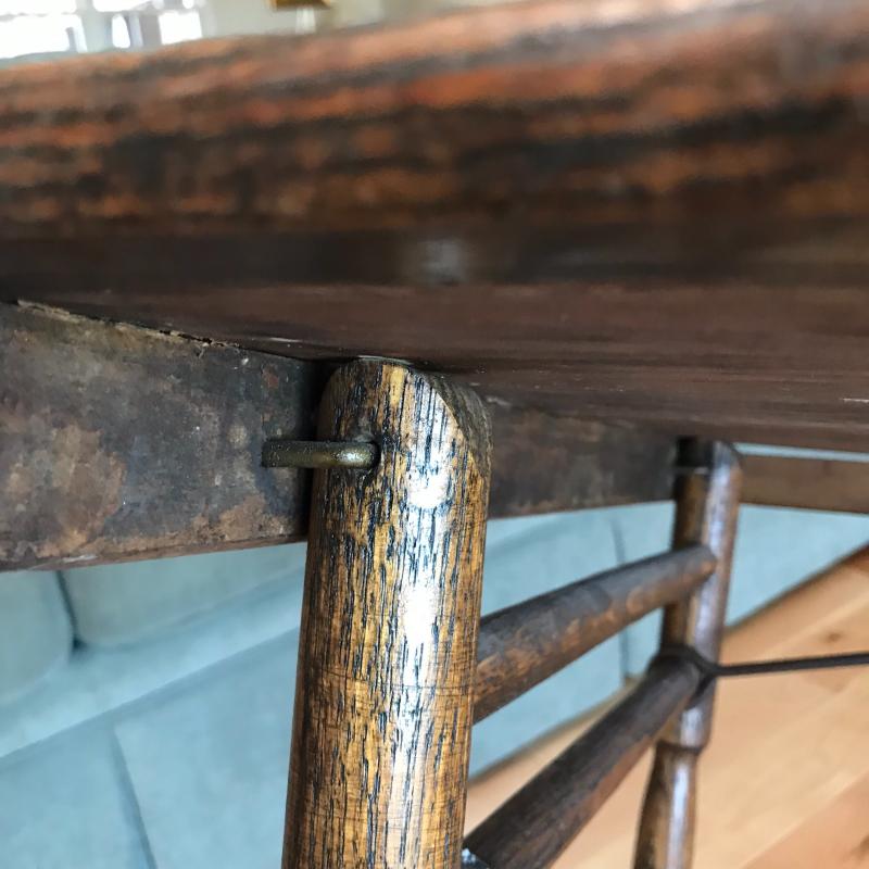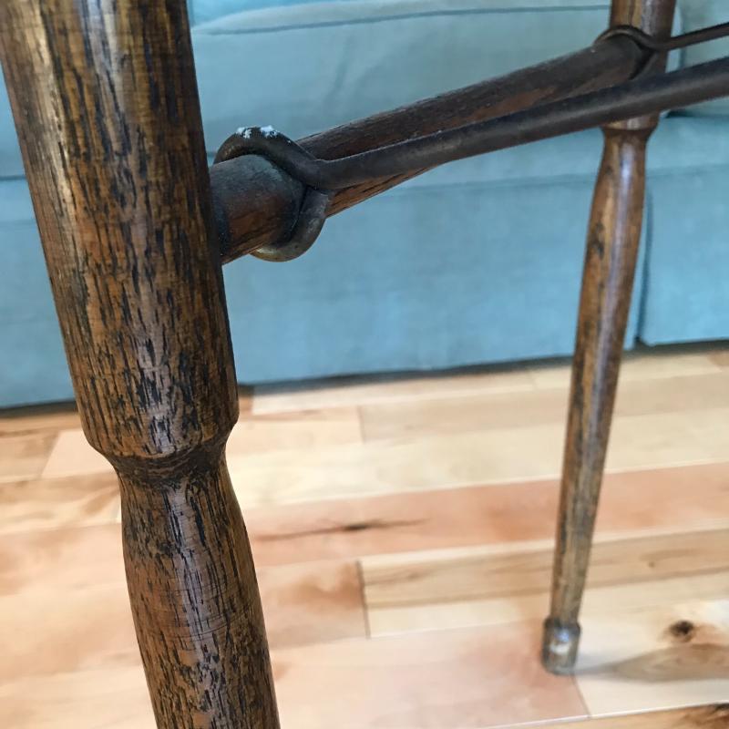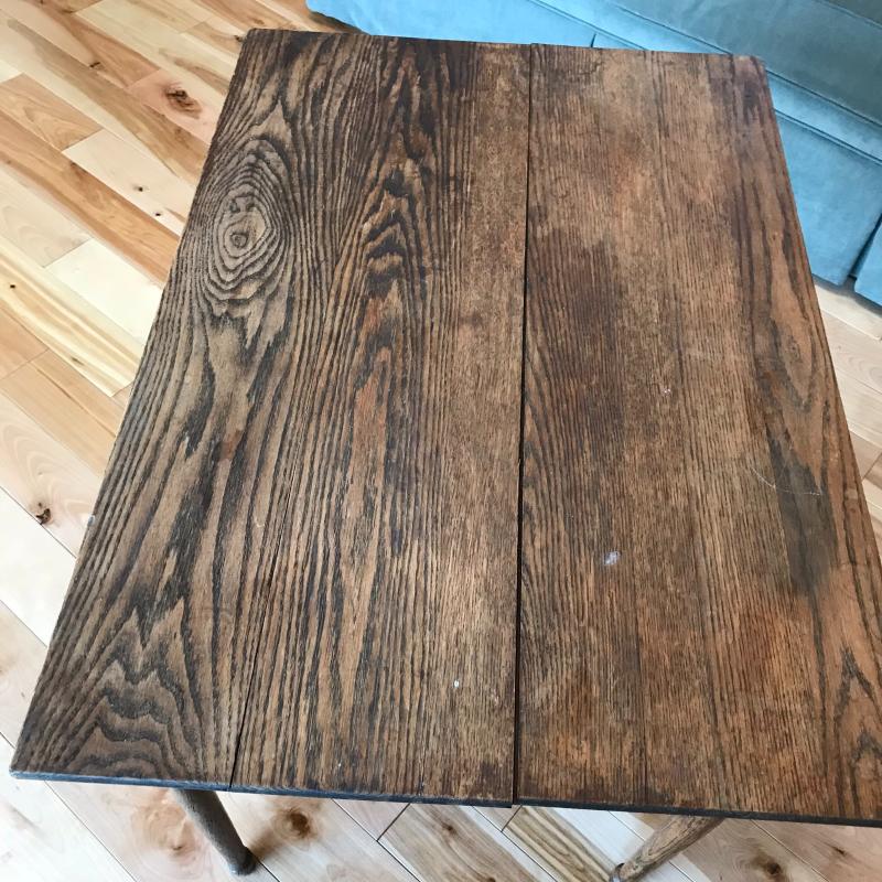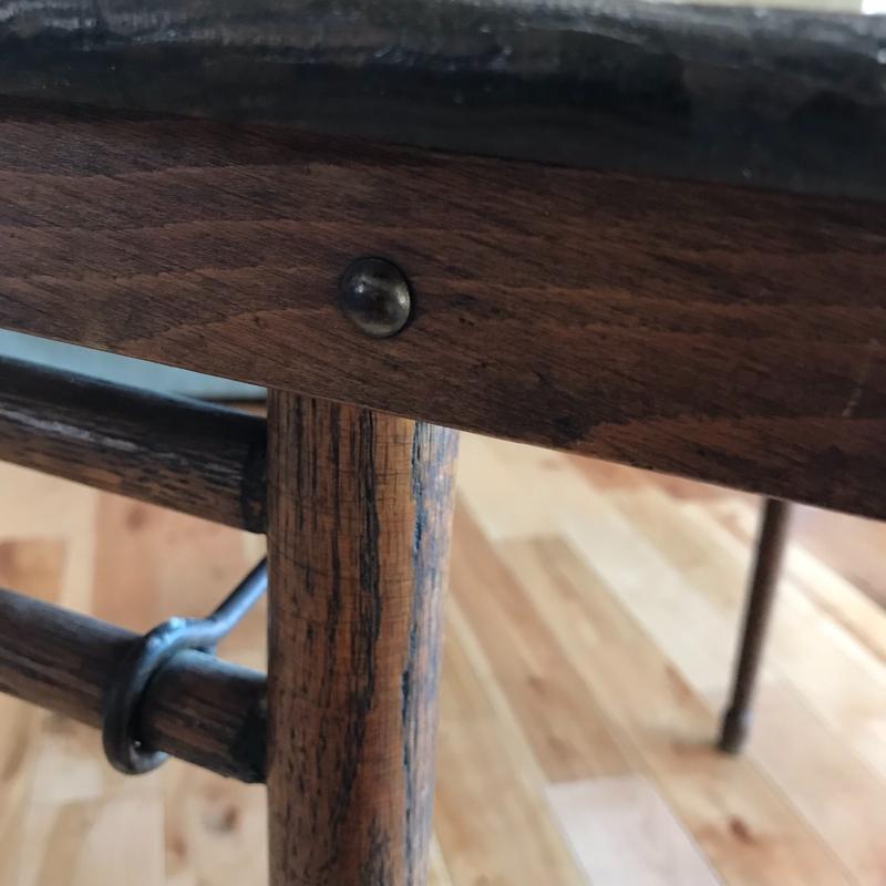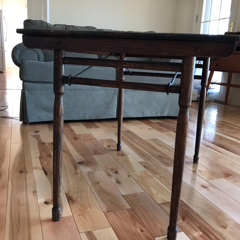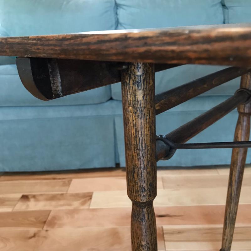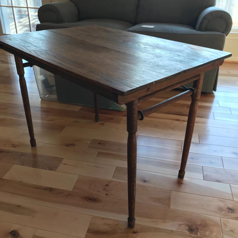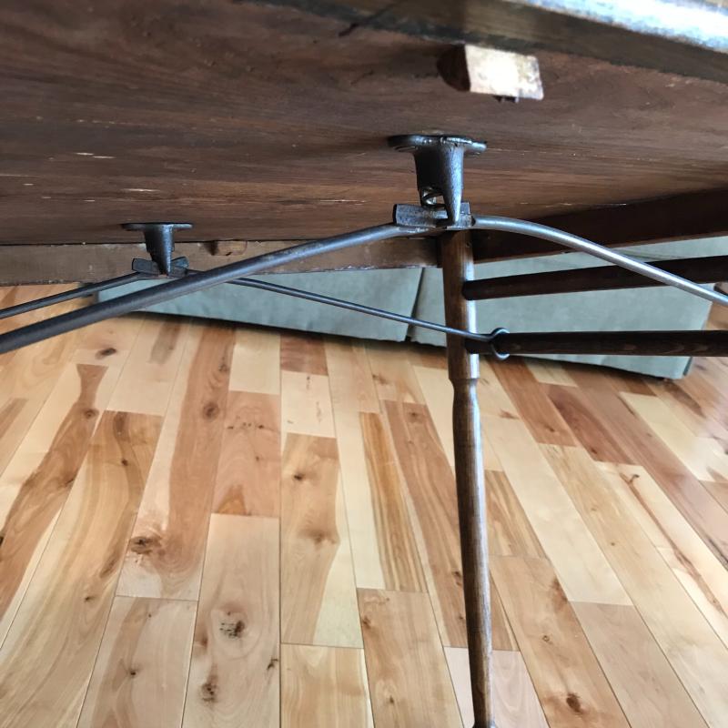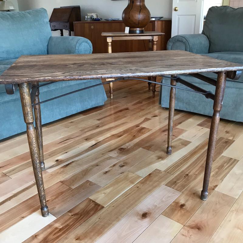 Antique side table with iron hardware. Has one side piece missing on underside. 34”l x24”w x 24”h. No Shipping available. Only local pick up in Asheville, NC.