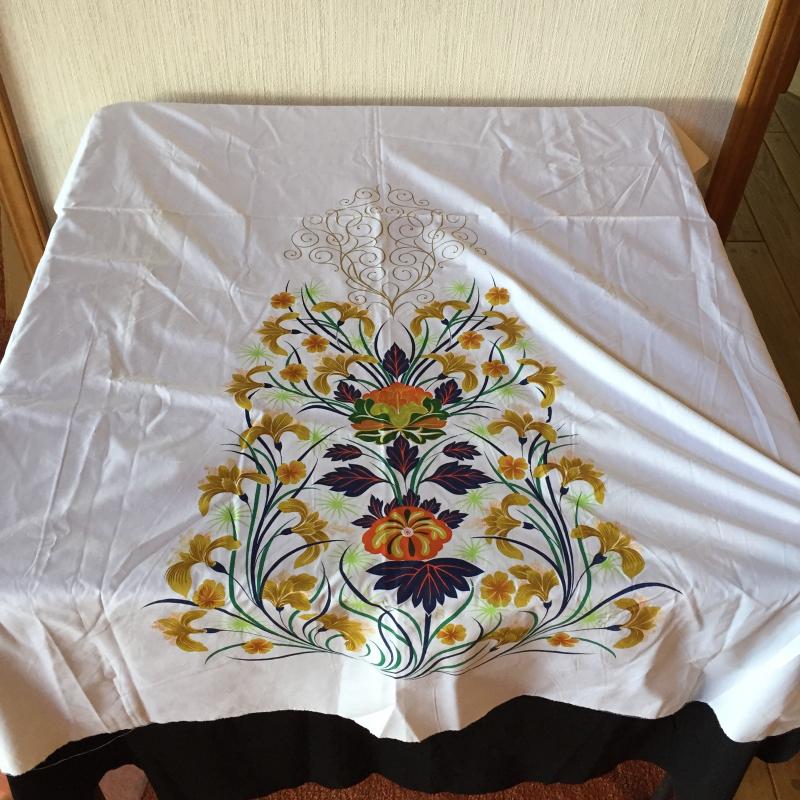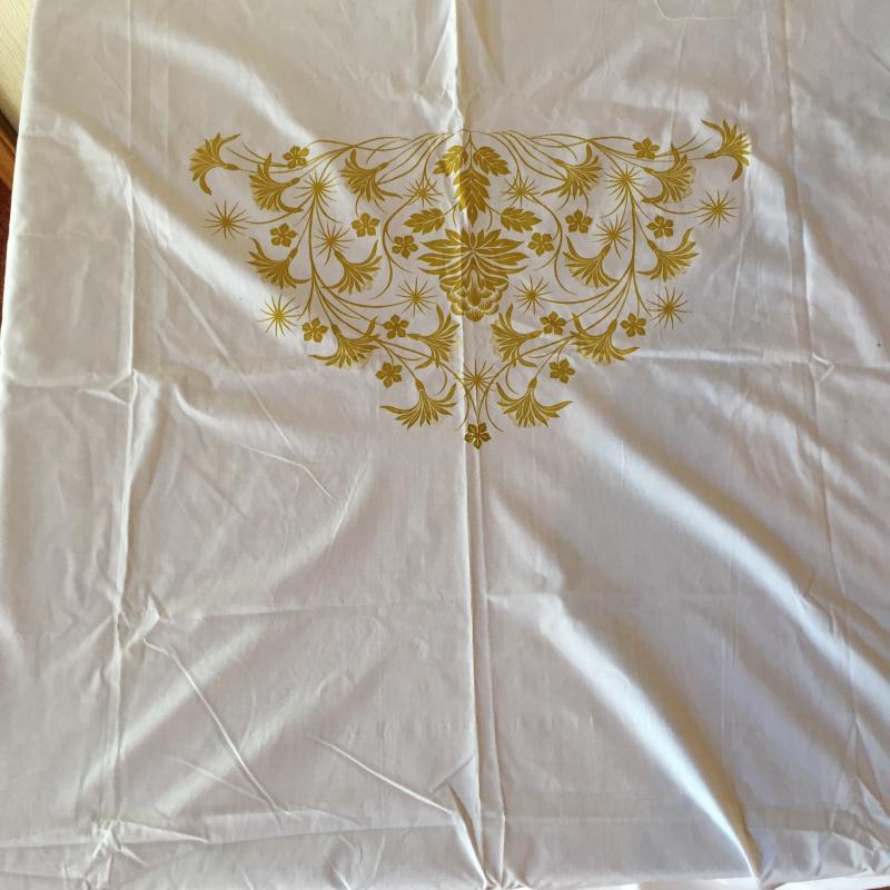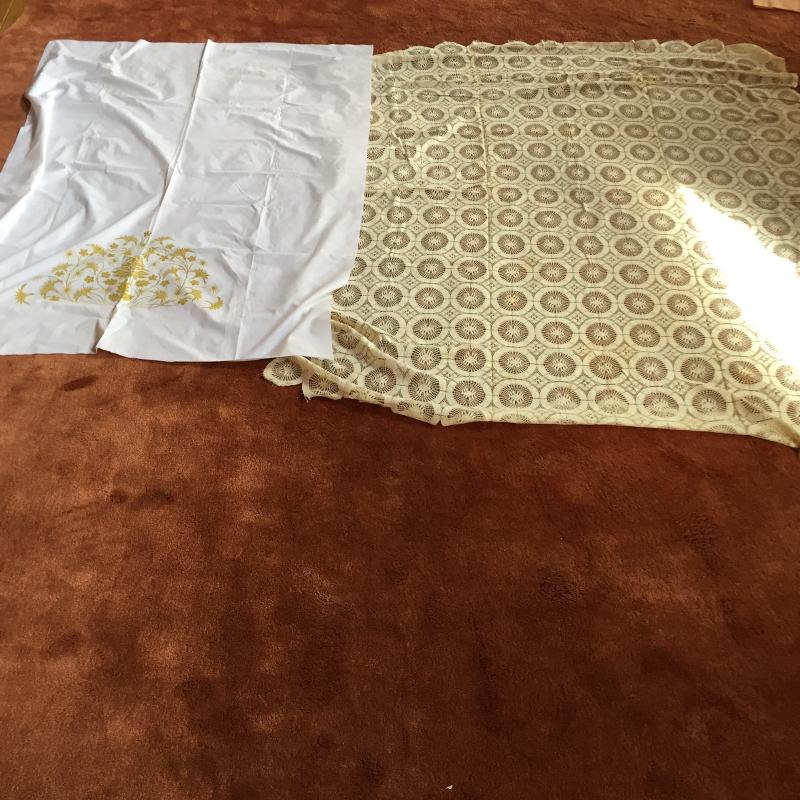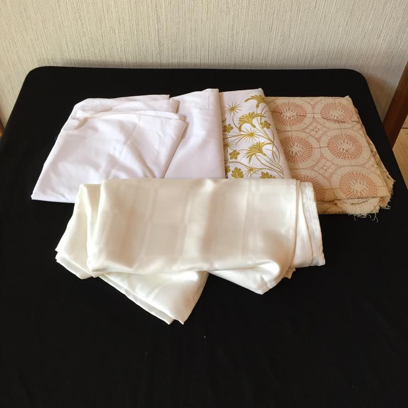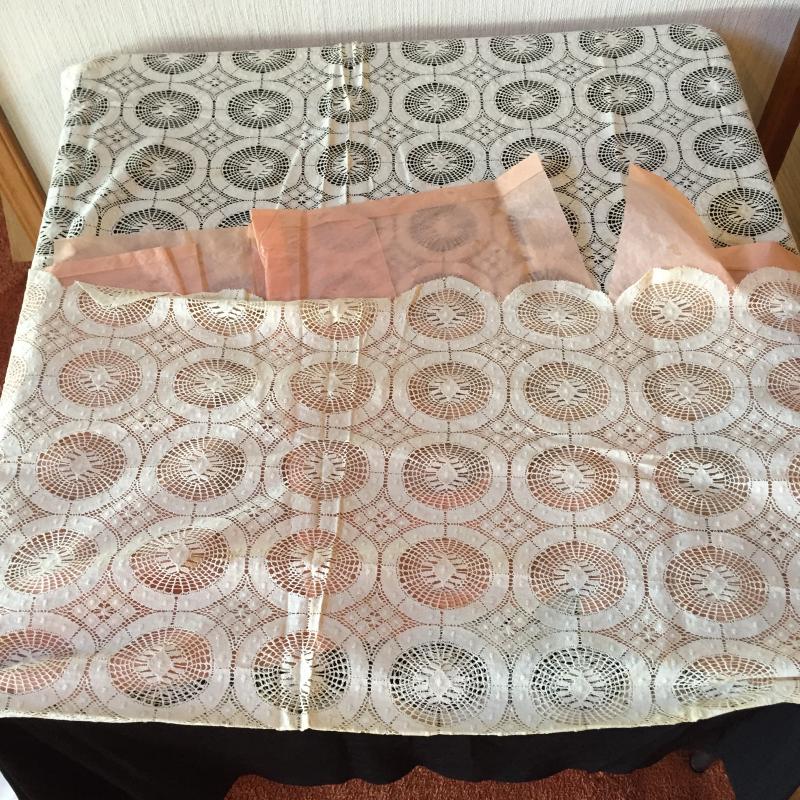 Delightful array of Fabric and table overlays. Fabric with designs Measure 62” x 42”. One has Stains-See pictures. Shipping available.
