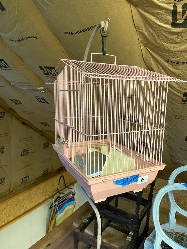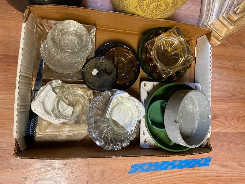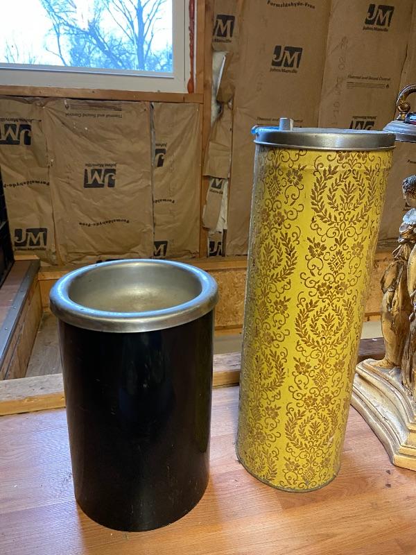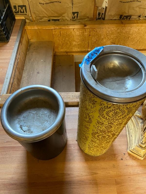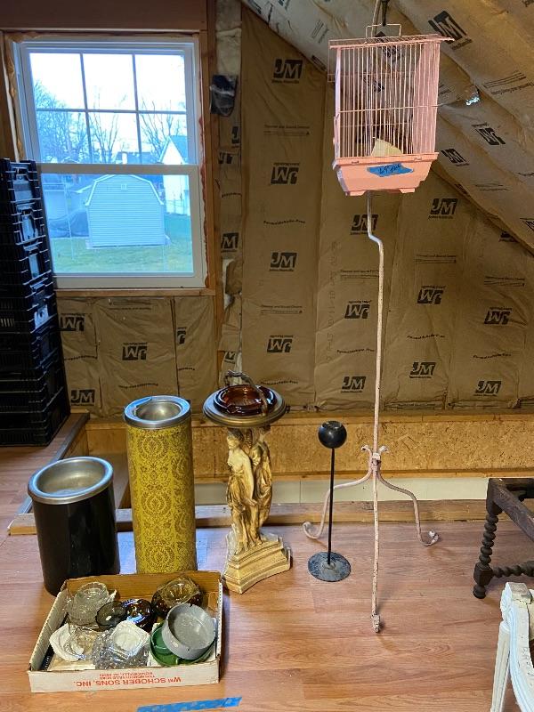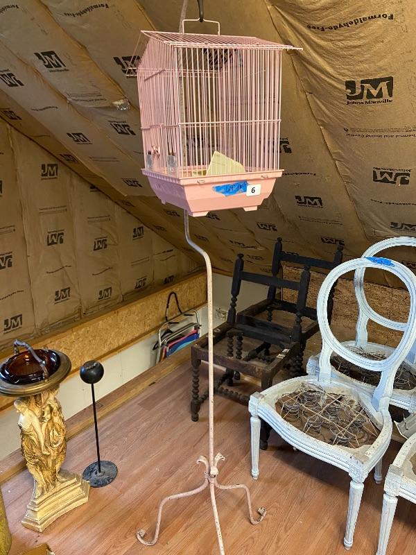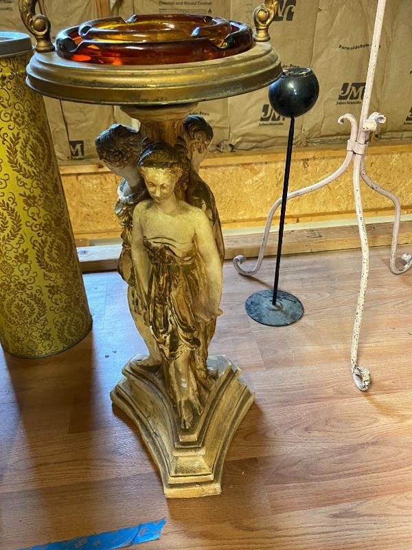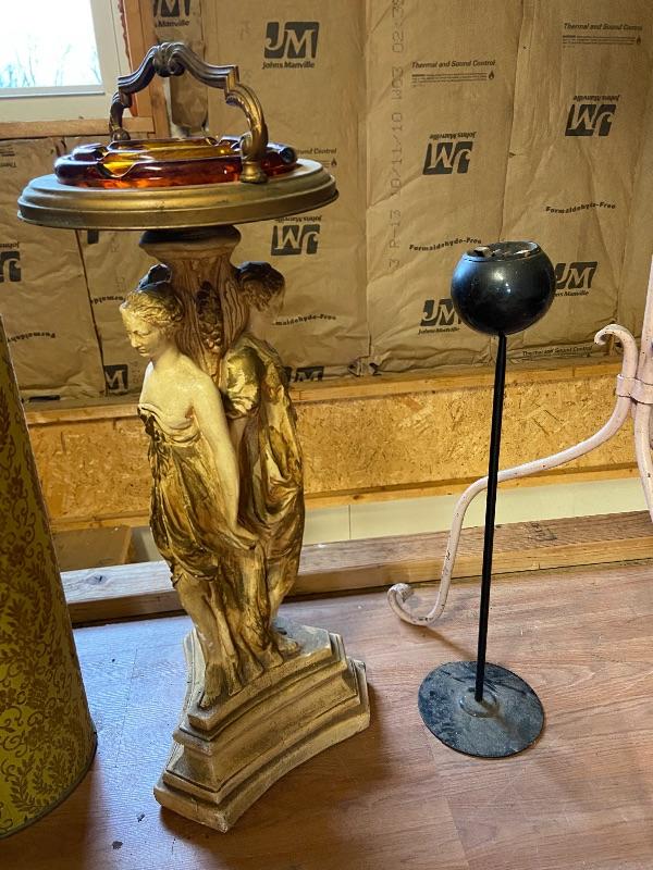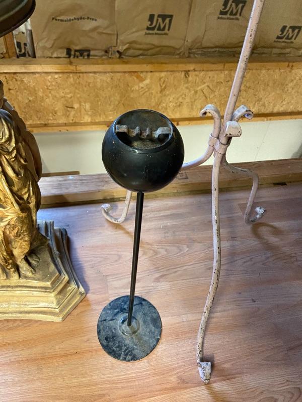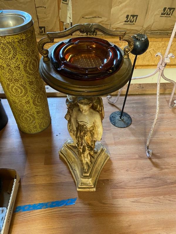 Vintage floor ashtrays, box of ashtrays, and bird cage on a wrought iron stand.