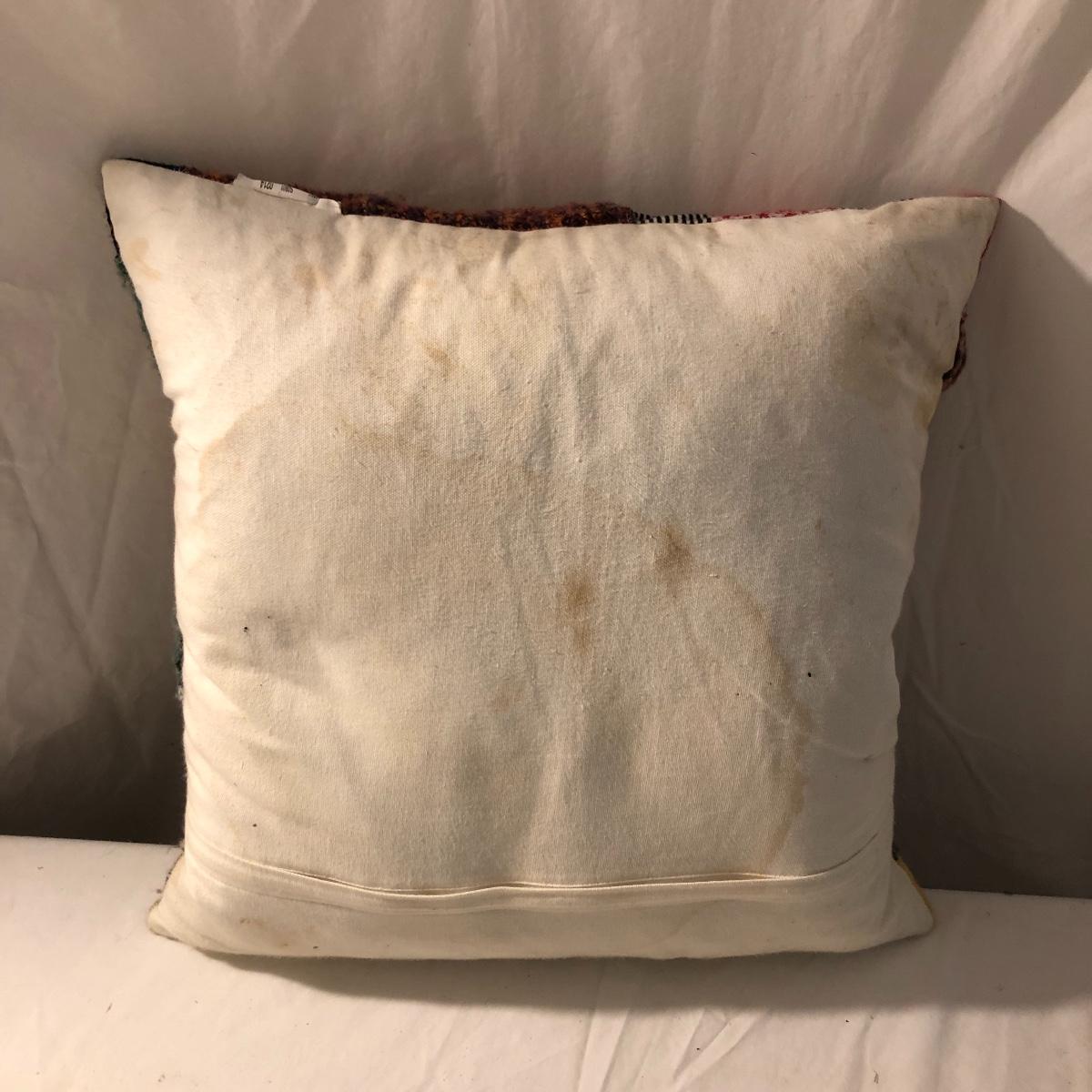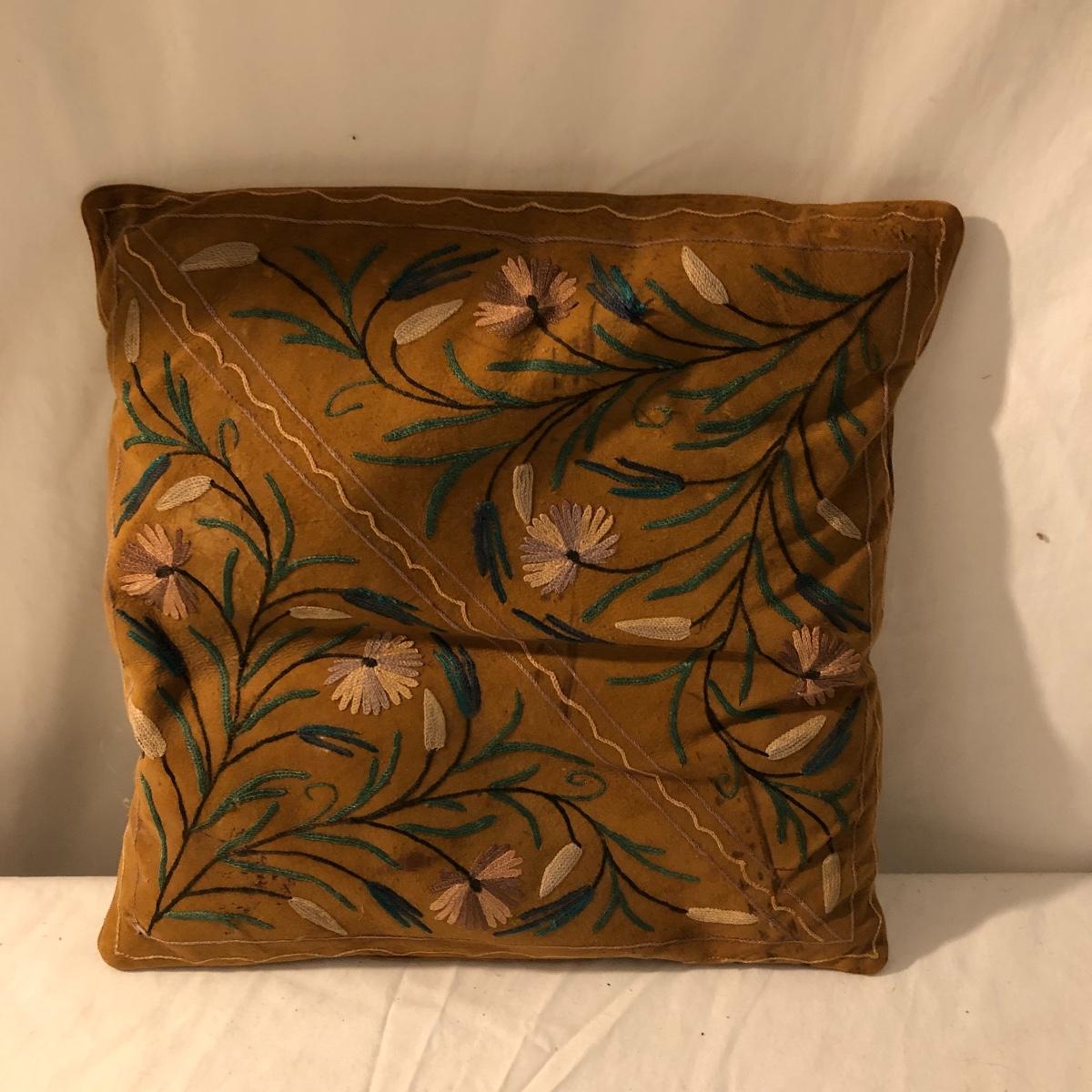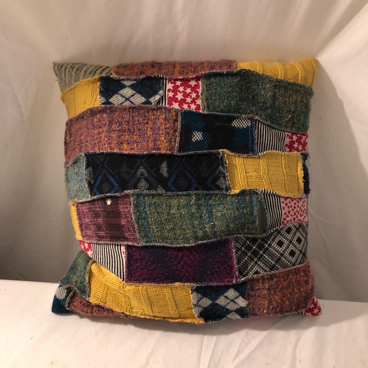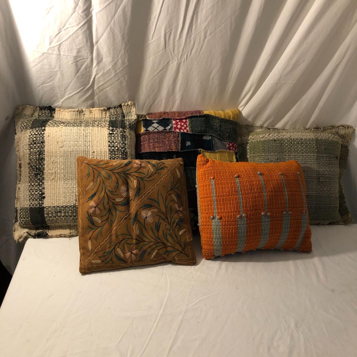 This collection can be used anywhere to add a splash of color. They appear to be handmade. Brown pillow is suede back with fabric front, one is a patchwork style and the other three are woven. Patchwork pillow has a few holes and is a little stained on back, see pictures