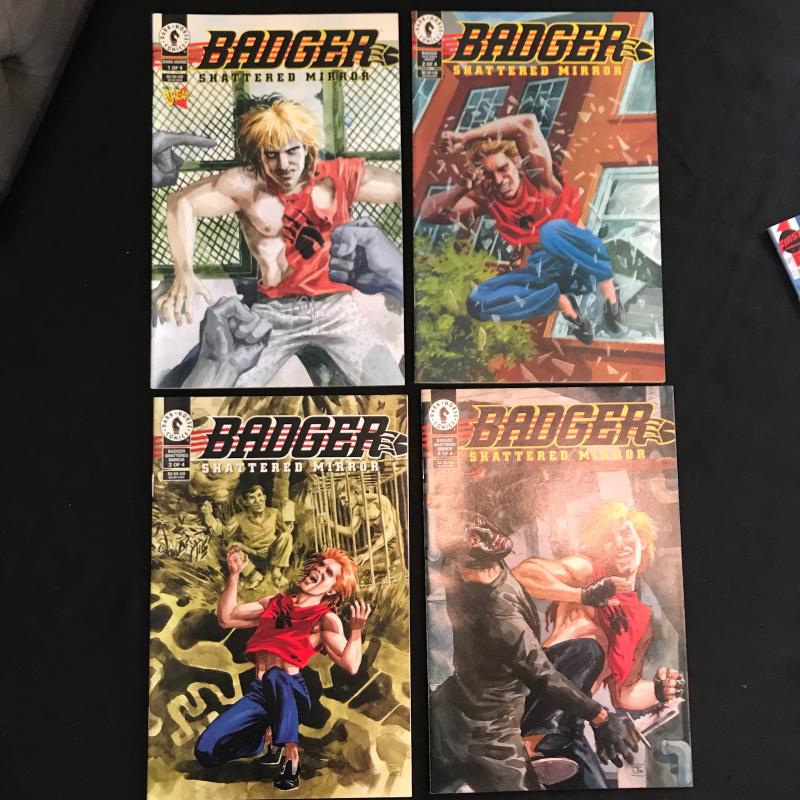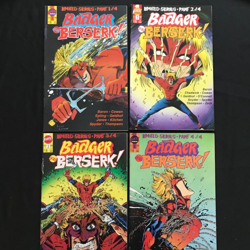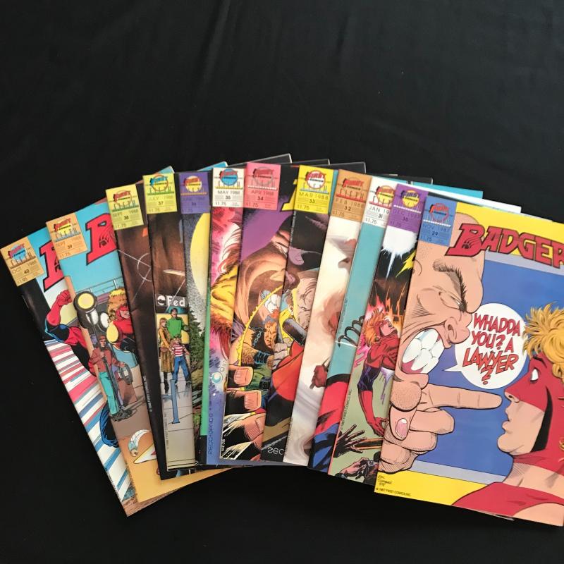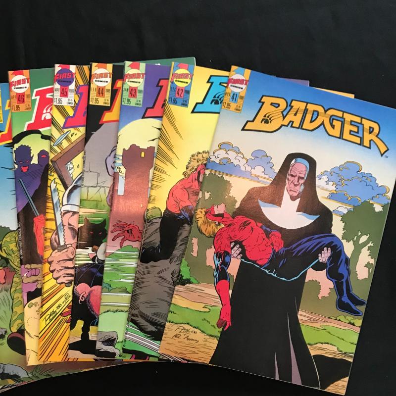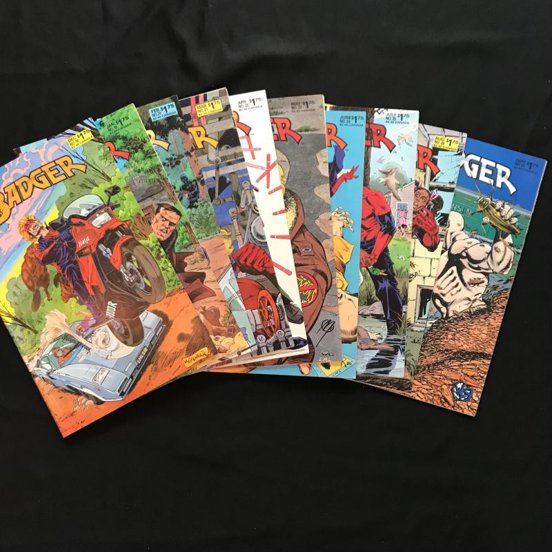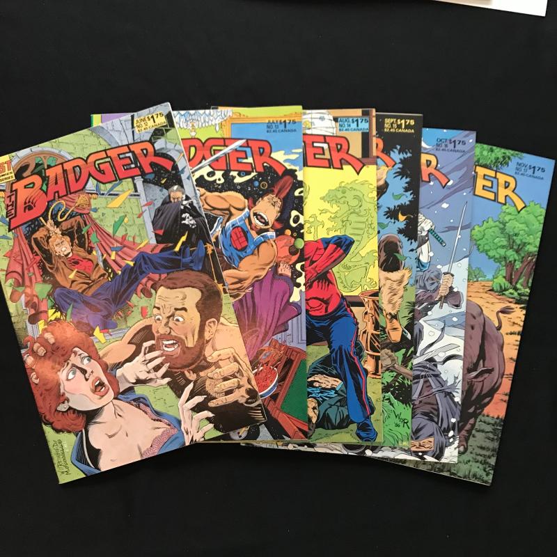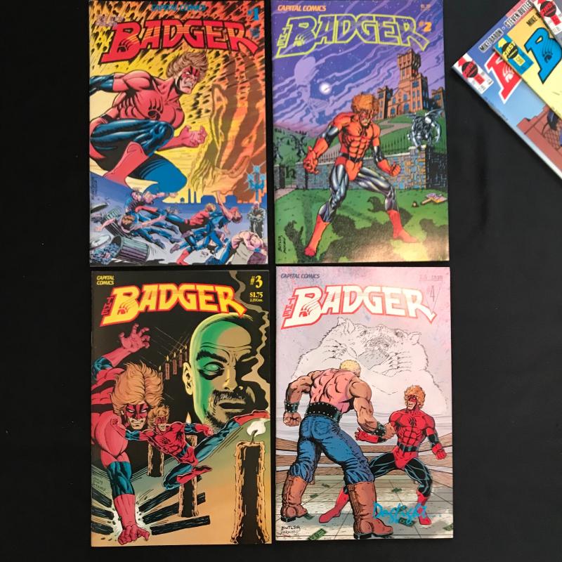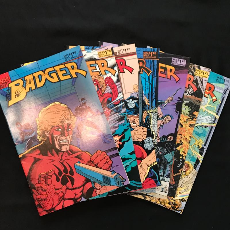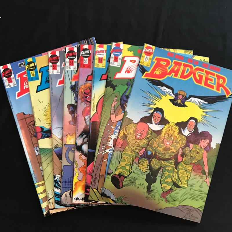 "Badger" by Capital Comics, Dark Horse Comics and First Comics. 61 issues total. Vol 1, No 1, 1983 to No 4 published by Capital Publications. A series of four issues called "Badger Shattered Mirror" was published by Dark Horse Comics in 1994, A series of Four called "Badger Goes Berserk." All other Issues in Lot by First Comics starting from 1985. Shipping available in one Priority Box or local pick up in Asheville, NC.