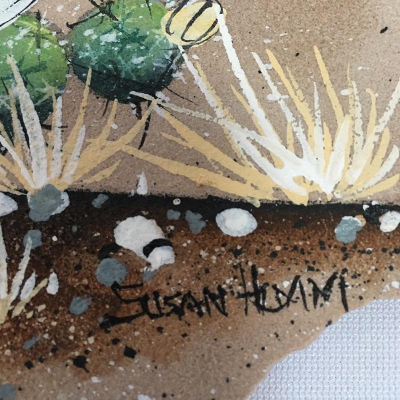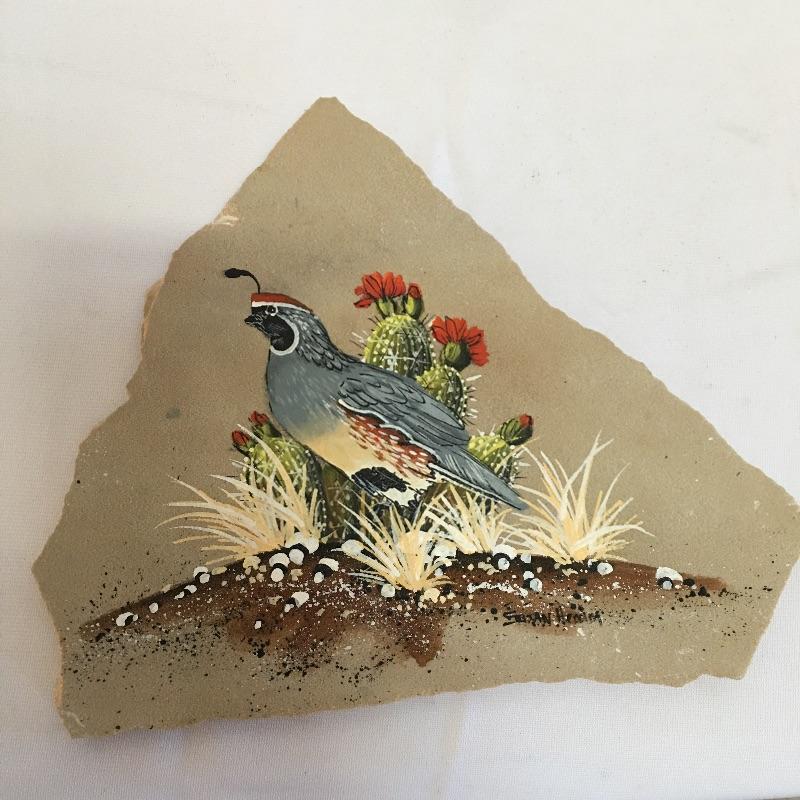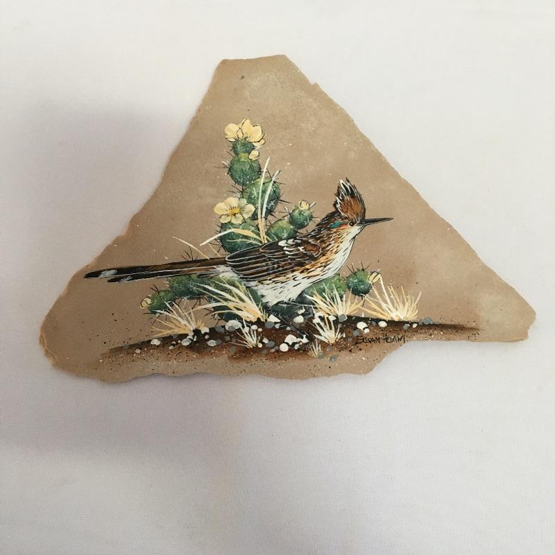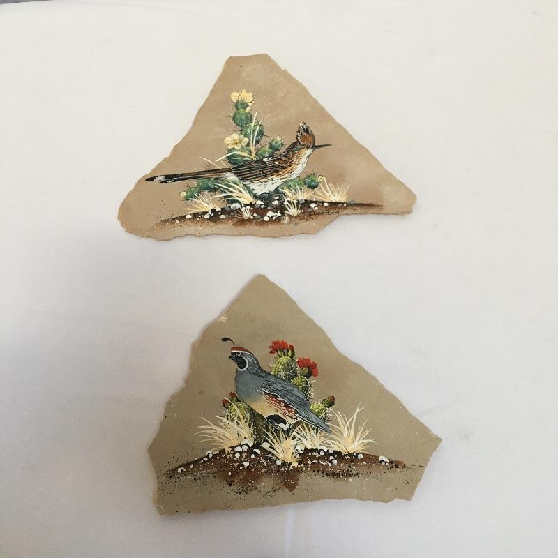 Bird artwork on Sandstone includes a pair of signed pieces by Susan Hemm. Don’t miss out these unique pieces of artwork with all there bold colors. Largest piece measures 8” x 12”.