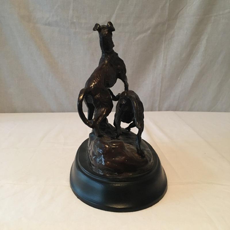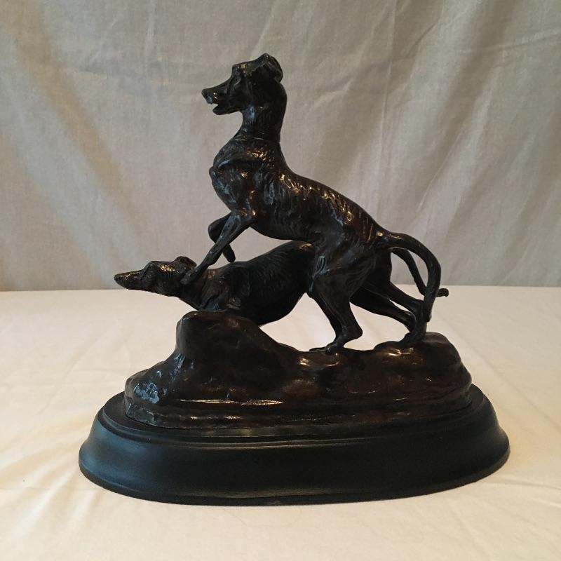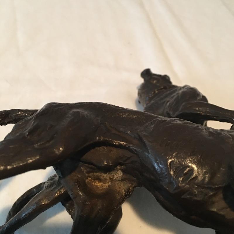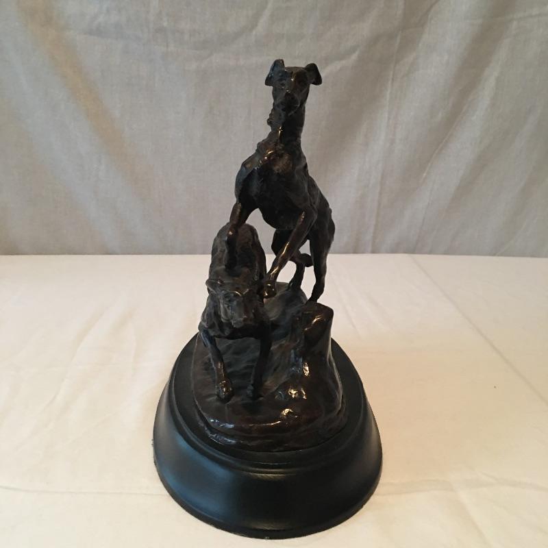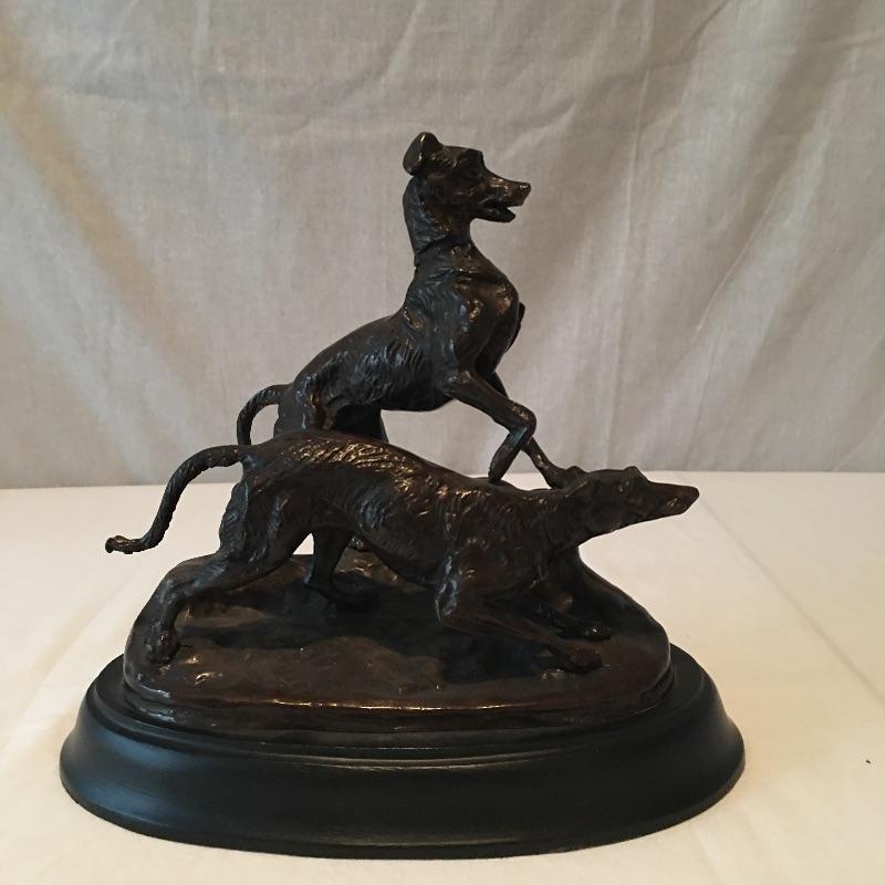 Heavy dog statue that appears to be bronze. Set on a black base. A unique pair of dogs are Made in India that look like they are ready to chase something. Nice and heavy. No signature found. Statue measures 6.5” x 11.5” x 9.5”. Can not verify material.