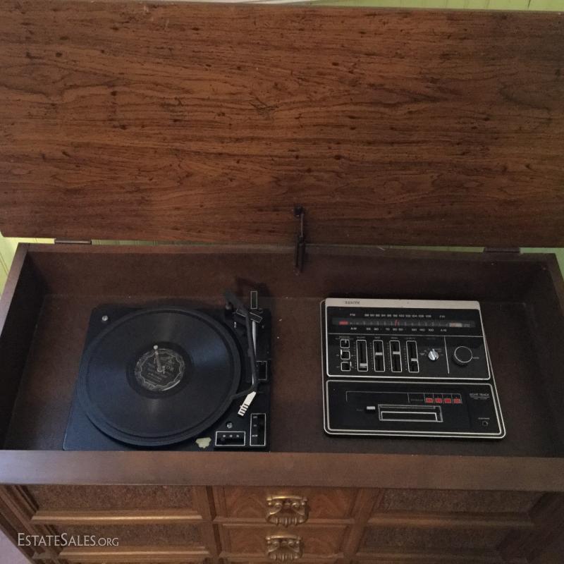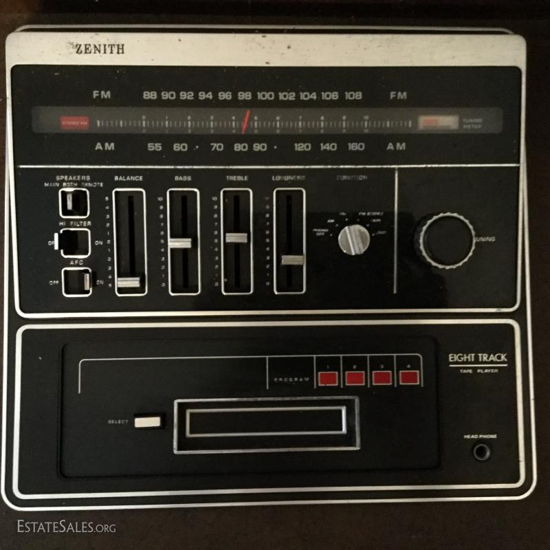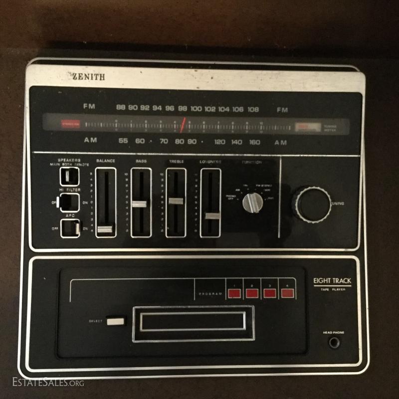 Vintage Zenith Eight Track Tape Player, AM/FM Radio, Diamond Stylus Turntable built in wooden cabinet. Unable to test working condition on this. Some scratches on top.
