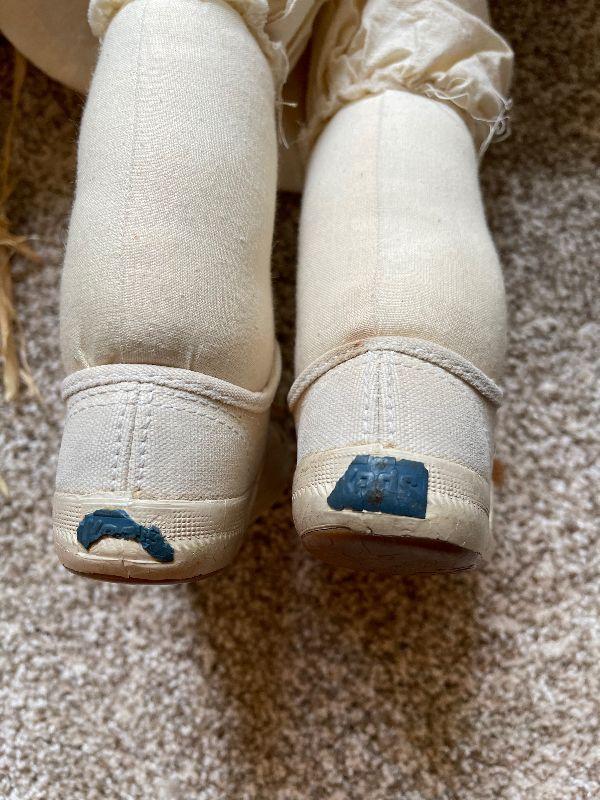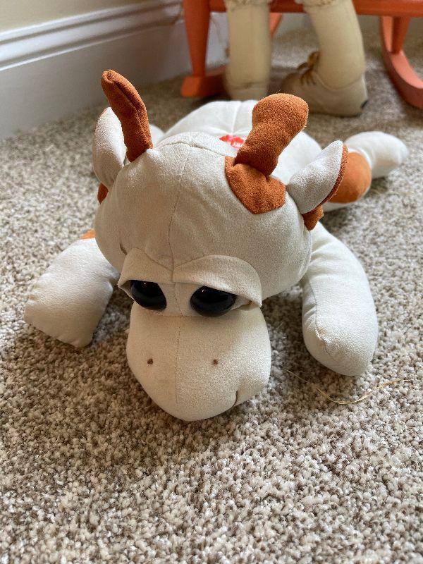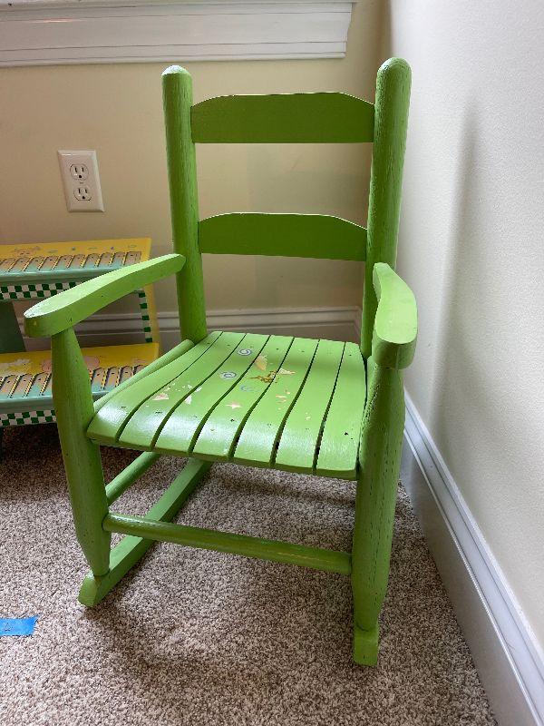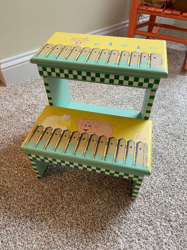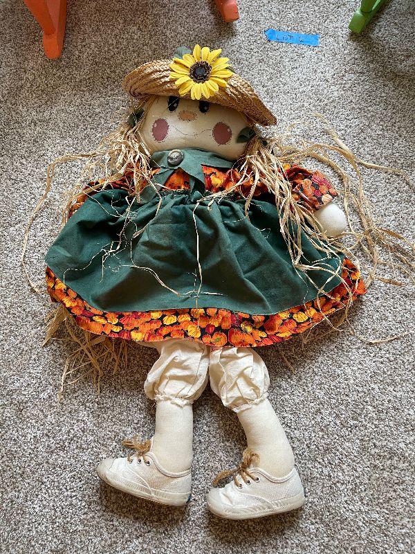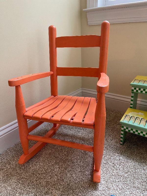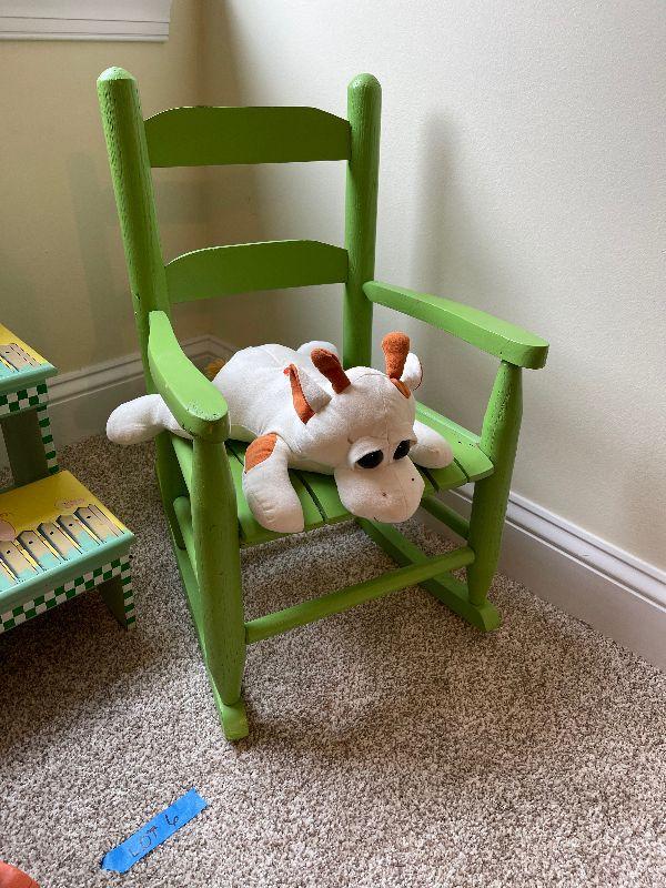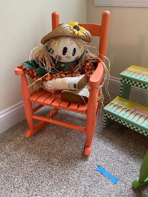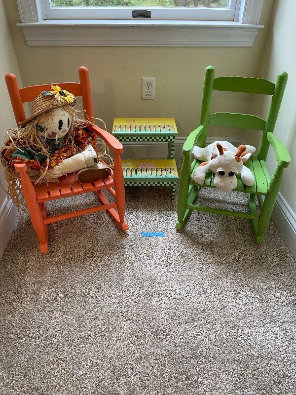 2 Children's Wood Rocking Chairs, Step Stool, Vintage Scarecrow Doll and a Stuffed Cow that Makes Noise.