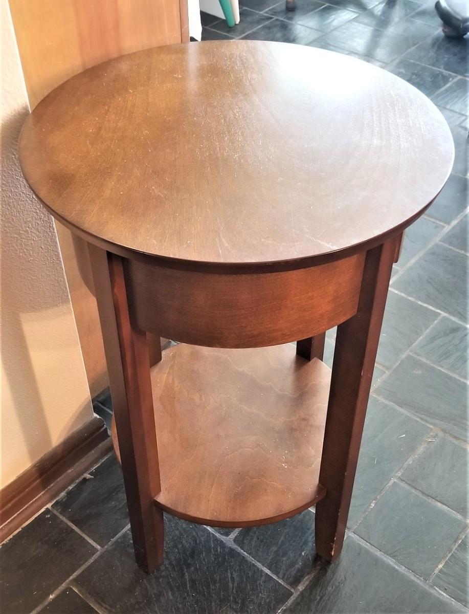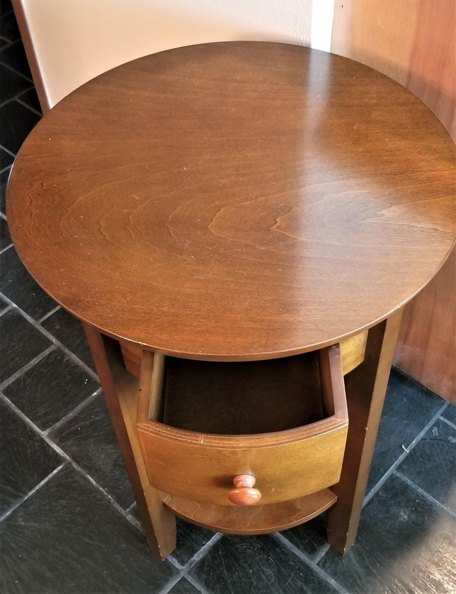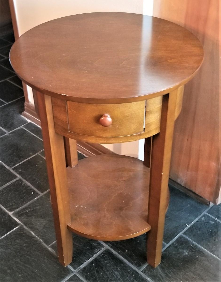 Cute decorative table - round - with drawer. No maker noted. Good condition. 20" across, 28" tall. A versatile piece. Haw good weight to it.