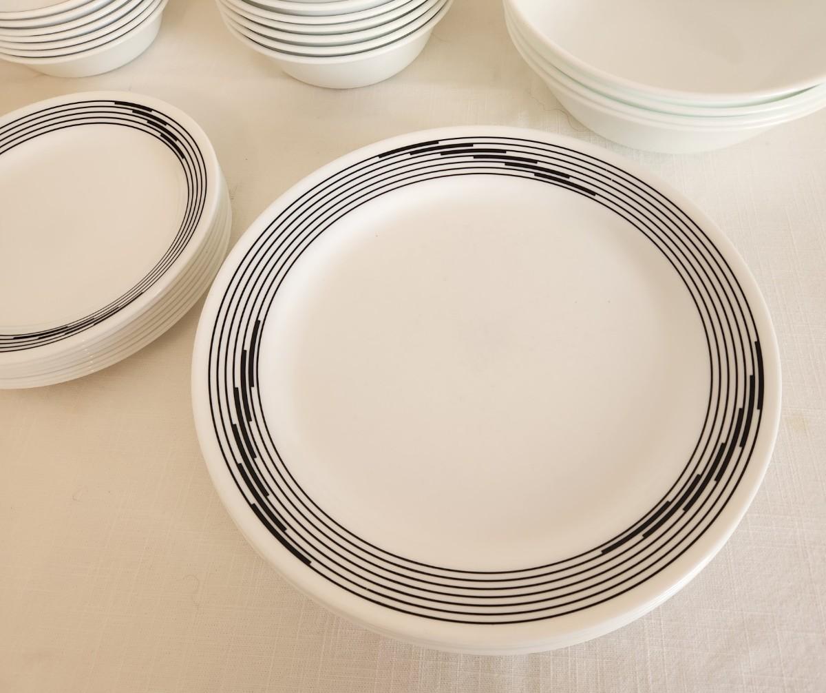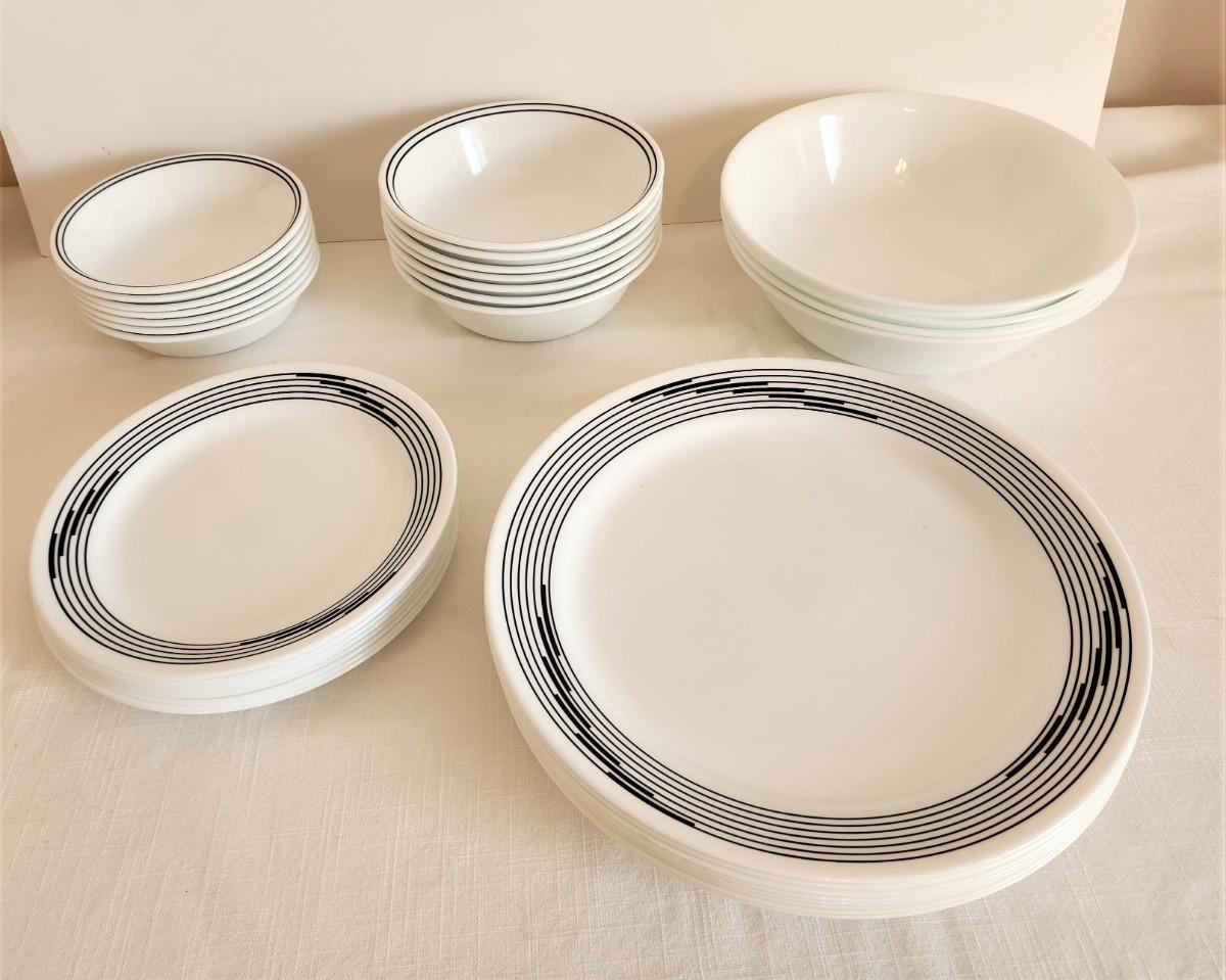 You get all you see here - CORELLE set from the late 70's/early 80's. 8 plates (10" across0, 8 salad plates, 7 bowls, 4 plain white deep bowls, 7 small bowls (5.25" across). All in good condition.