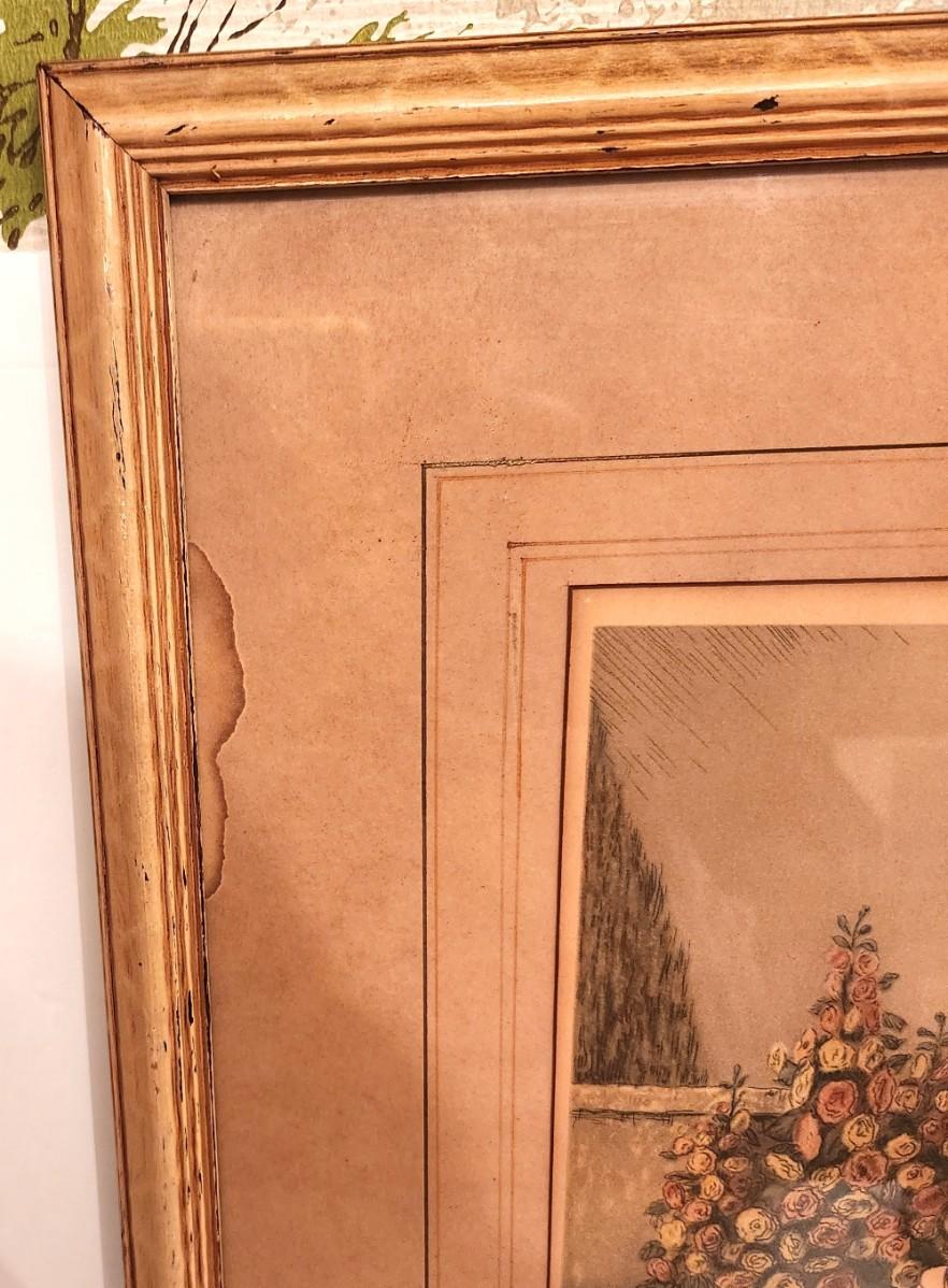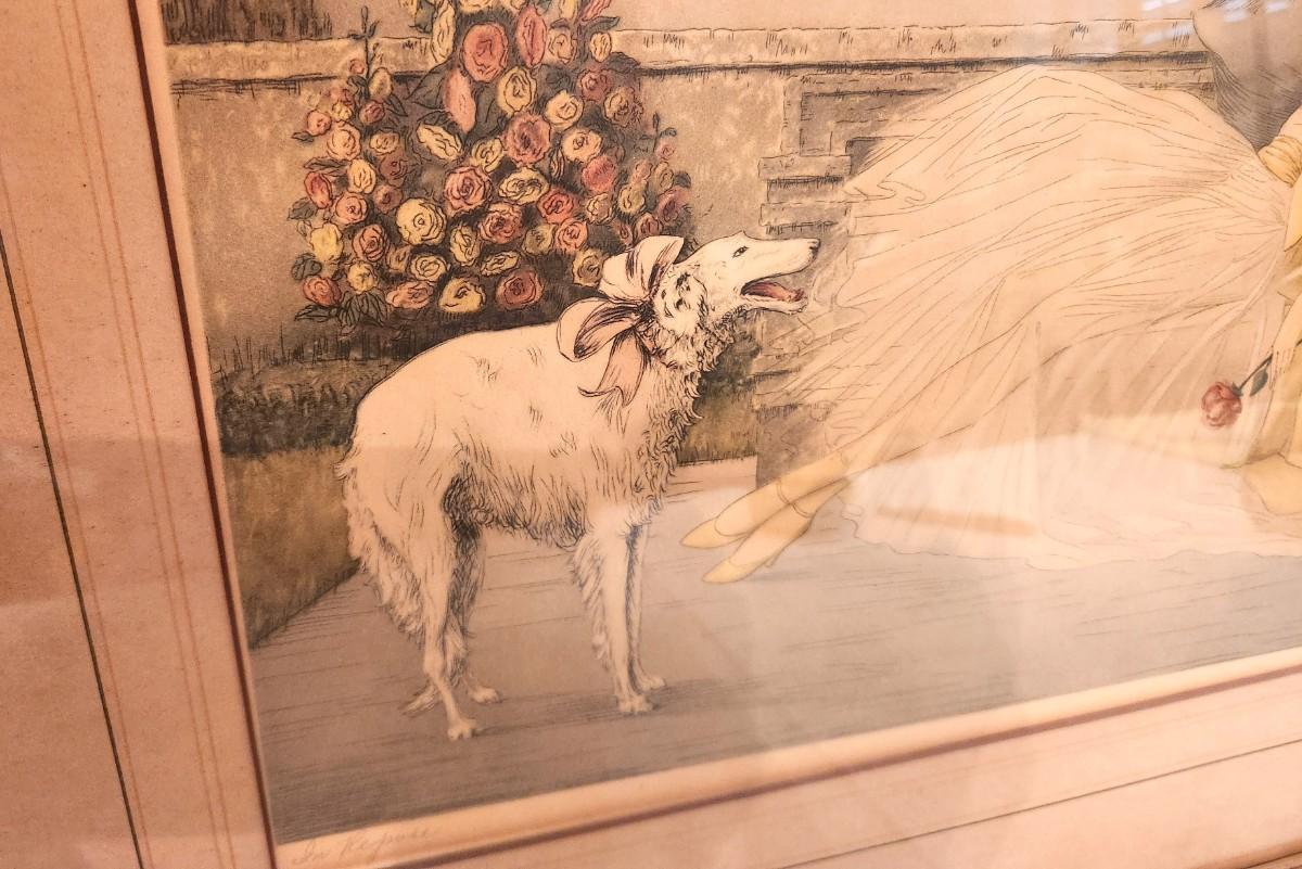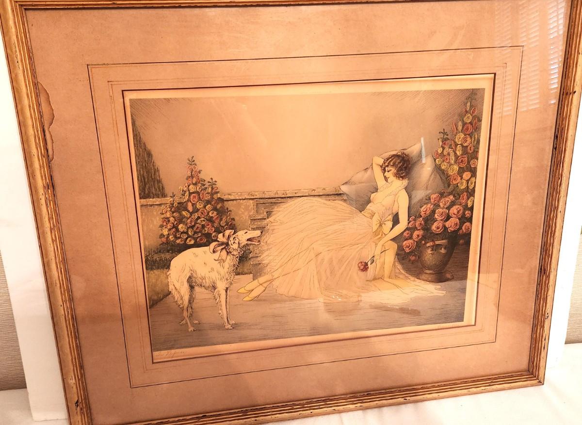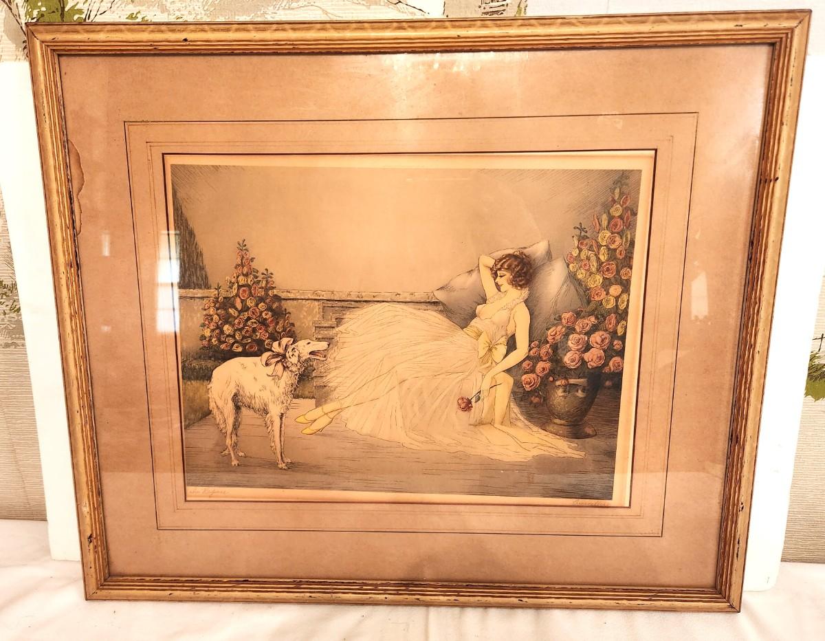 Lovely signed and titled "In Repose" 1920's boudoir dry paint etching - Flapper lady with her Barzoi (Russian Wolfhound) - by artist Courcelles. Original frame 21.5" x 25.5". It's a beauty. Small stain on left side (see photo).