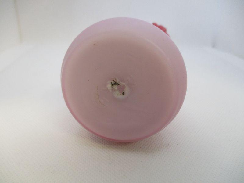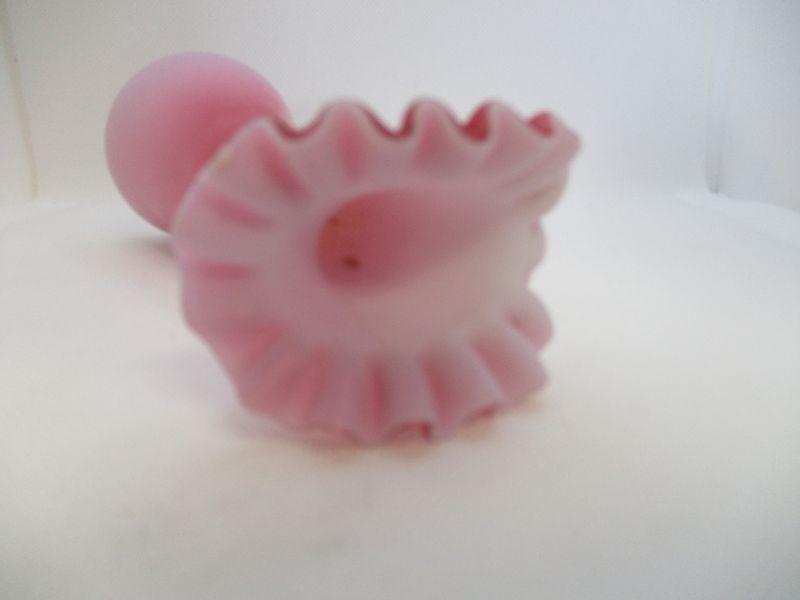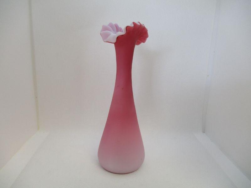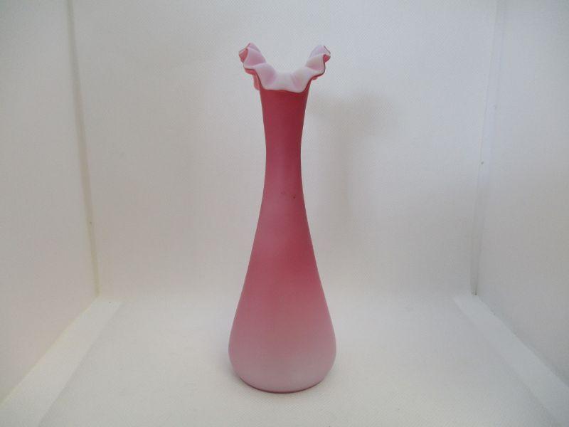 Very elegant pink vase that has the pink color graduating from light to dark as it rises. The bottom is a little more pink that the picture shows, but still a light pink. It has a crimped top and the pontil marks are still on the base. It measures just shy of 7.5" tall and is in excellent condition.
