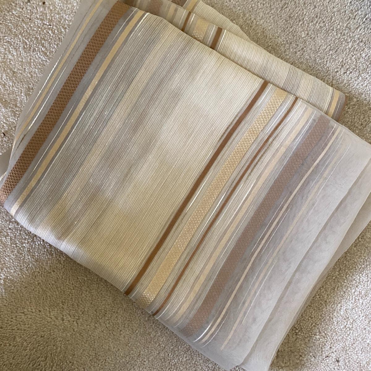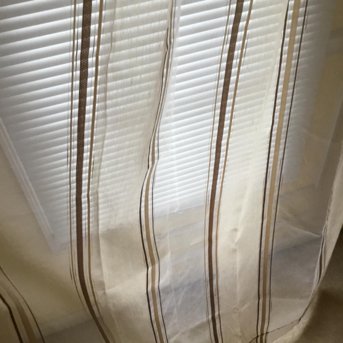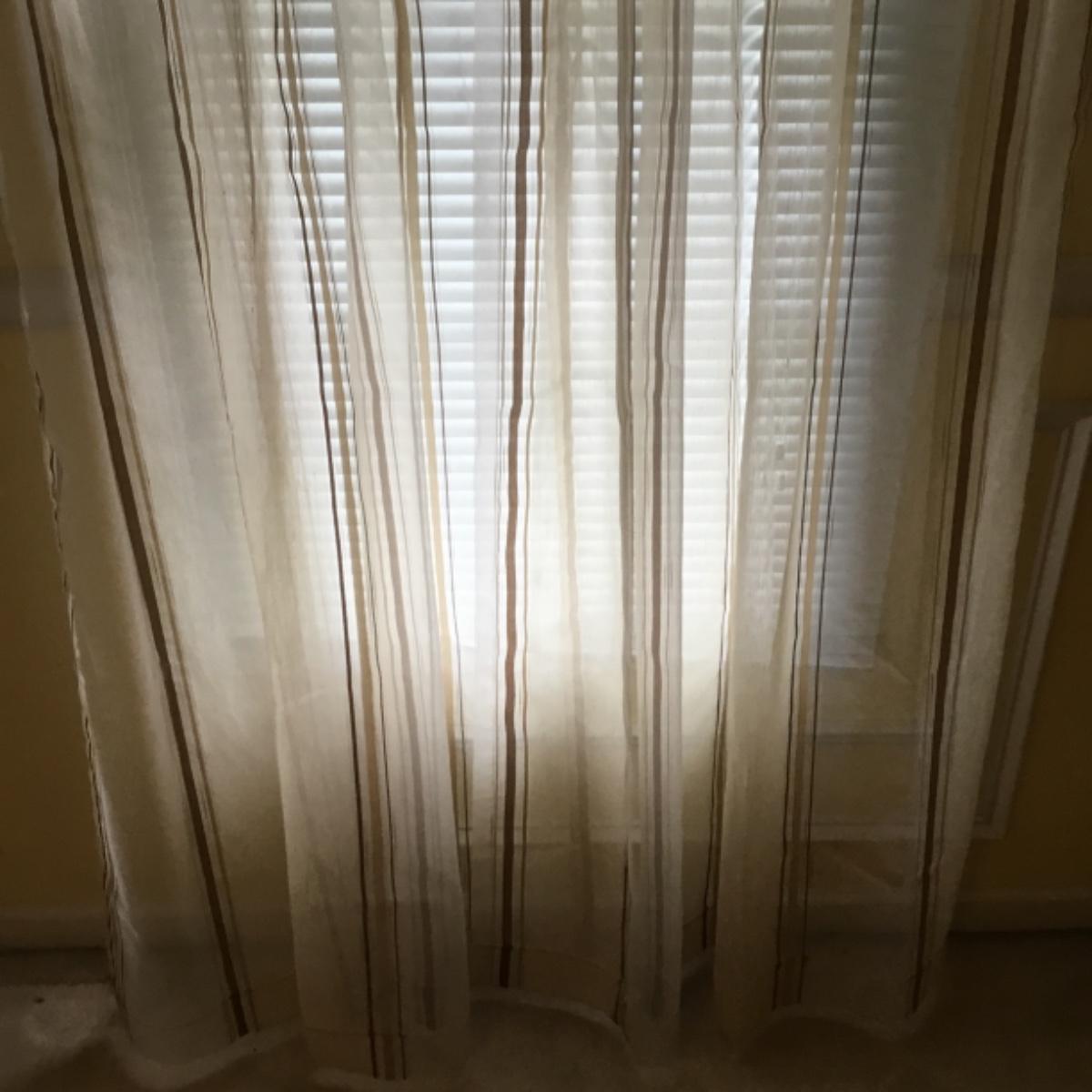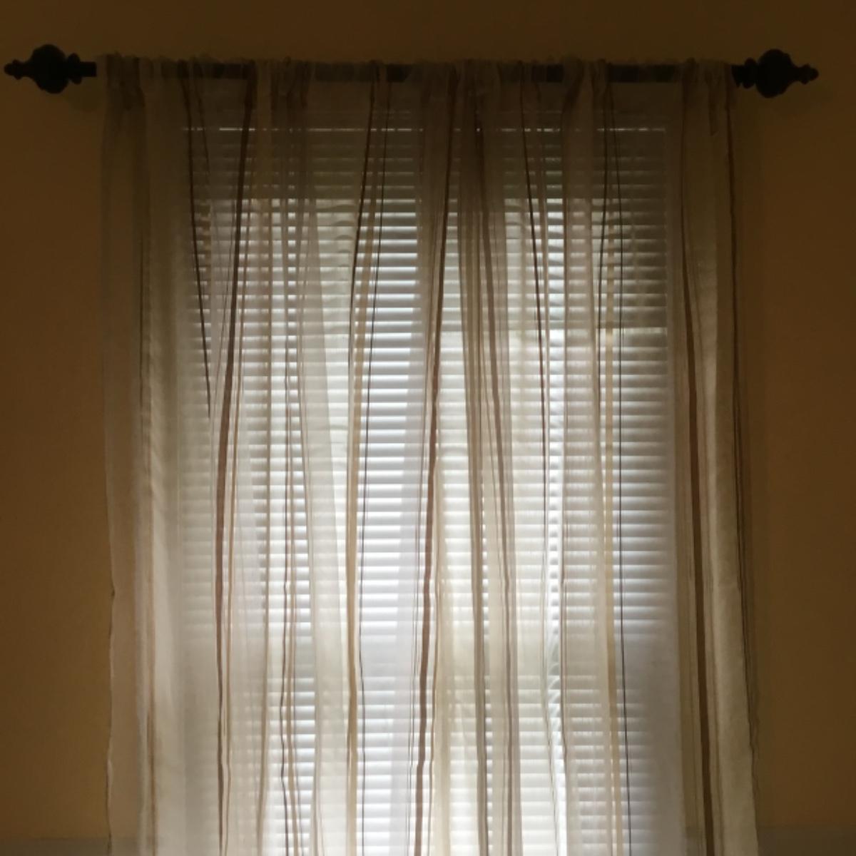 Lot includes beautiful tan sheer curtains with shades of brown stripes spaced out. Lot includes six curtain panels measuring approx. 4’x7’. Cindy Crawford line from JCPenny. Also includes three full rods(with hardware) and two unused curtains in a different style. See photos for details. Shipping available.