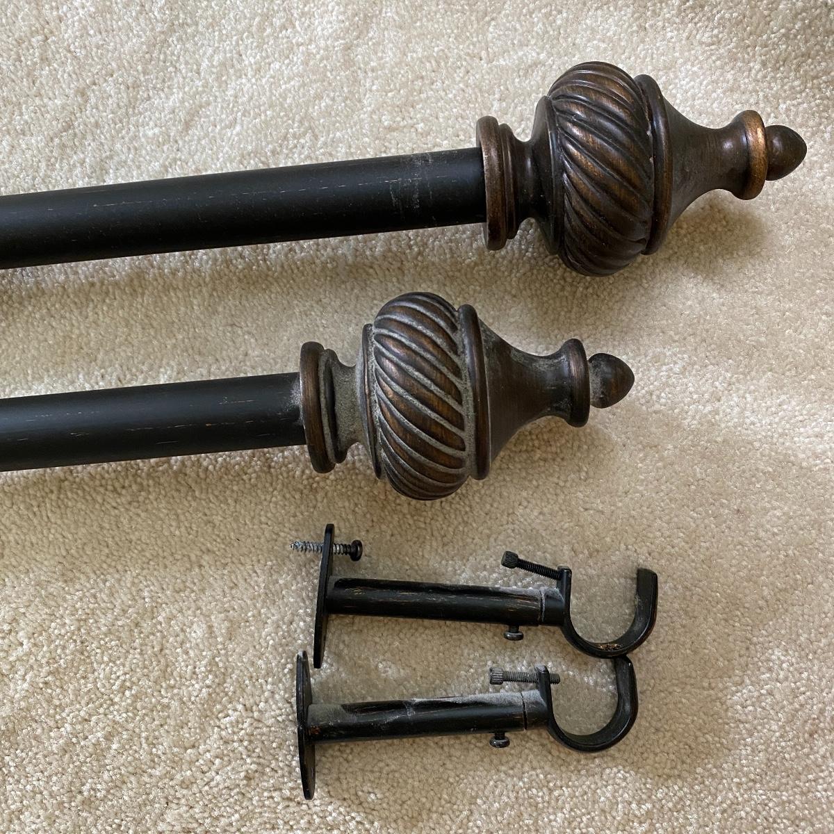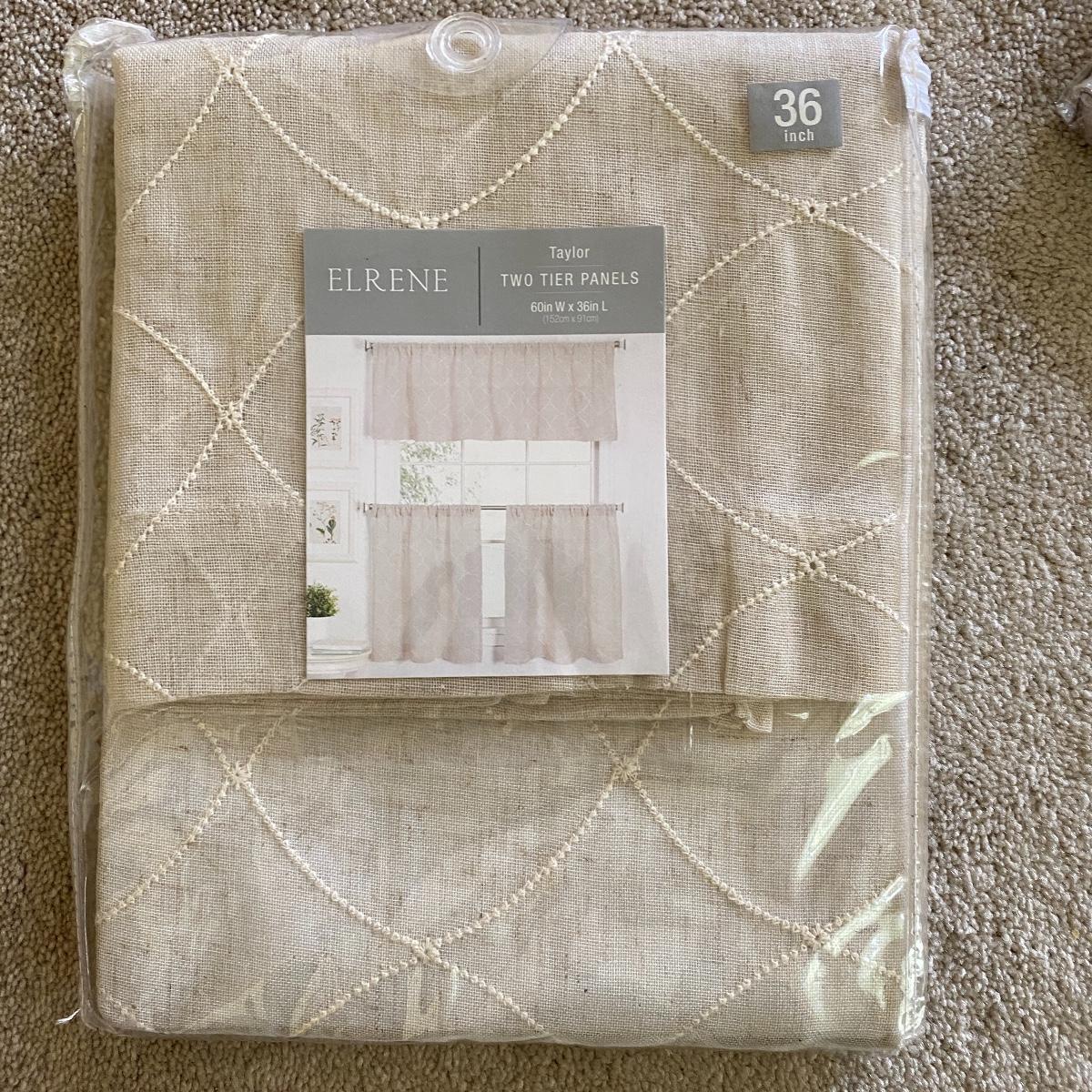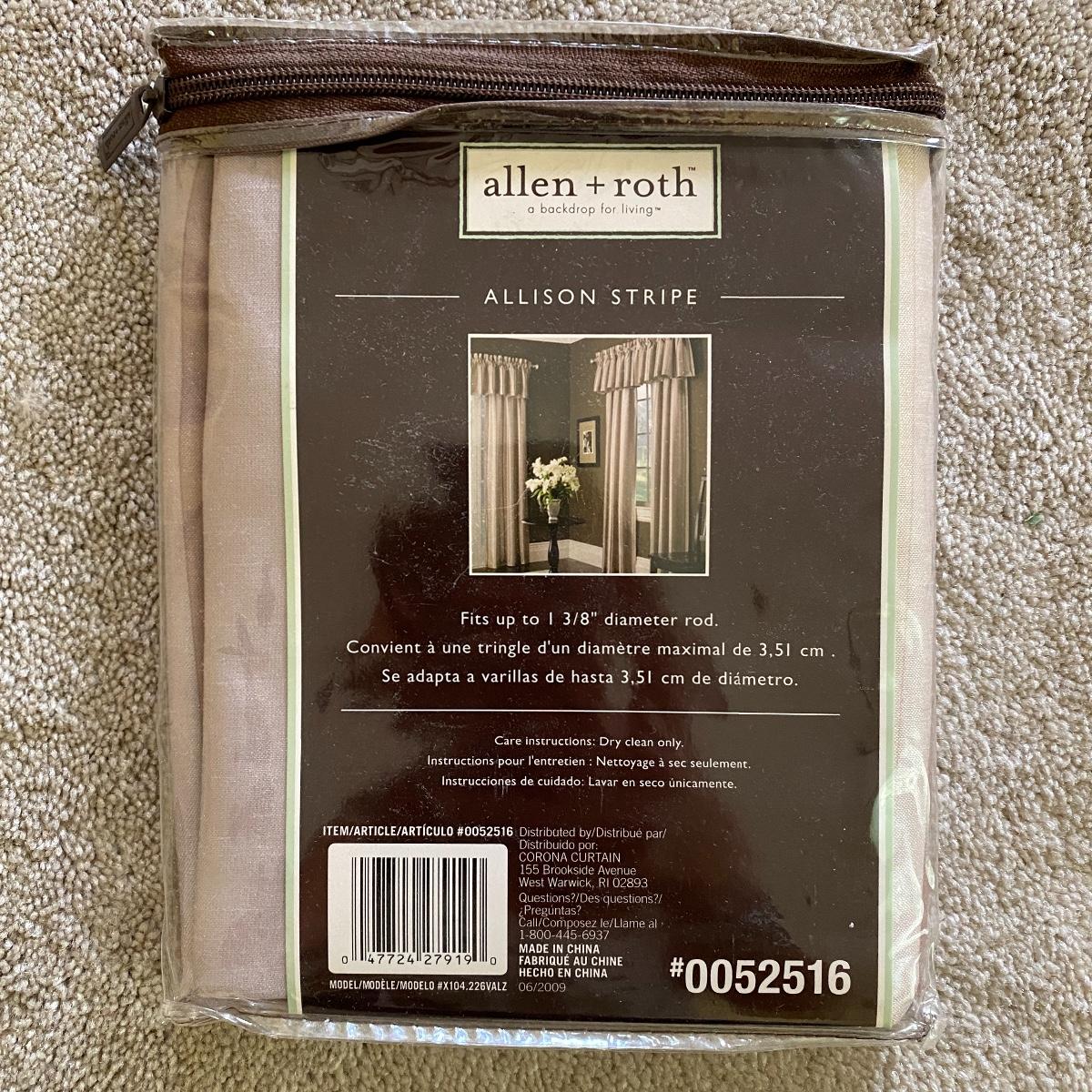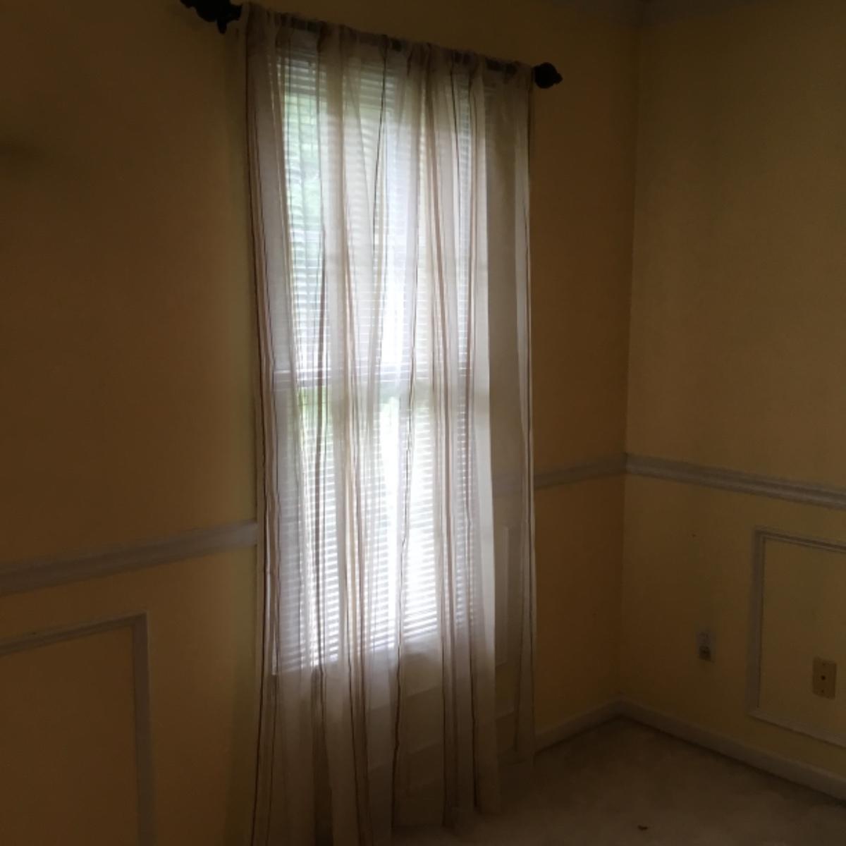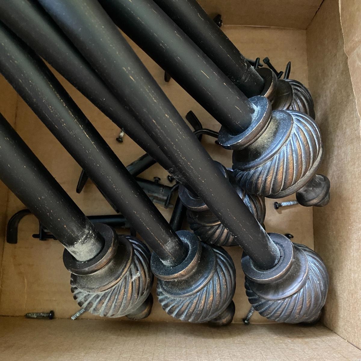 Lot includes beautiful tan sheer curtains with shades of brown stripes spaced out. Lot includes six curtain panels measuring approx. 4’x7’. Cindy Crawford line from JCPenny. Also includes three full rods(with hardware) and two unused curtains in a different style. See photos for details. Shipping available.