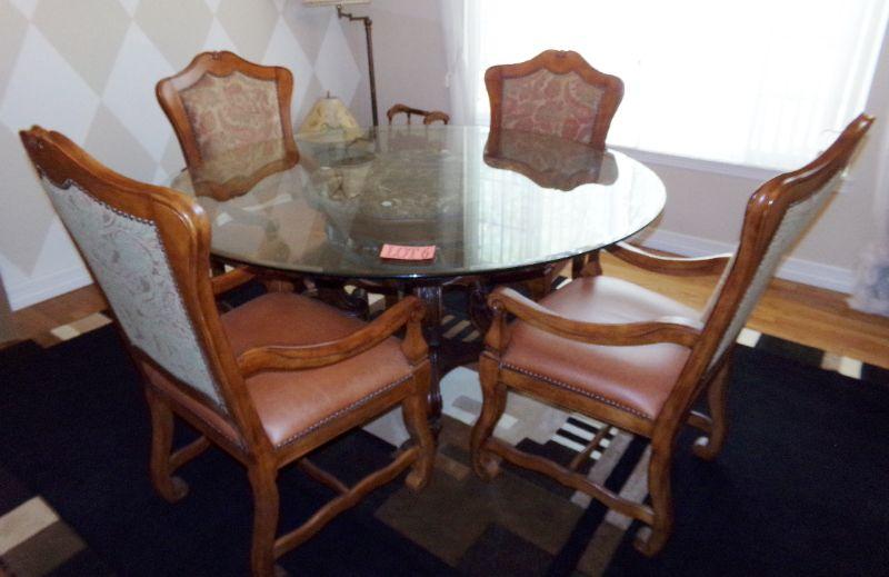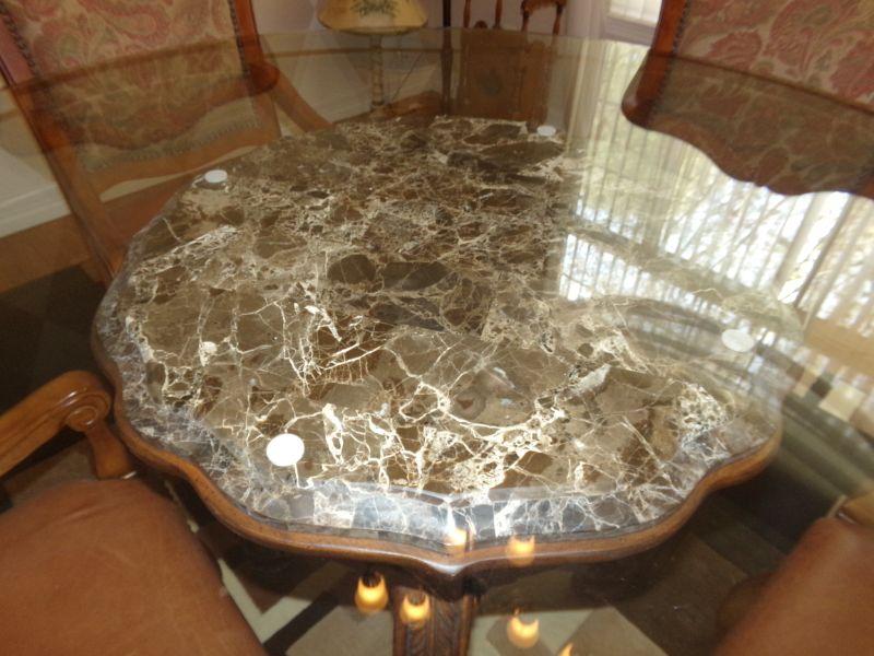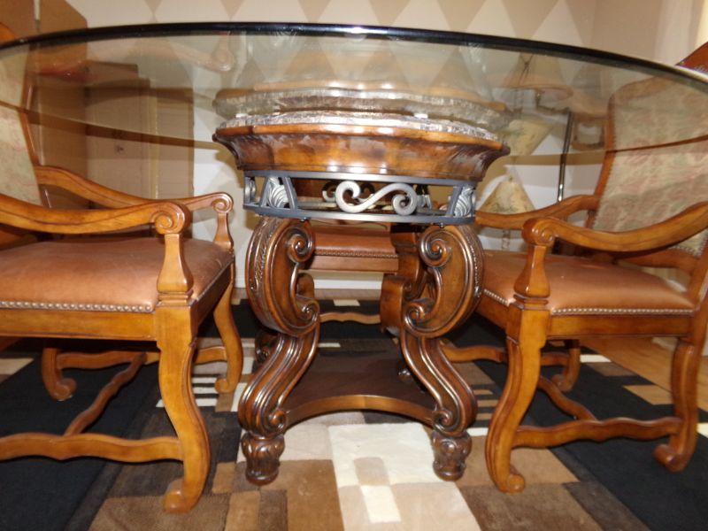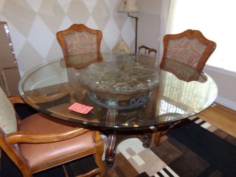 Glass top table measures 59" circumference and 32" tall. Glass sits on an iron base with what looks like a round piece of marble in the center of table