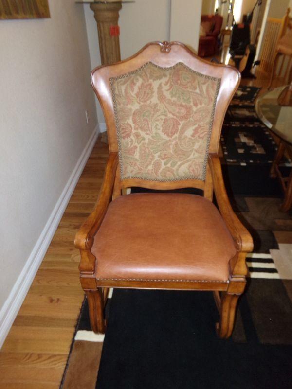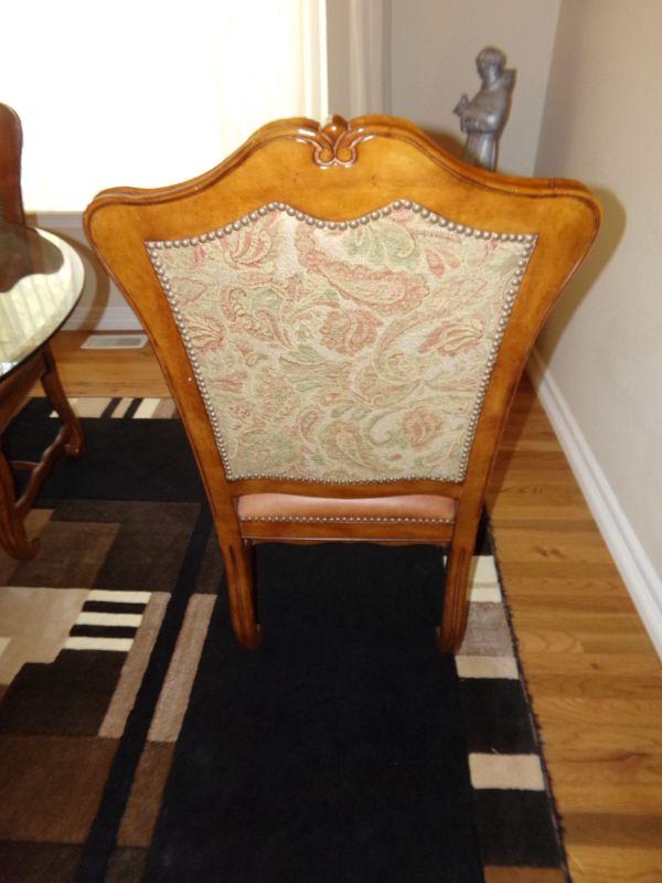 4 solid wood captain chairs with upholstered, padded backs and seats