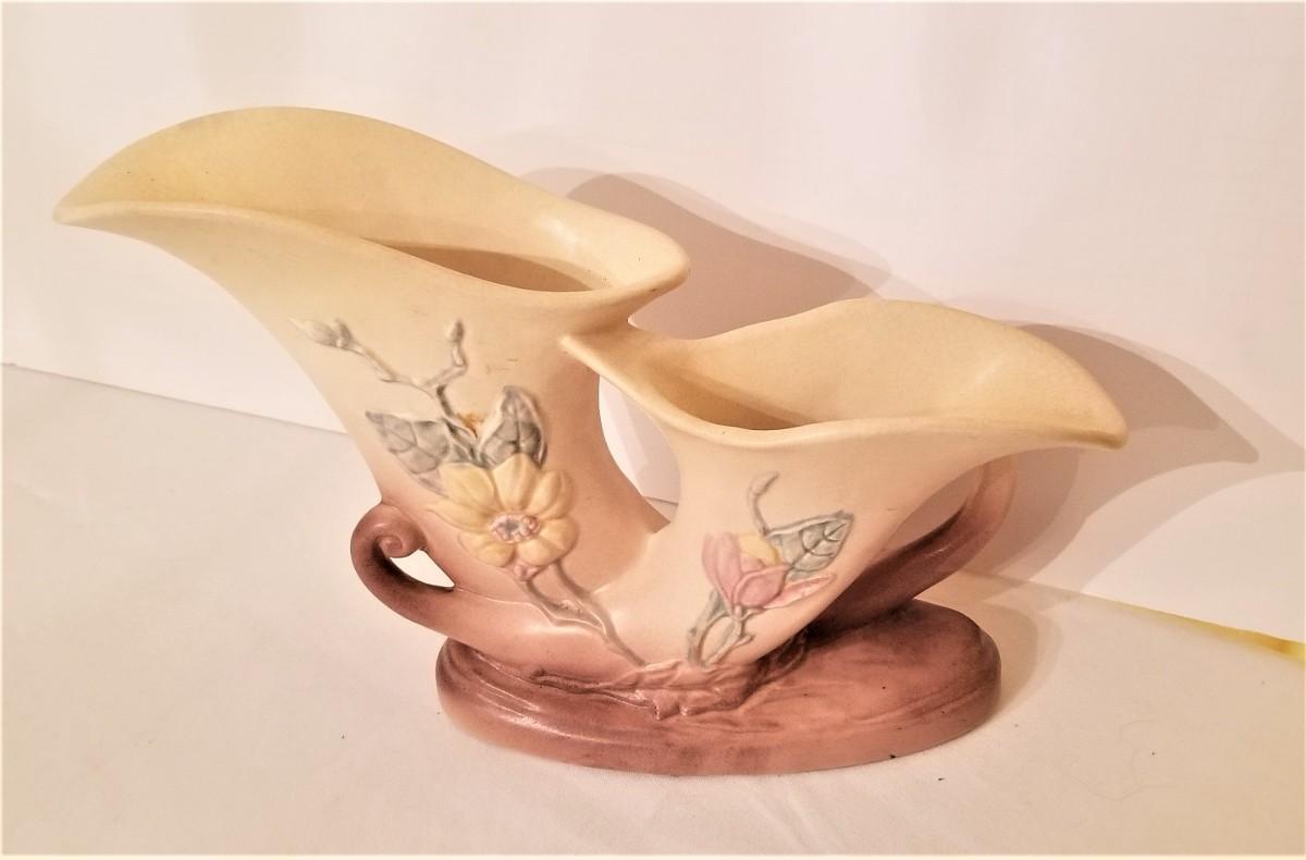 Nice vintage Hull (marked ) art pottery - double cornucopia. Good vintage condition. 7.75" tall at tallest point. 13" across.