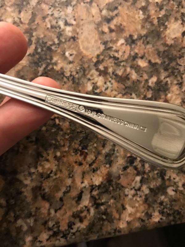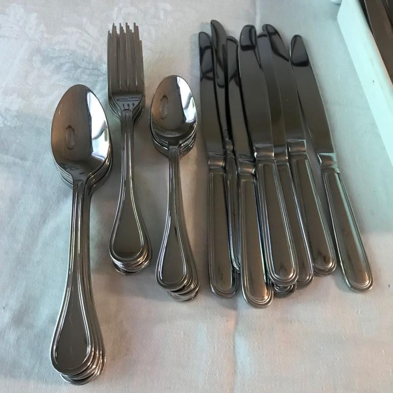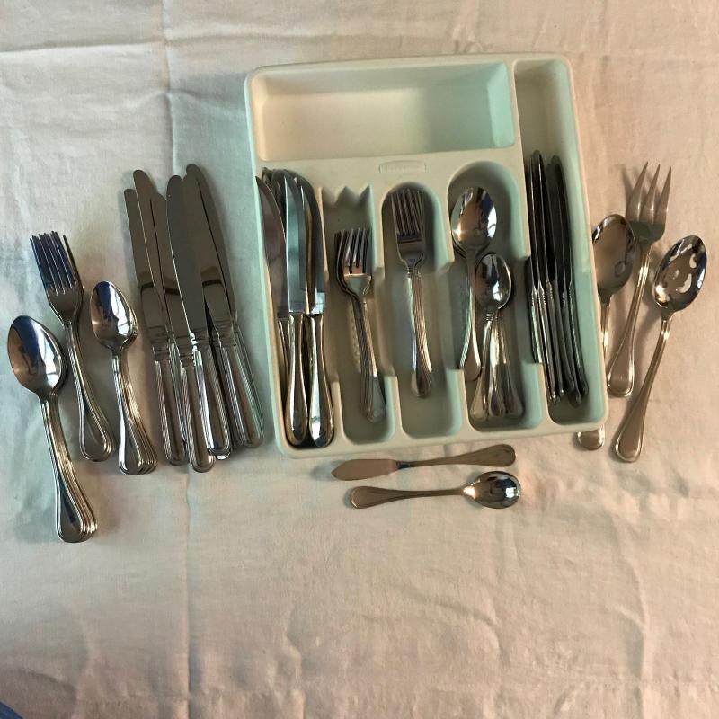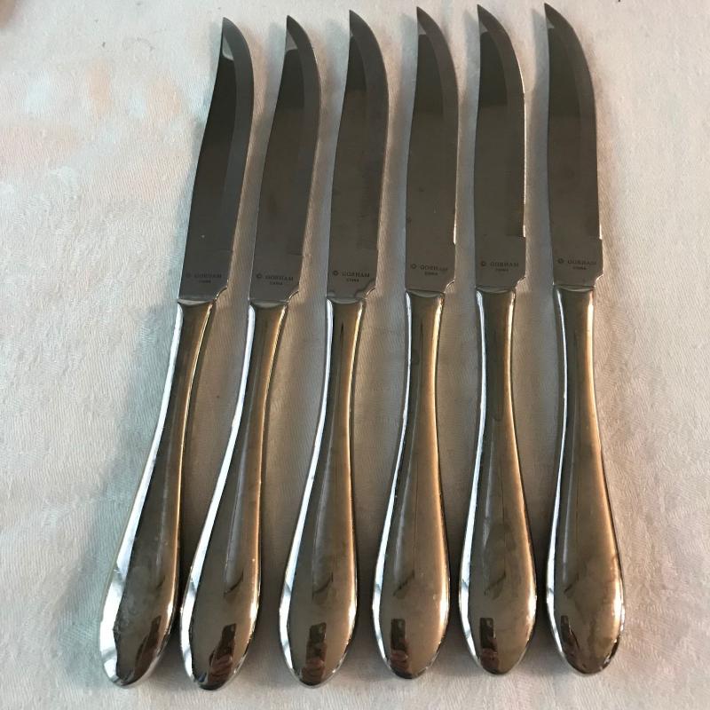 Stainless “Cambridge” flatware set includes matching serving pieces. Lot also includes 6 steak knives by Gorham and 8 by Pfaltzgraff as well as some Pfaltzgraff spoons. Shipping available.