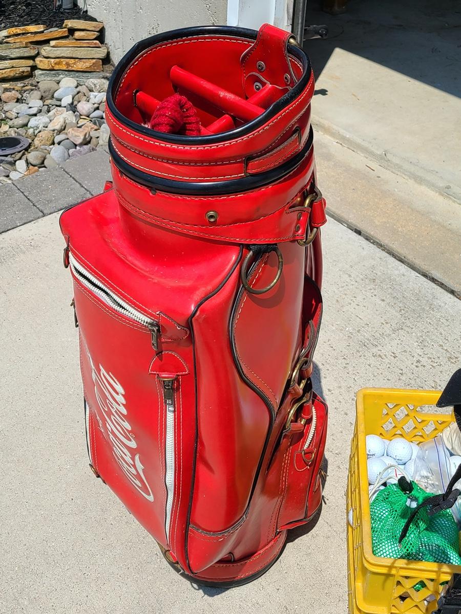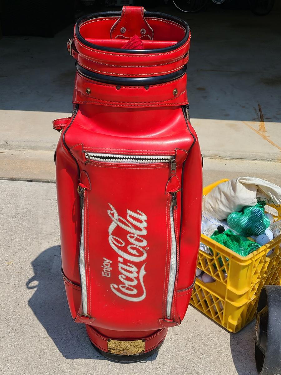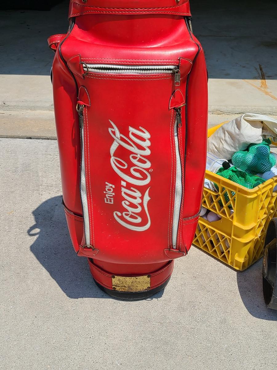 Vintage Coke Golf Bag. Still functional. Not leather. Please see all pictures as they are the best representation of the items in the lot, the condition of the lot, and will show measurements if taken. If purchasing furniture you must be able to move yourself with your own help, and truck. .
