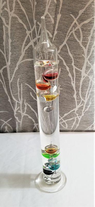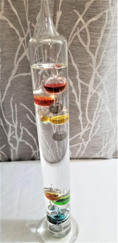 These things are such fun - floating colorled balls tell you the (indoor) temperature by rising to the top. Modeled after an invention by the famed Galileo. Popular in the 1970's and 80's - you don't see these much anymore. Good condition. Measures 17" tall.