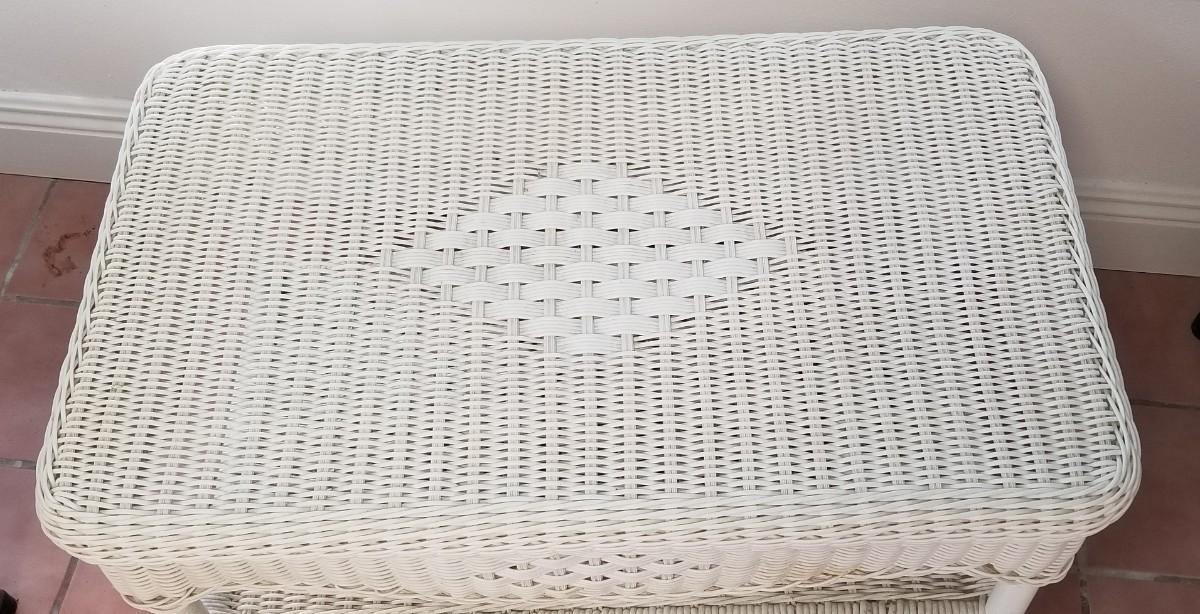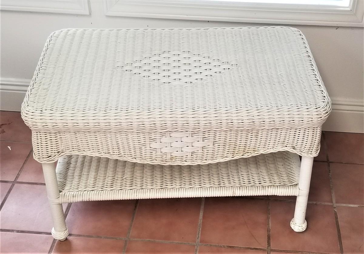 Nice faux wicker patio table (indoor/outdoor) by Hampton Bay. Good, gently used condition. 30" x 18", 18" tall. Great quality.