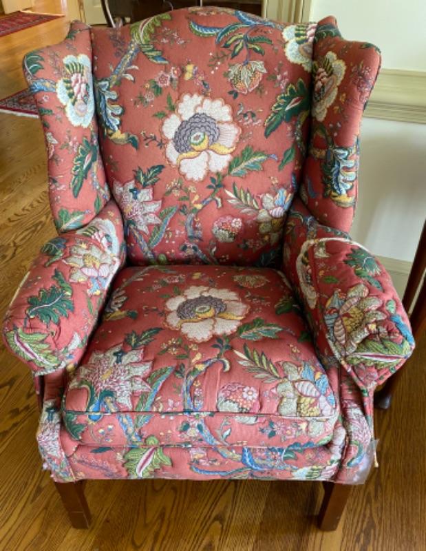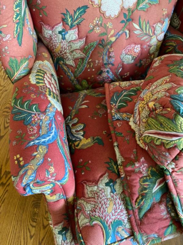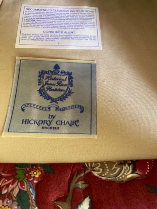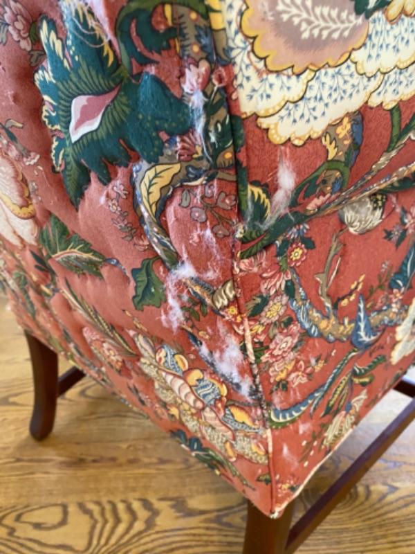Upholstered Hickory Chair Co. Wingback chair with damage