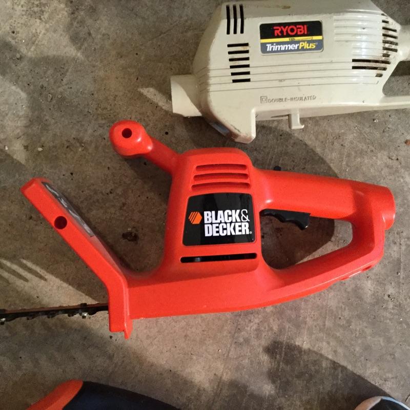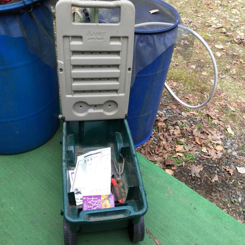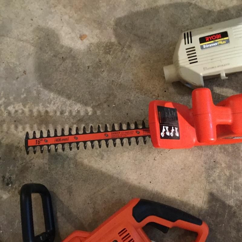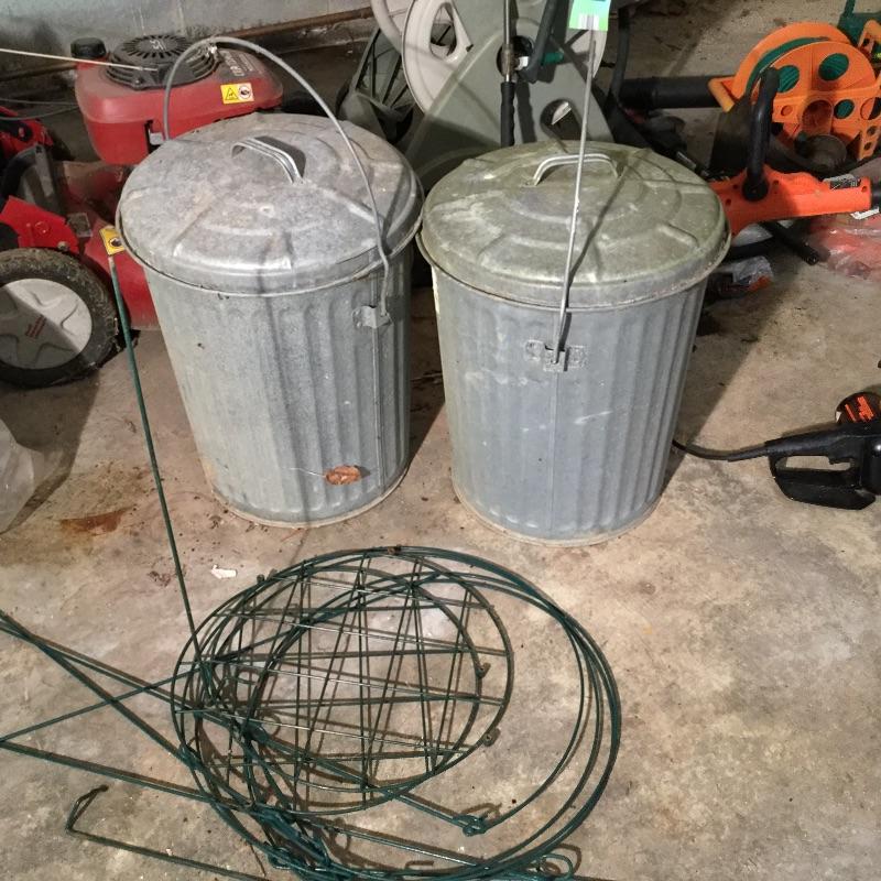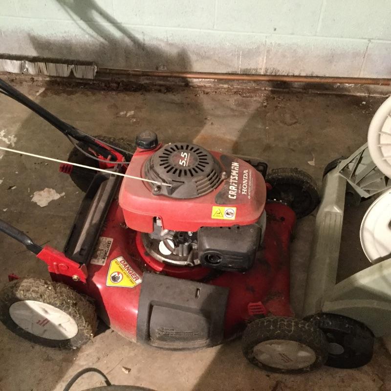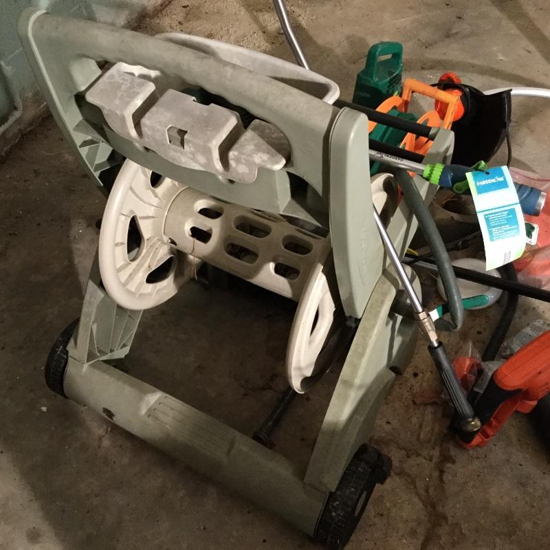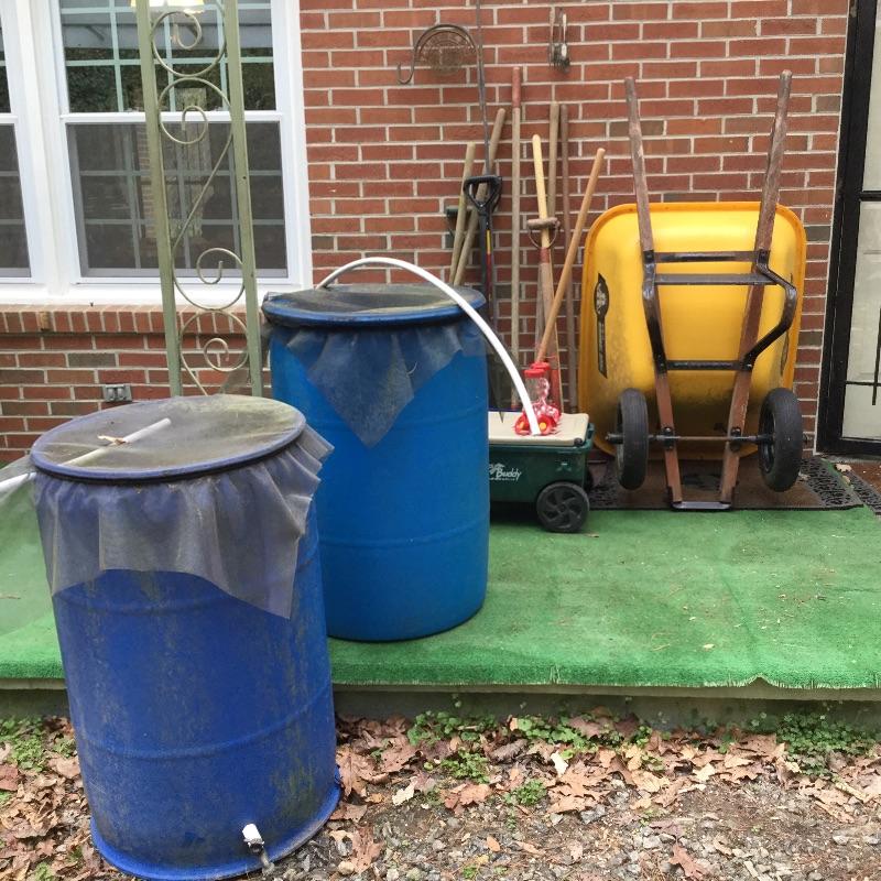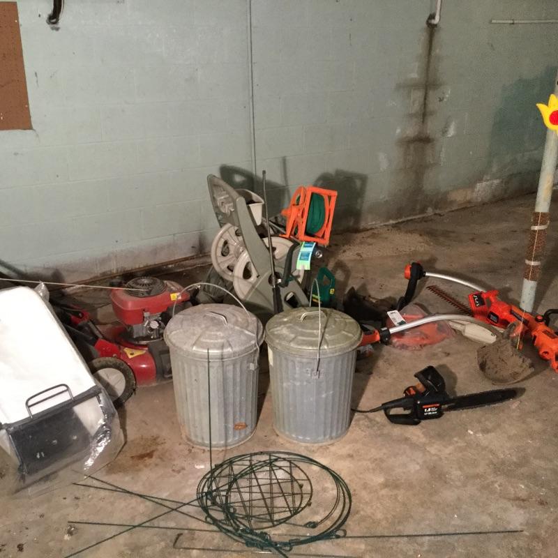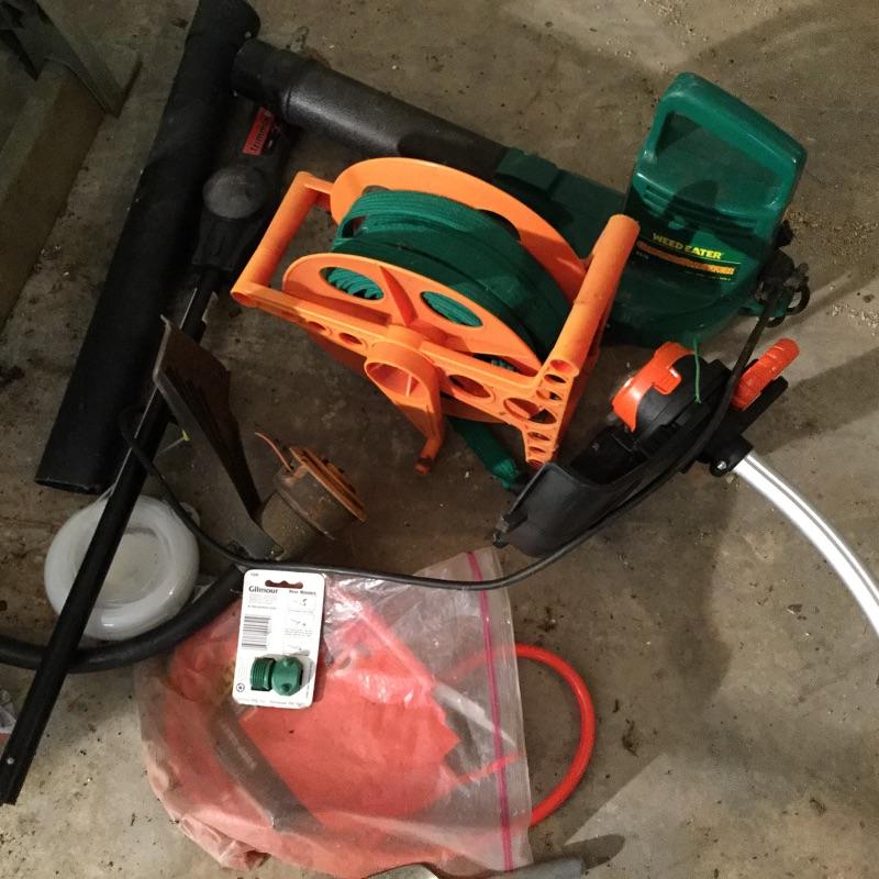 Craftsman Honda lawn mower that appears to be in working order but has not been run, two galvanized trash cans, garden hose caddy, two B&D electric weed eaters, B&D electric hedge trimmer Ryobi multi use electric tool, weed eater electric blower and garden hose. Two home made rain barrels with spouts at bottom, true temper two wheel wheelbarrow, garden tools and lawn buddy cart,