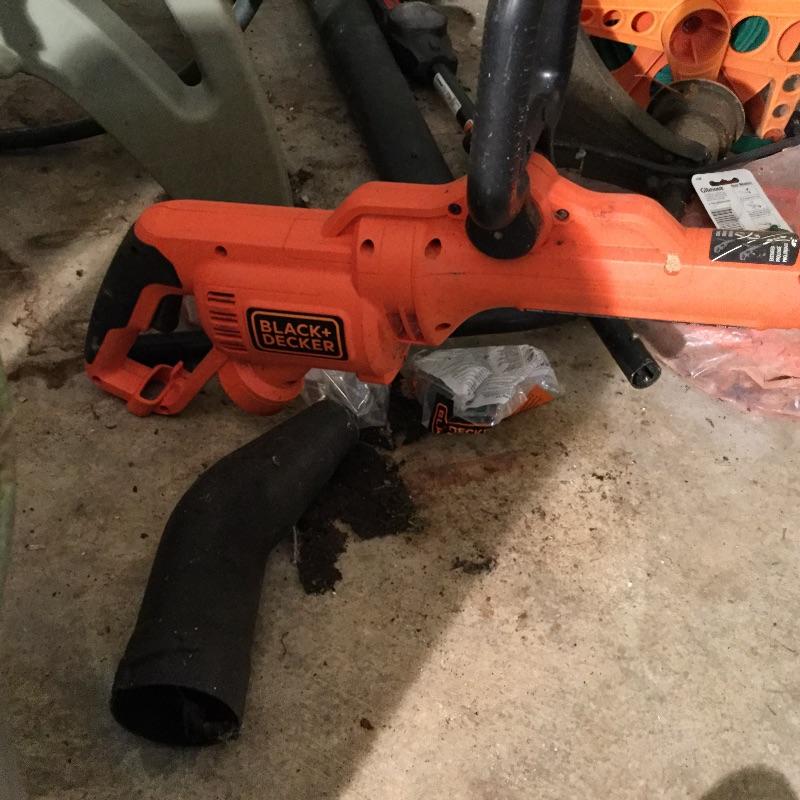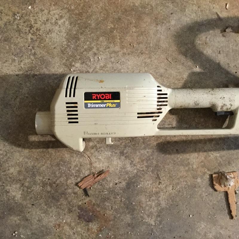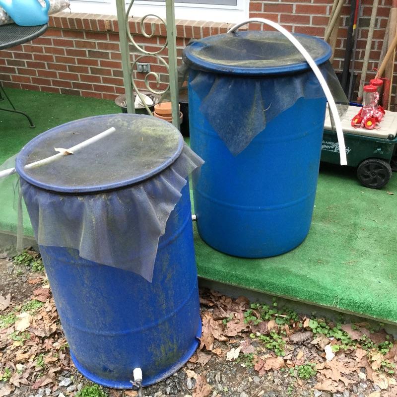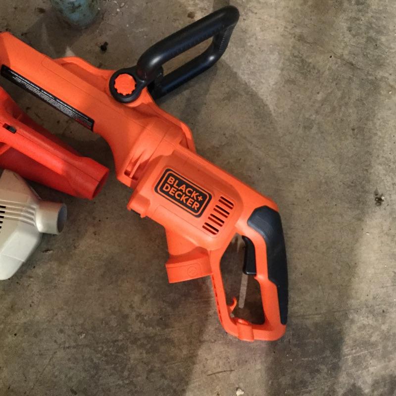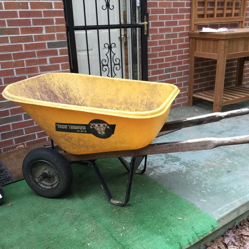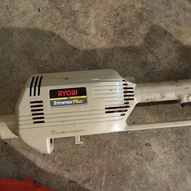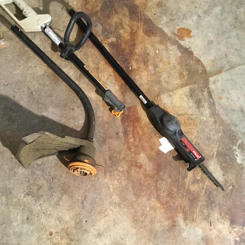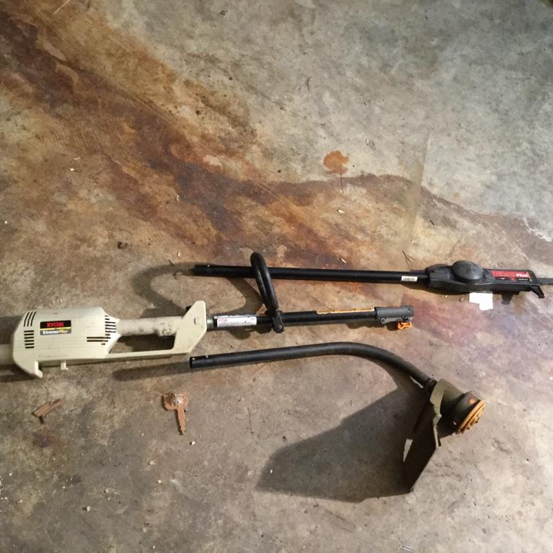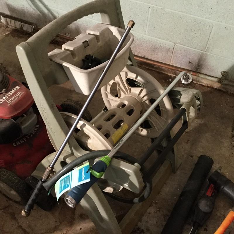Craftsman Honda lawn mower that appears to be in working order but has not been run, two galvanized trash cans, garden hose caddy, two B&D electric weed eaters, B&D electric hedge trimmer Ryobi multi use electric tool, weed eater electric blower and garden hose. Two home made rain barrels with spouts at bottom, true temper two wheel wheelbarrow, garden tools and lawn buddy cart,