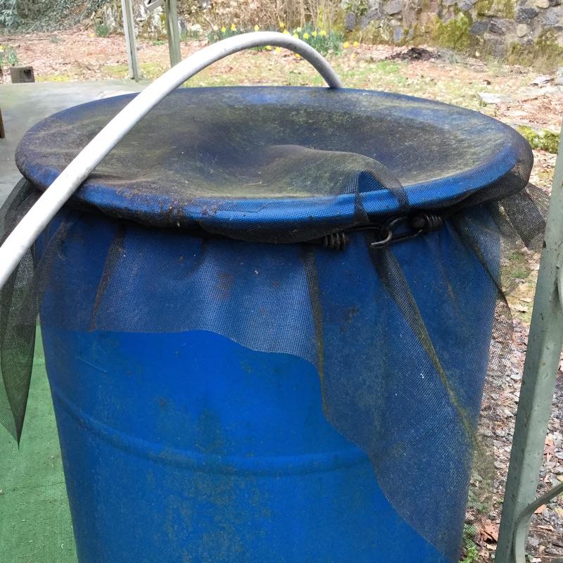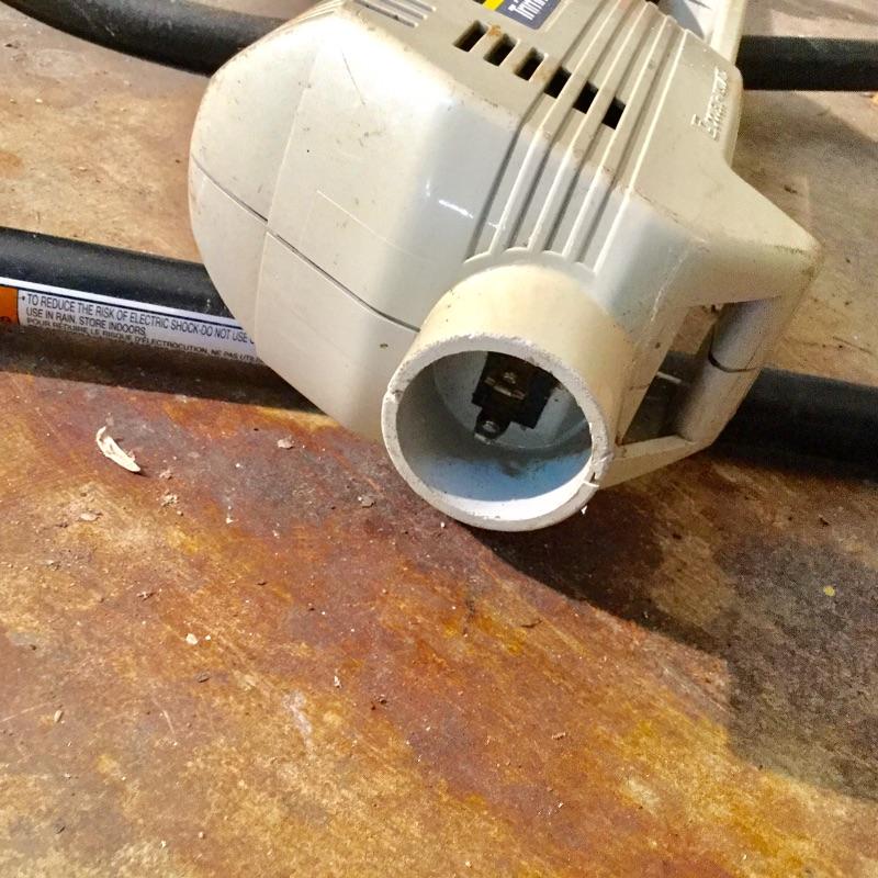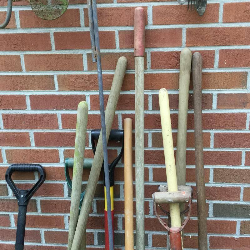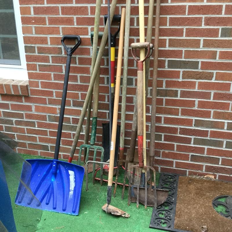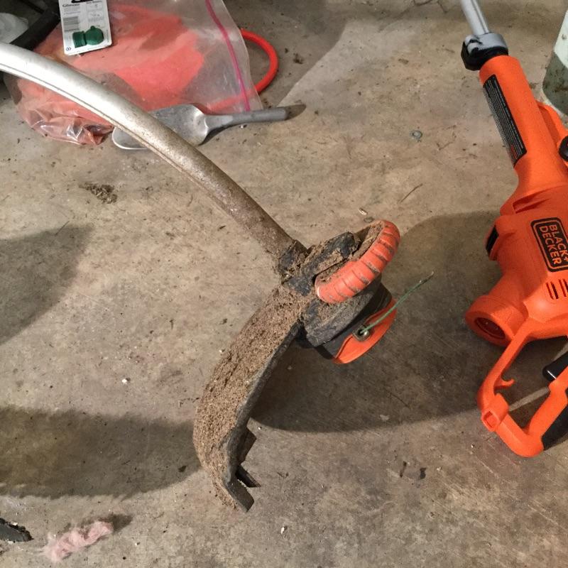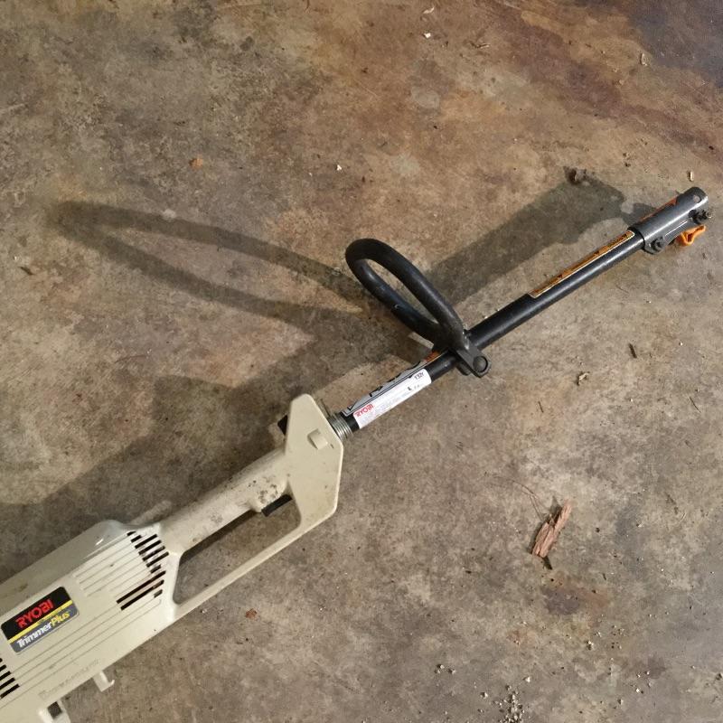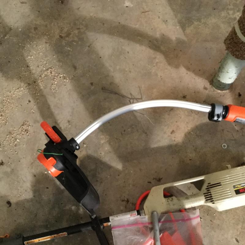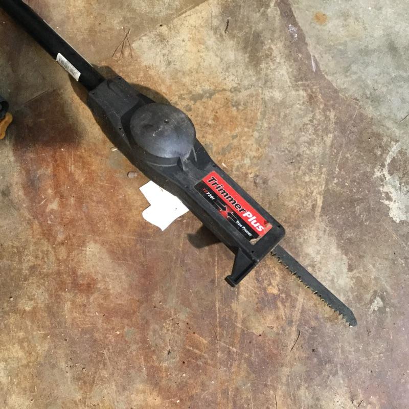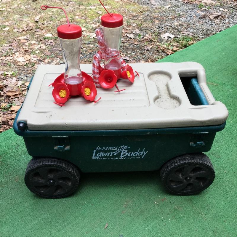 Craftsman Honda lawn mower that appears to be in working order but has not been run, two galvanized trash cans, garden hose caddy, two B&D electric weed eaters, B&D electric hedge trimmer Ryobi multi use electric tool, weed eater electric blower and garden hose. Two home made rain barrels with spouts at bottom, true temper two wheel wheelbarrow, garden tools and lawn buddy cart,