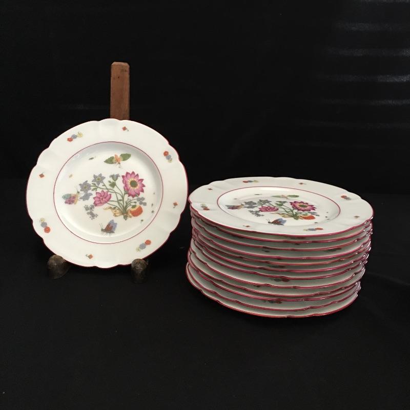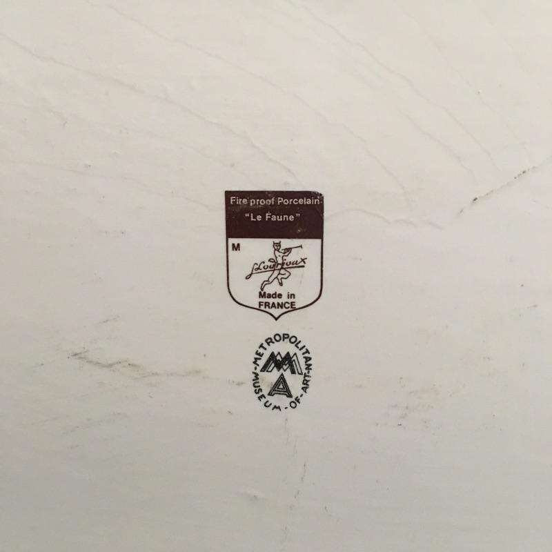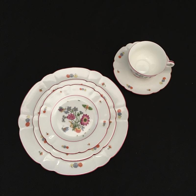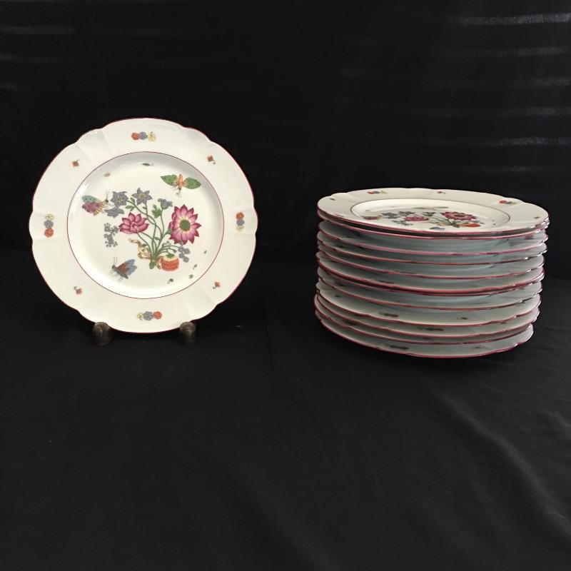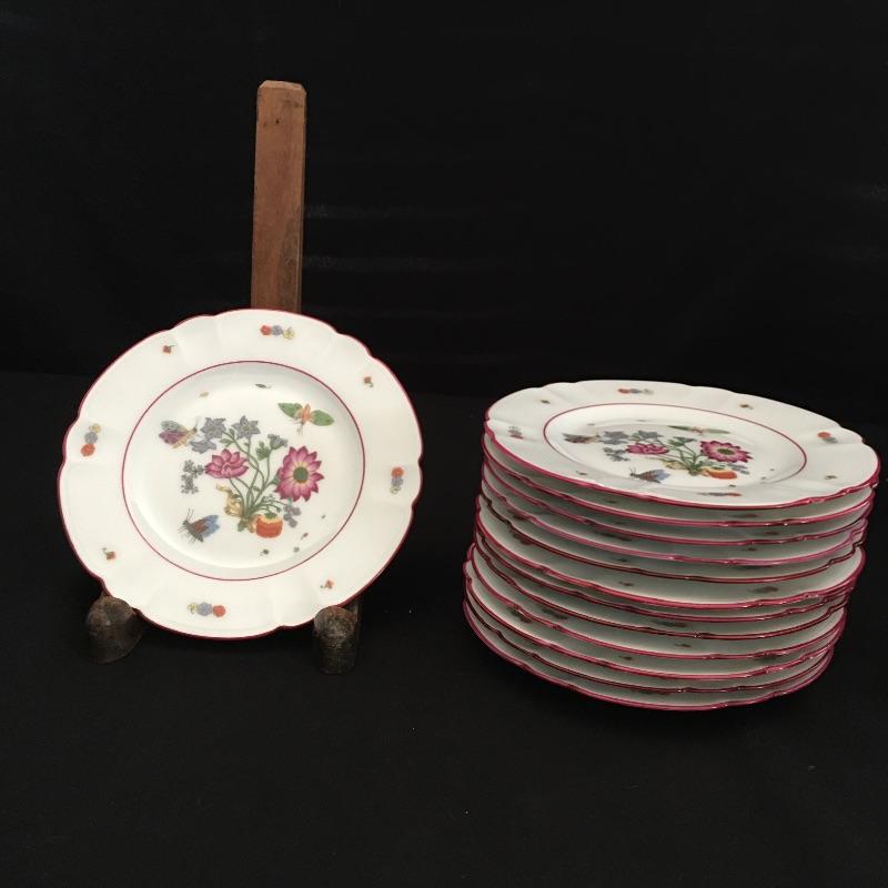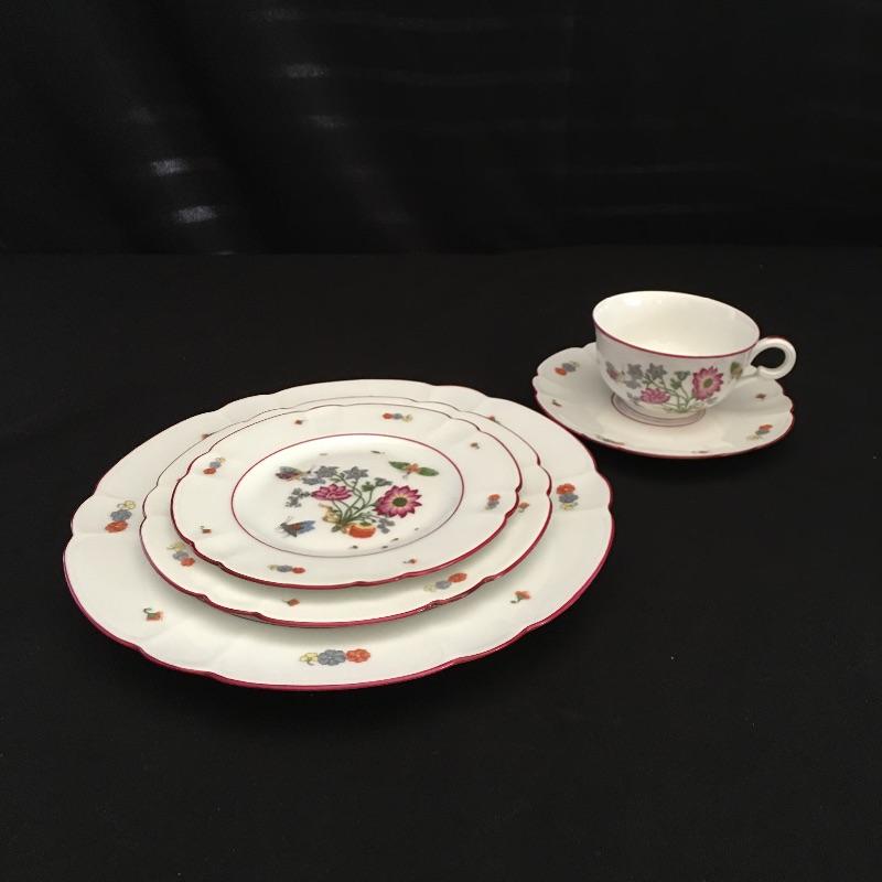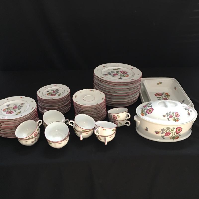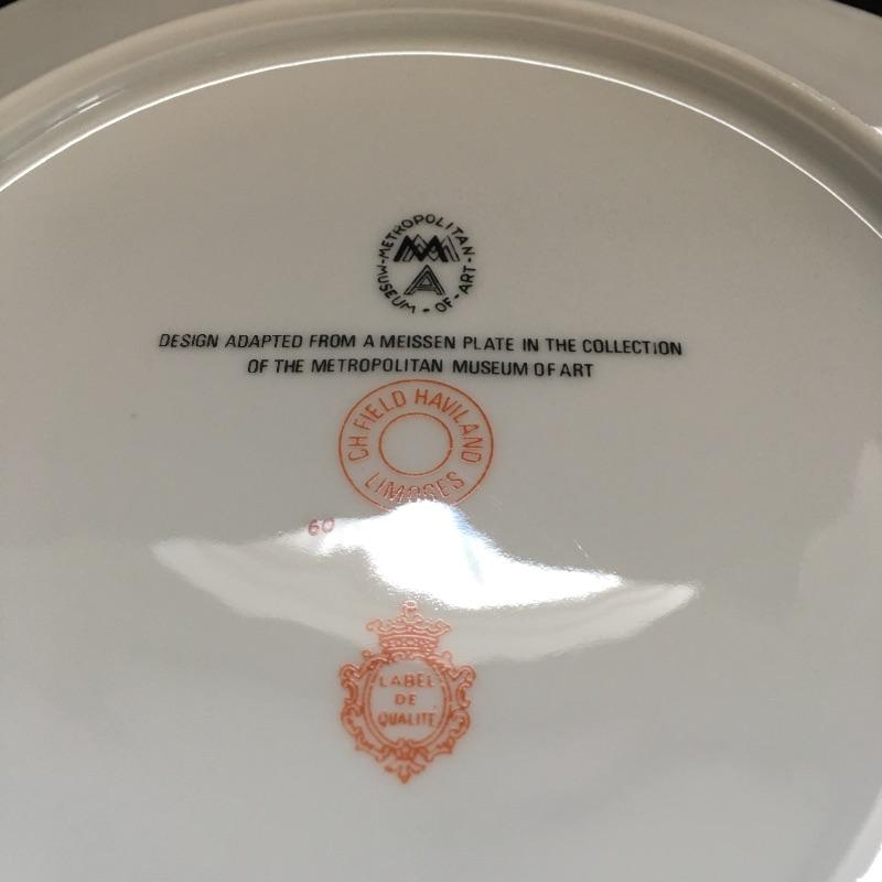 Limoges China set with a design adapted from a Meissen plate in the collection of the Metropolitan Museum of Art. Stunning five piece twelve person set with a Lourioux covered dish and two casserole dishes that have a matching design. You will love setting your table with this beautiful set of Limoges China. Largest plate measures 10”D, medium is 7.5" and small is 6.25". One teacup has small crack.