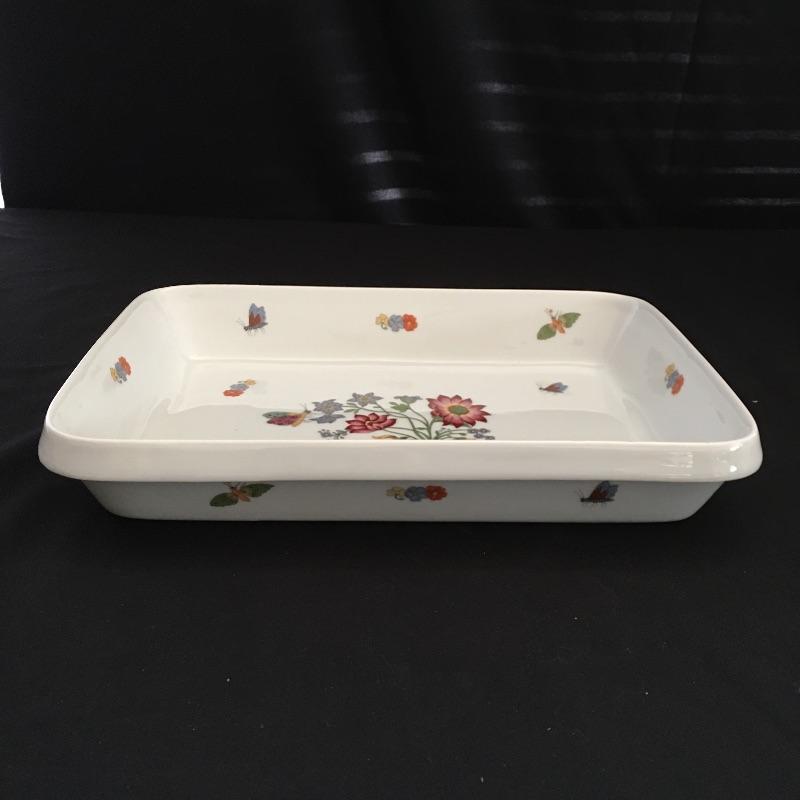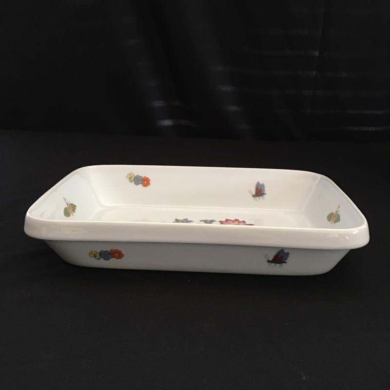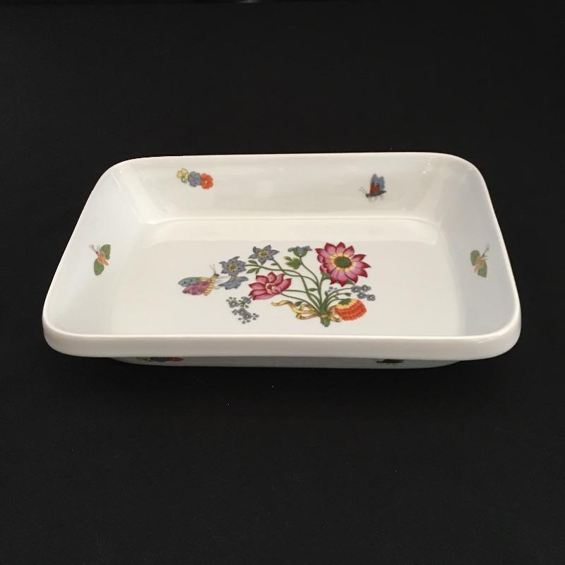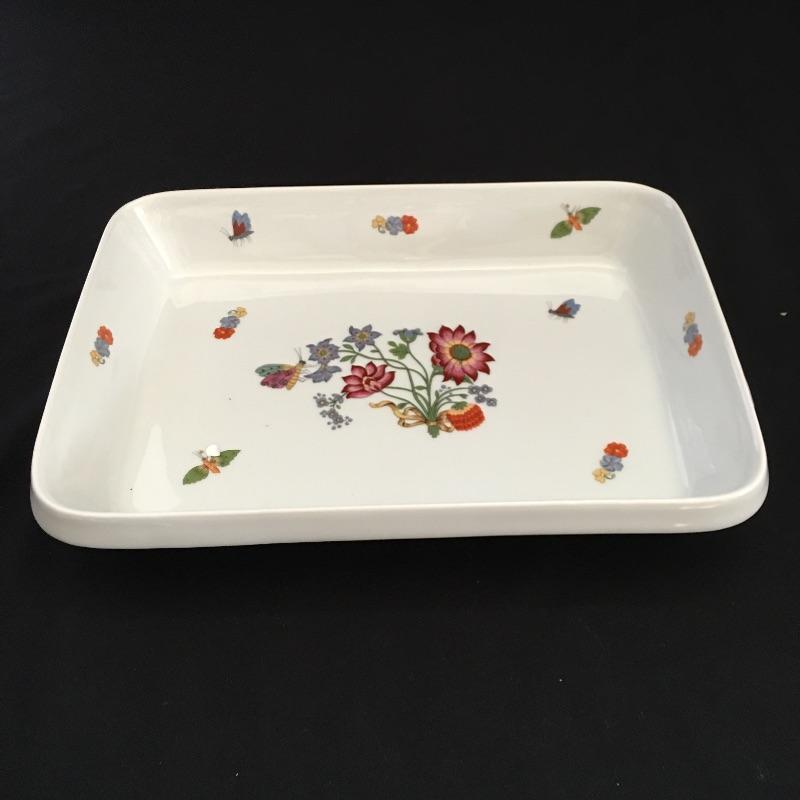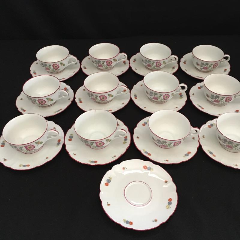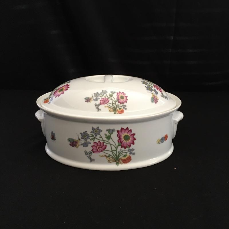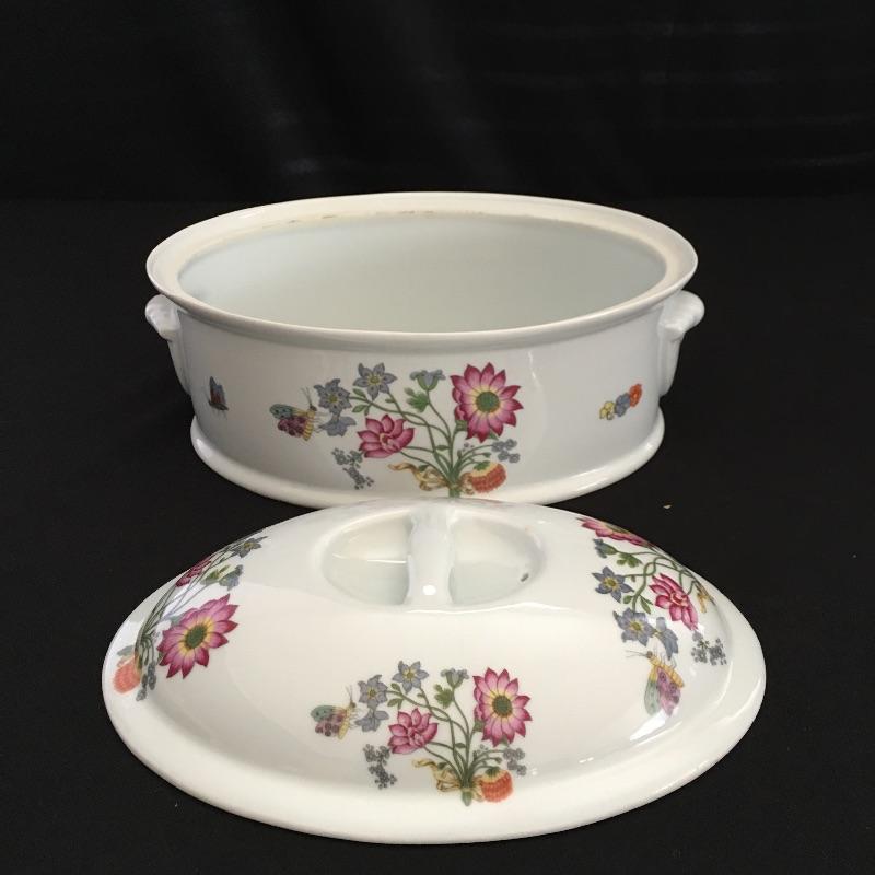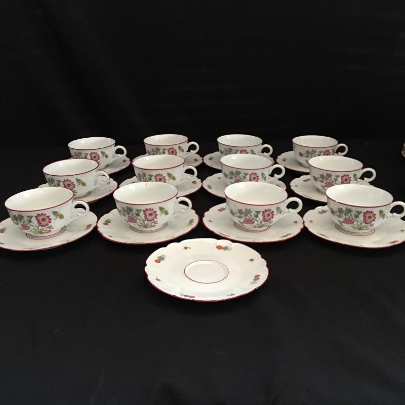 Limoges China set with a design adapted from a Meissen plate in the collection of the Metropolitan Museum of Art. Stunning five piece twelve person set with a Lourioux covered dish and two casserole dishes that have a matching design. You will love setting your table with this beautiful set of Limoges China. Largest plate measures 10”D, medium is 7.5" and small is 6.25". One teacup has small crack.