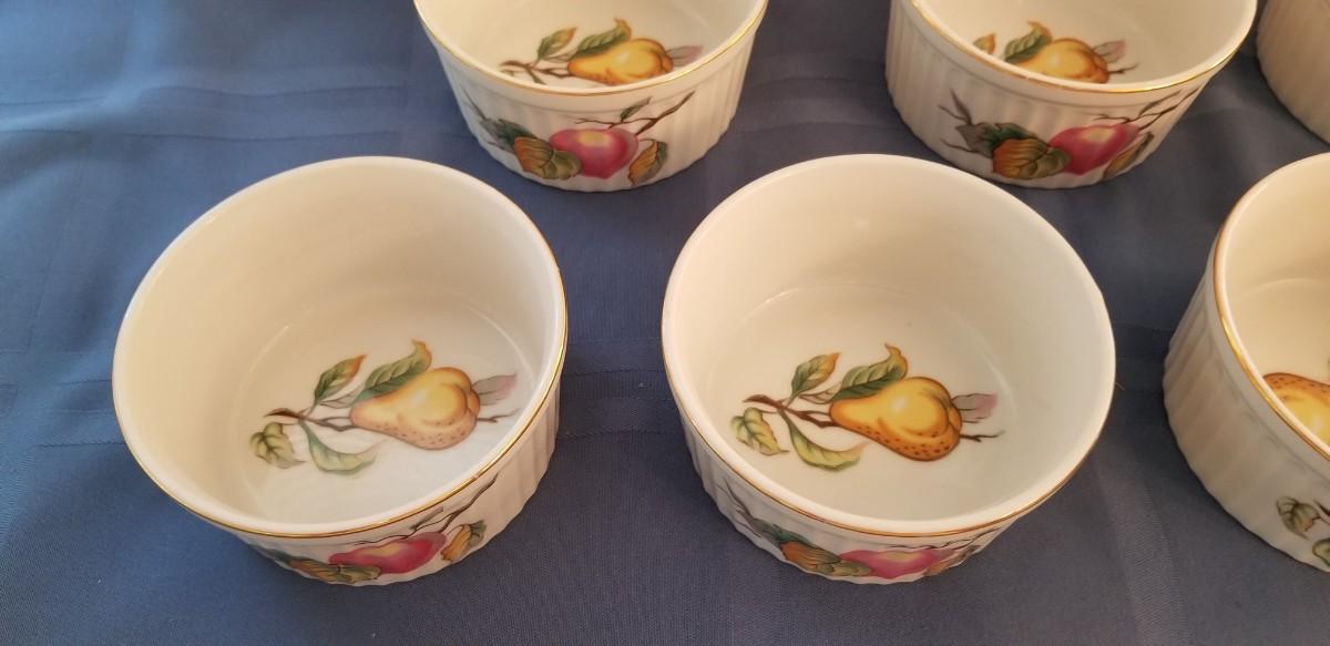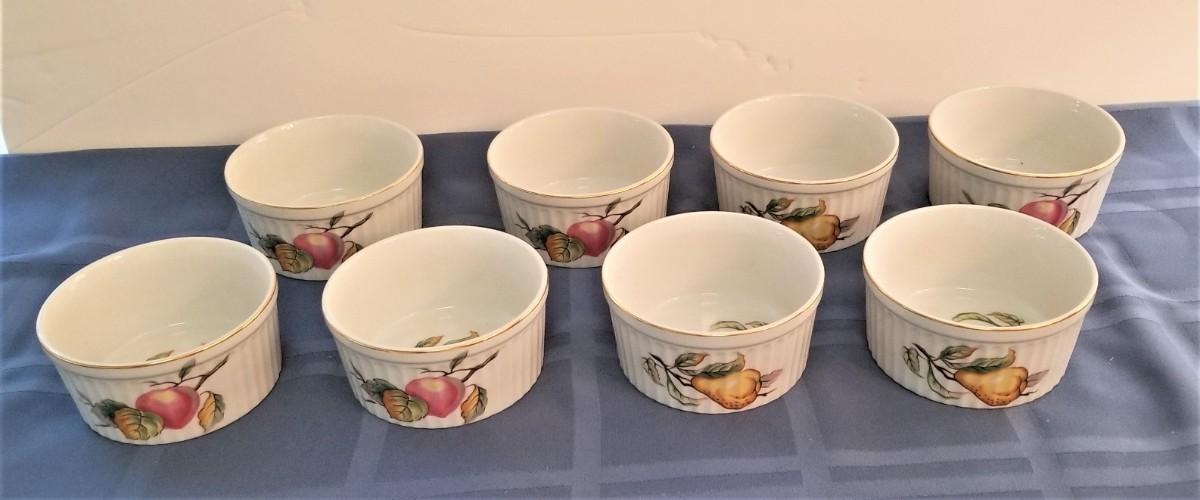 Traditional set of 8 custard/dessert cups - pattern is "Fruit Garden" - oven to table porcelain. Each is 4" across and 2" tall. Good condition.