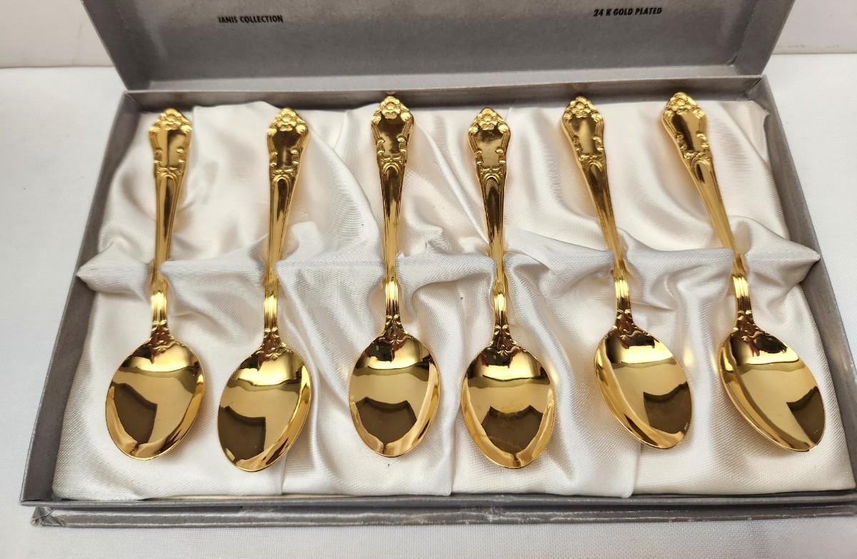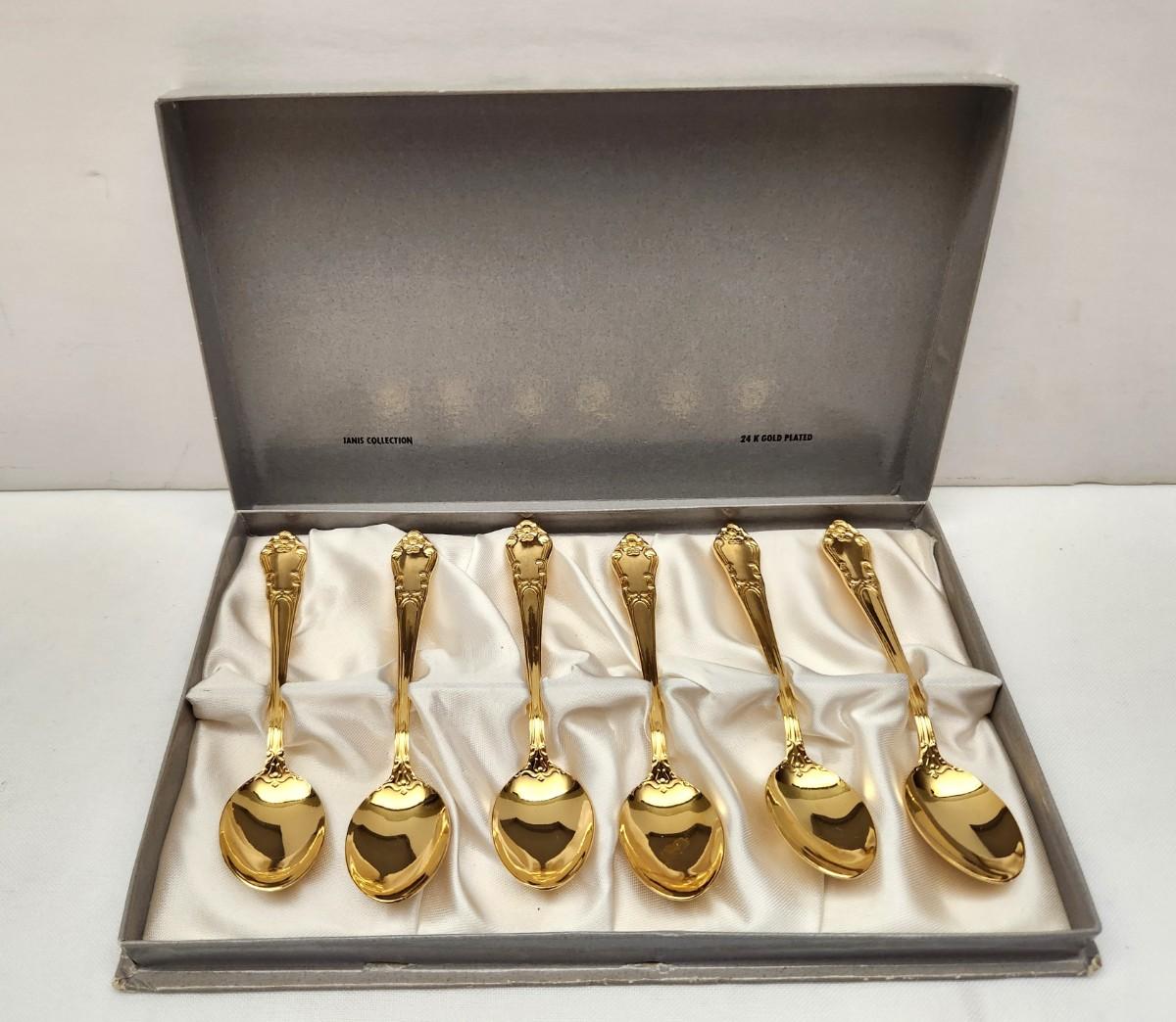 Nice vintage cased lot of demitasse spoons - 24kt gold plated - set of 6. Excellent condition.