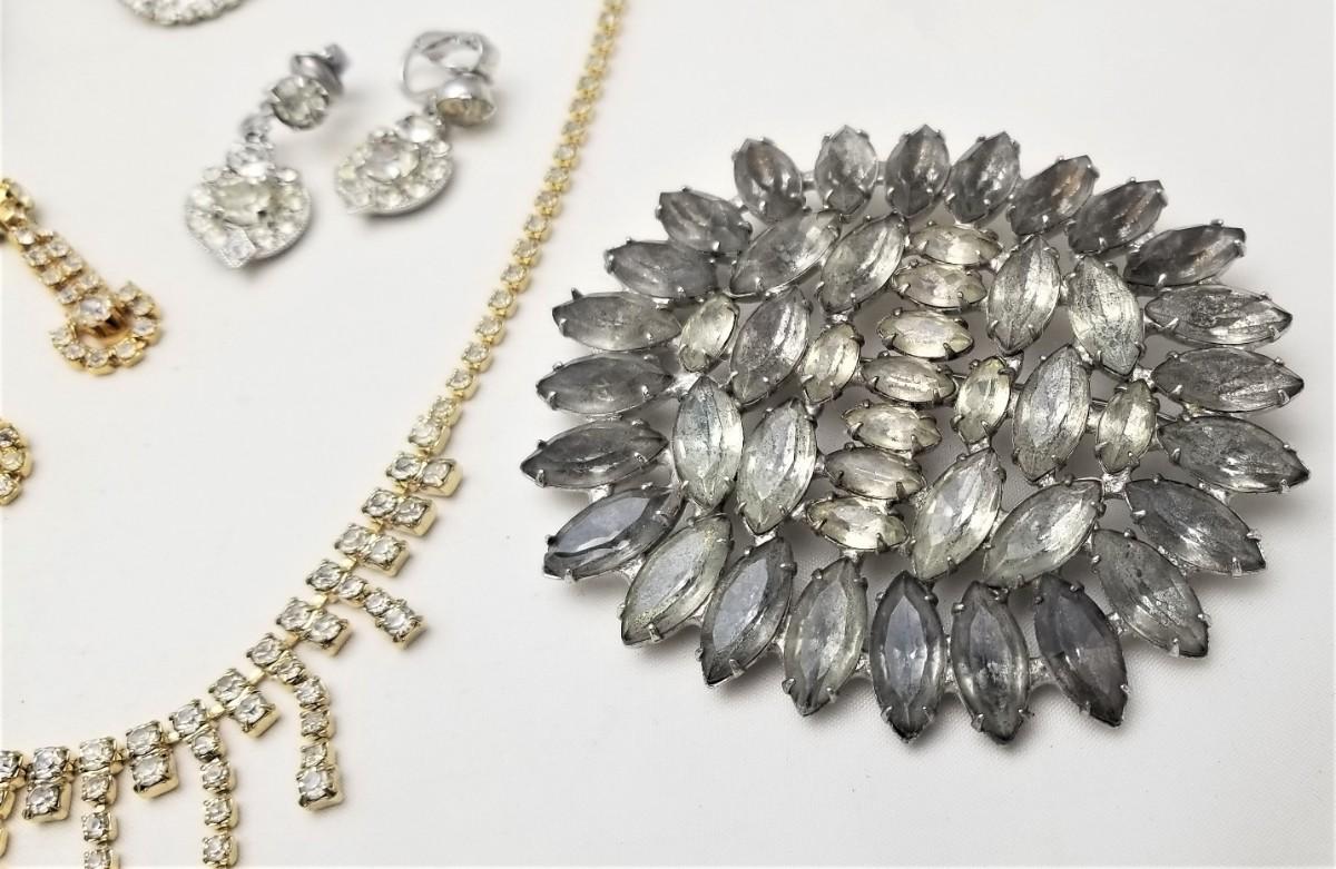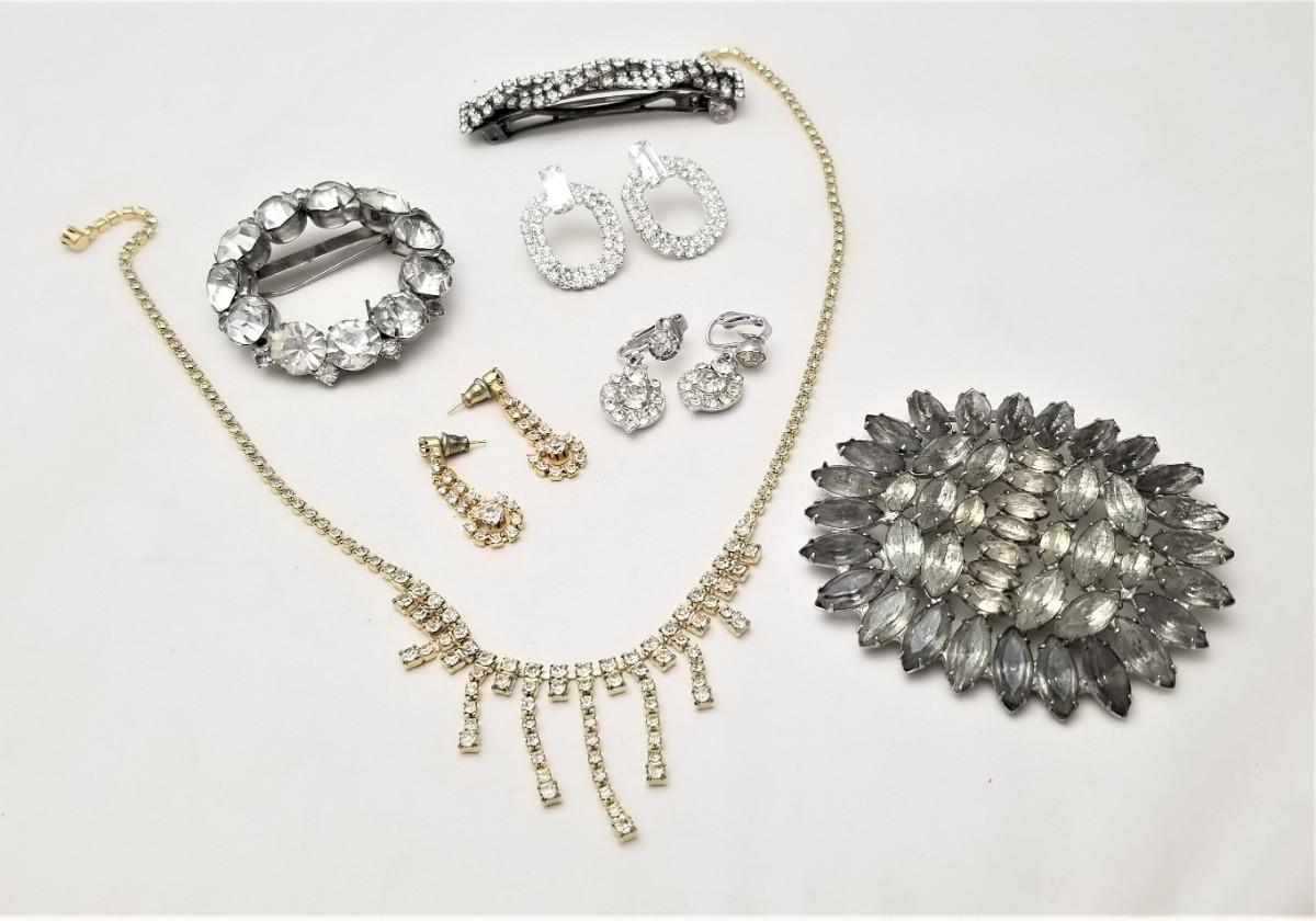 You get all you see here - vintage rhinestone barrett (2" long), large vintage rhinestone brooch, all prong set (2.25" across), vintage circle brooch with large prong set stones (1.5" across), pair pierced circle earrings (,75" long, no backs), pair of pretty clip earrings (just under 1 inch long), pair pierced earrings (drops are 1 inch long, set in gold tone metal) and a necklace, very pretty, 13" long, set in gold tone metal. All in good or vintage condition.
