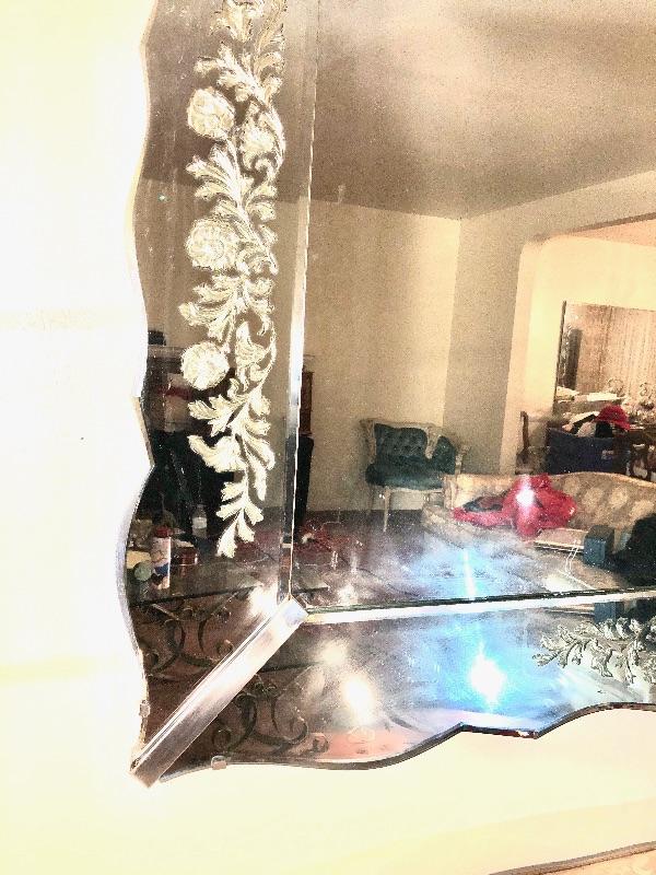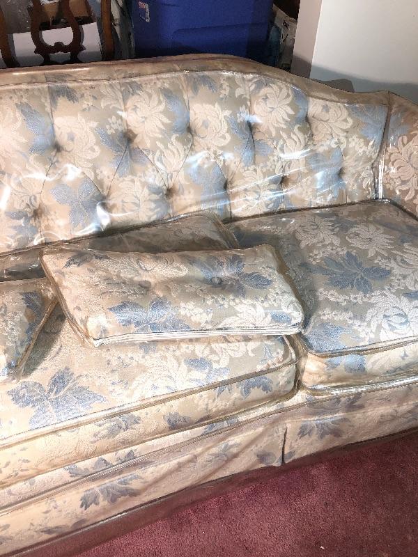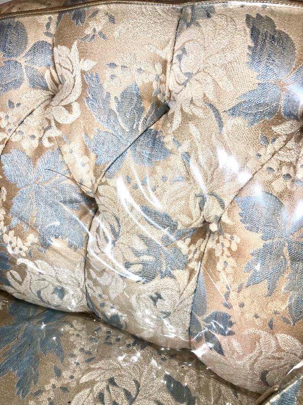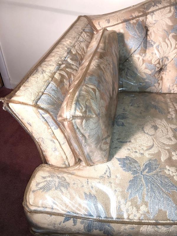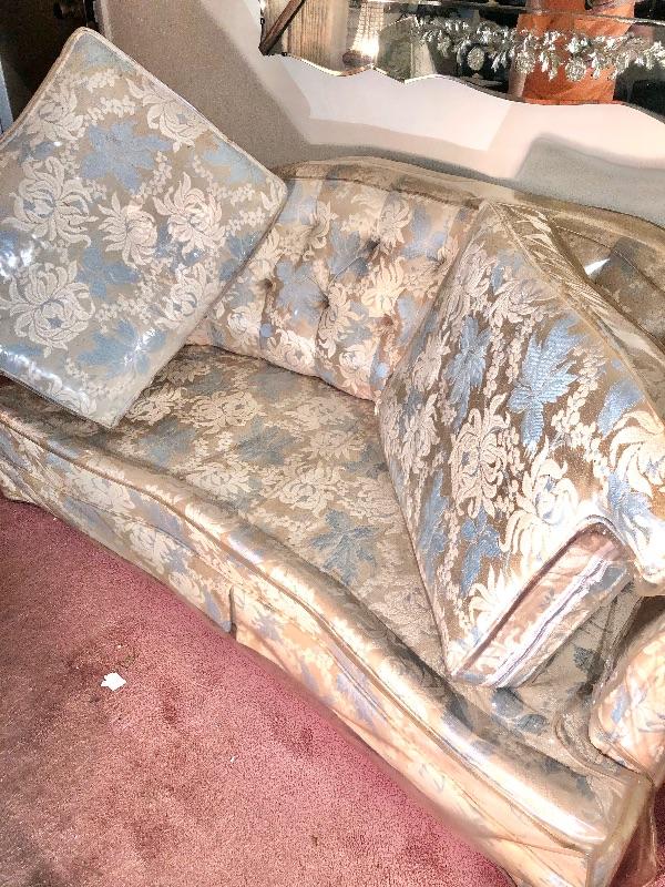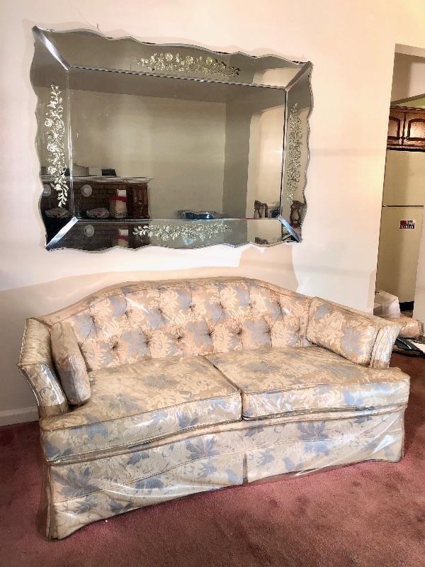 Lot 6 - Beautiful Custom Upholstered Love Seat with Custom Cover and Vintage Etched Mirror