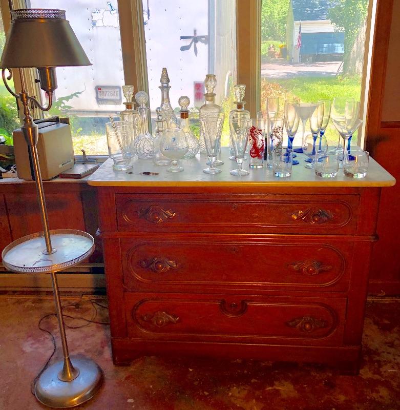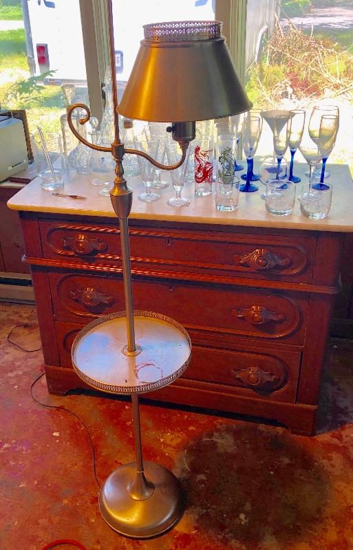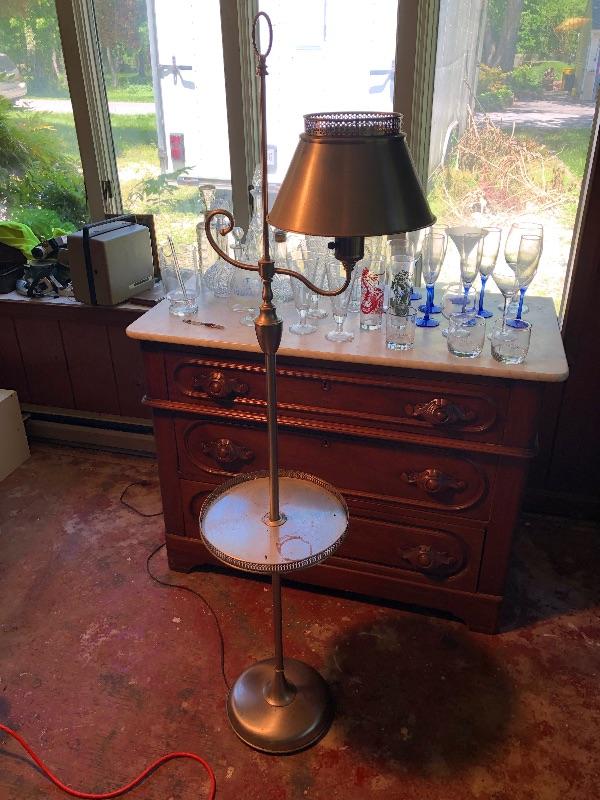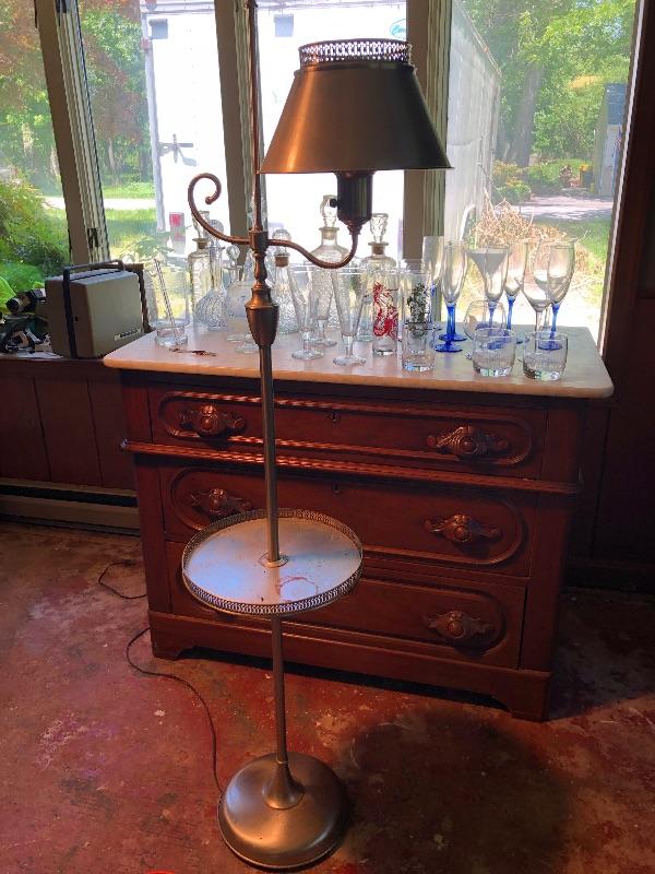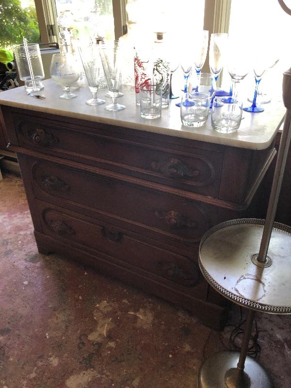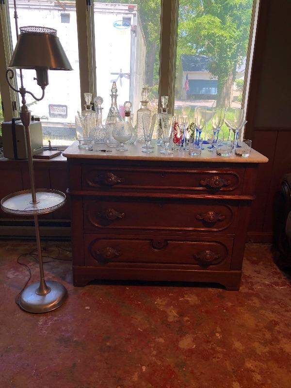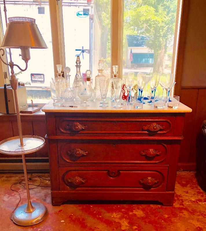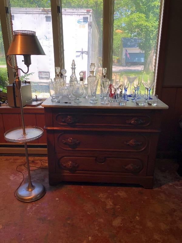LOT 6 - Marble 3 Drawer Victorian Dresser, Floor Lamp & Misc Crystal/Glassware