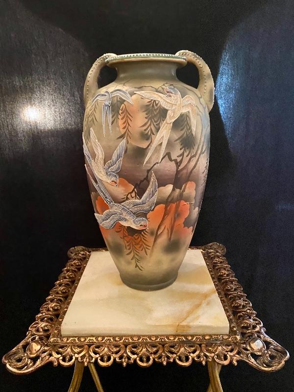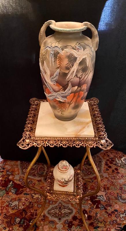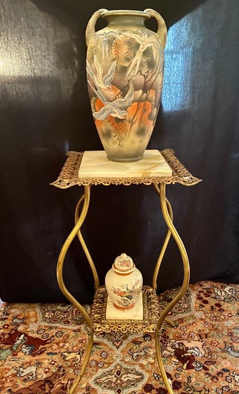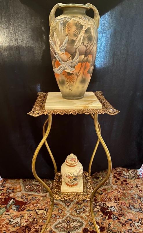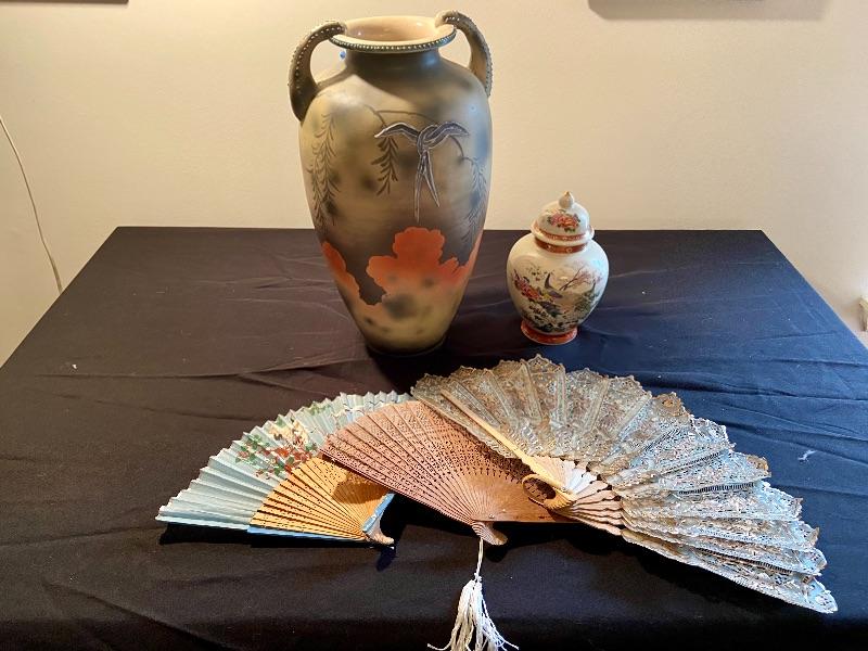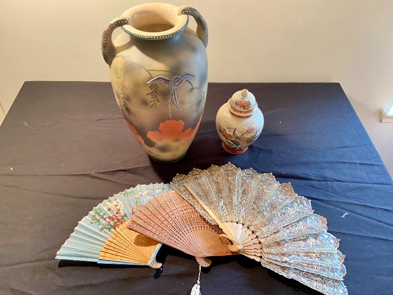 Lot 6: Large ornate Asian Vase, stand, ginger jar and fans
