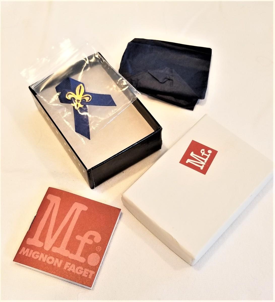 Good for a lady OR a gentleman - Mignon Faget pierced Fleur di Lis lapel pin or Tie tack. Comes in original box with booklet - never used. Measures 1/2" tall.