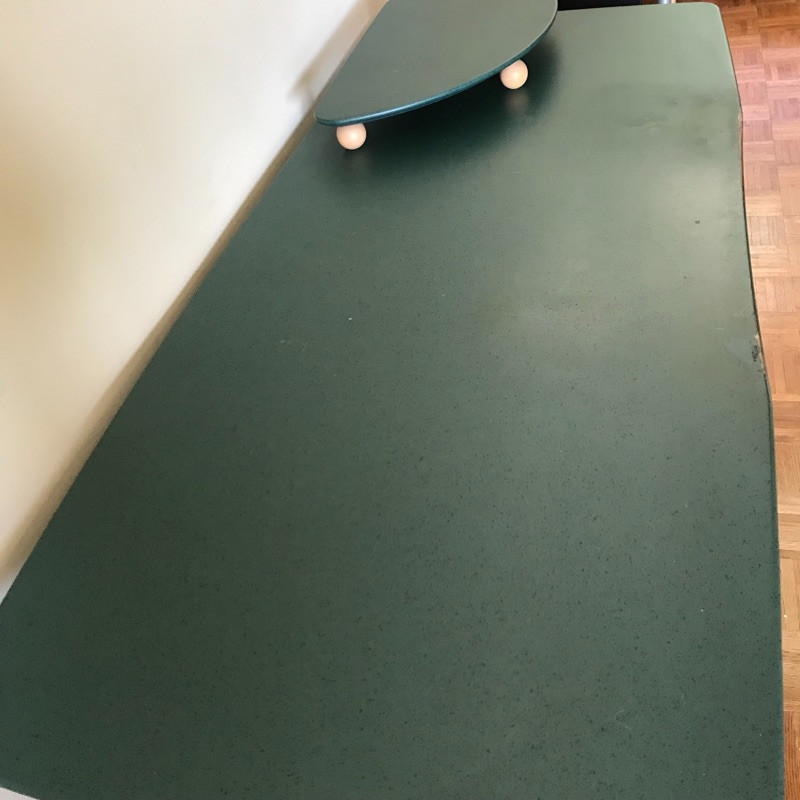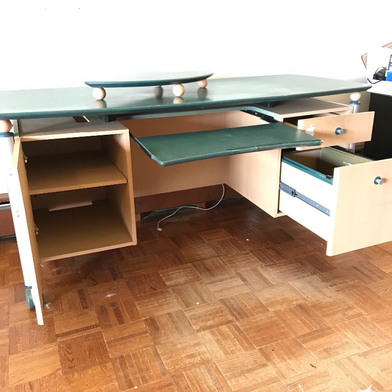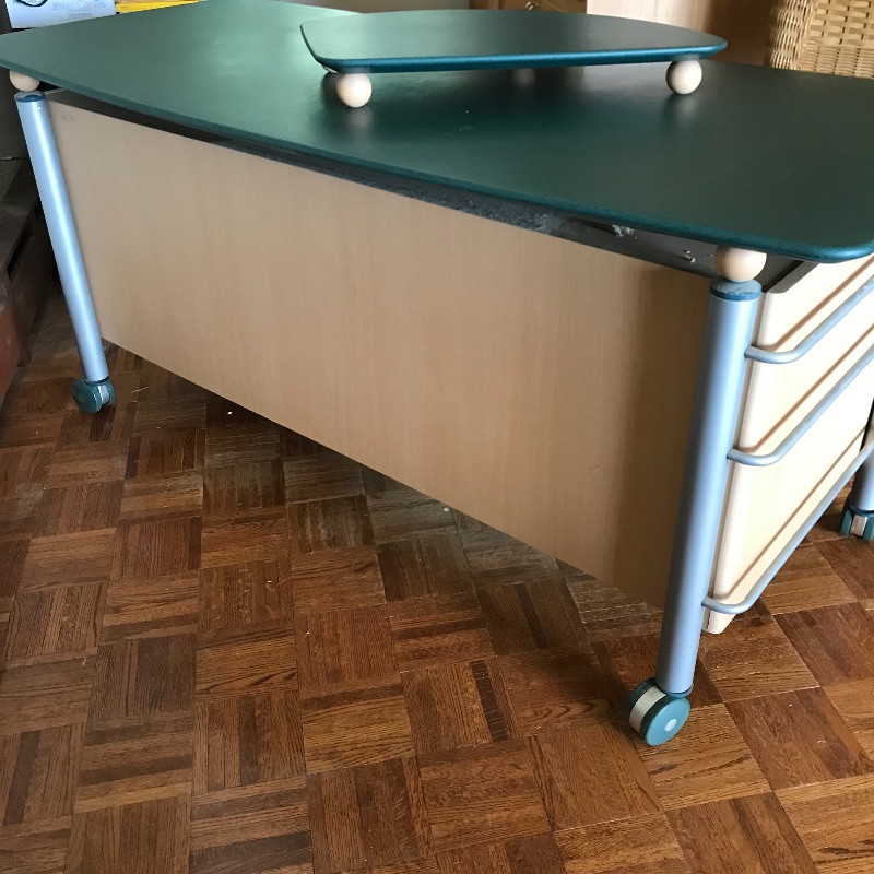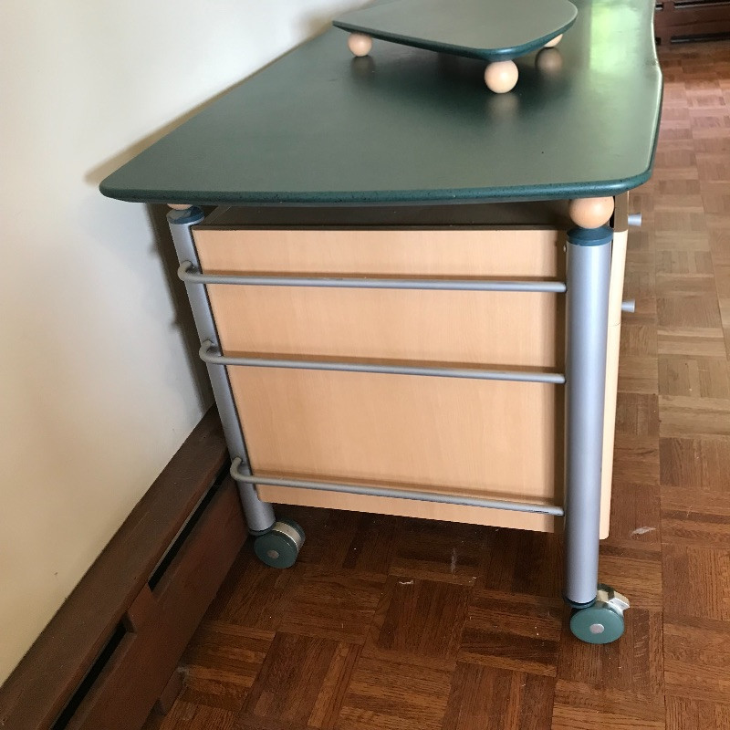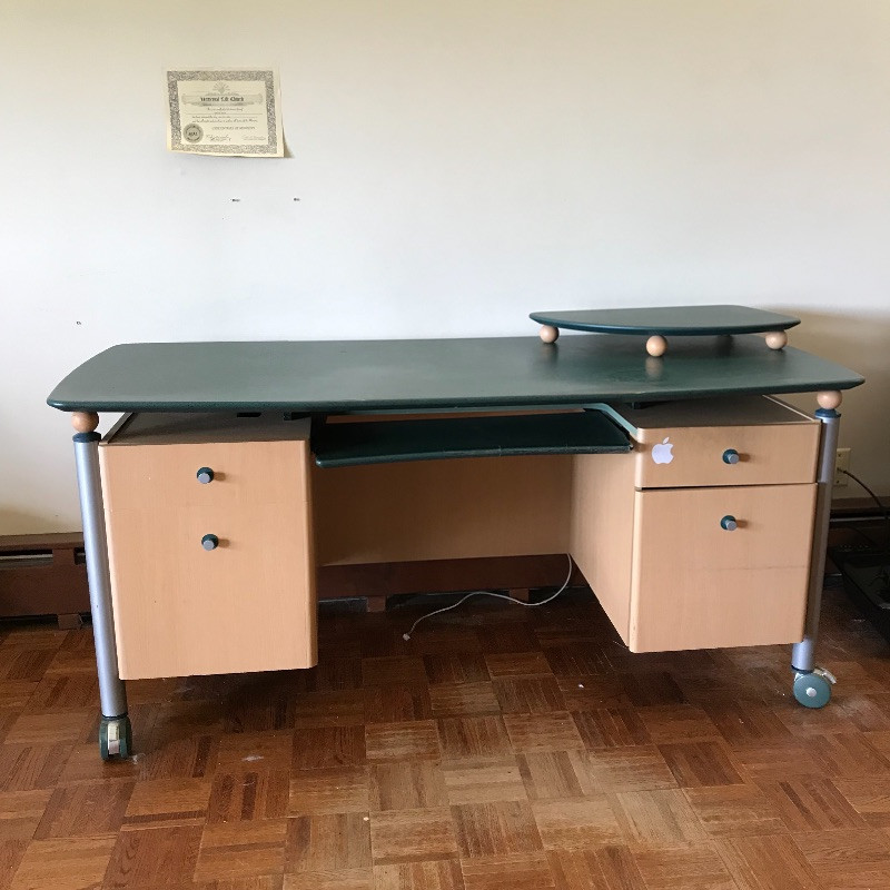 Slick looking modern computer desk with unattached matching riser perfect for organizing or raising your monitor. Desk has a locking pullout keyboard shelf, cabinet space and two drawers, one of which is file ready. Some wear is found on the edges of the green top, see images. Desk looks great from all angles and is on wheels making for an easier move, wheels are lockable. Desk measures 66” x 28.75” x 30” and the riser measures approximately 22.5” x 14” x 3”. Check out the matching unit in lot 2!