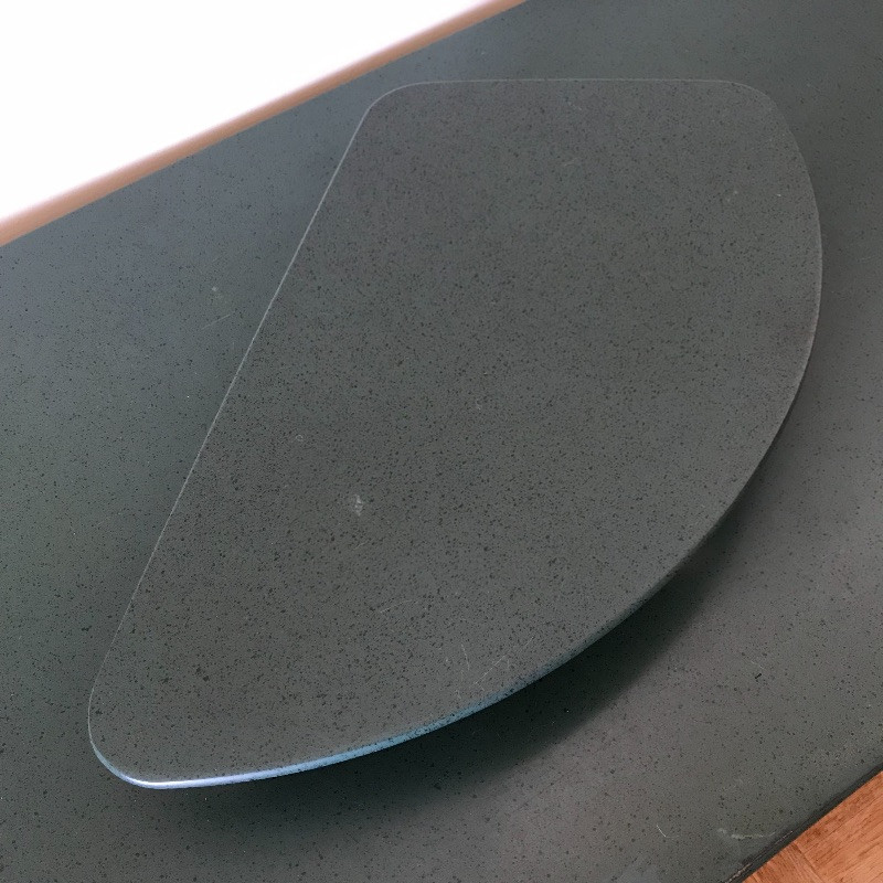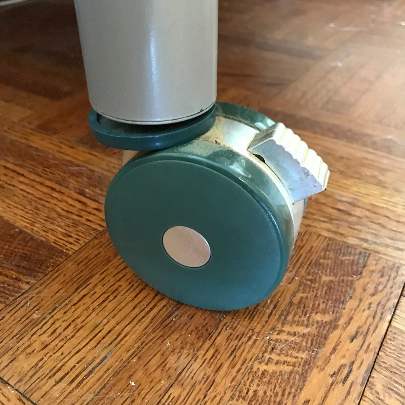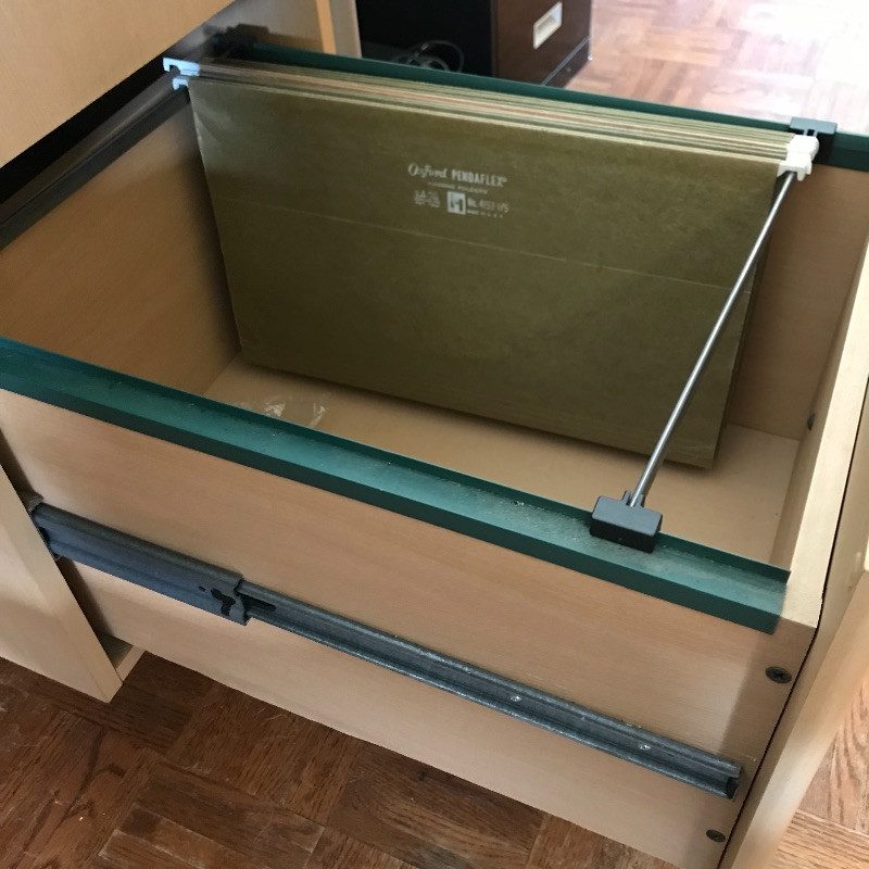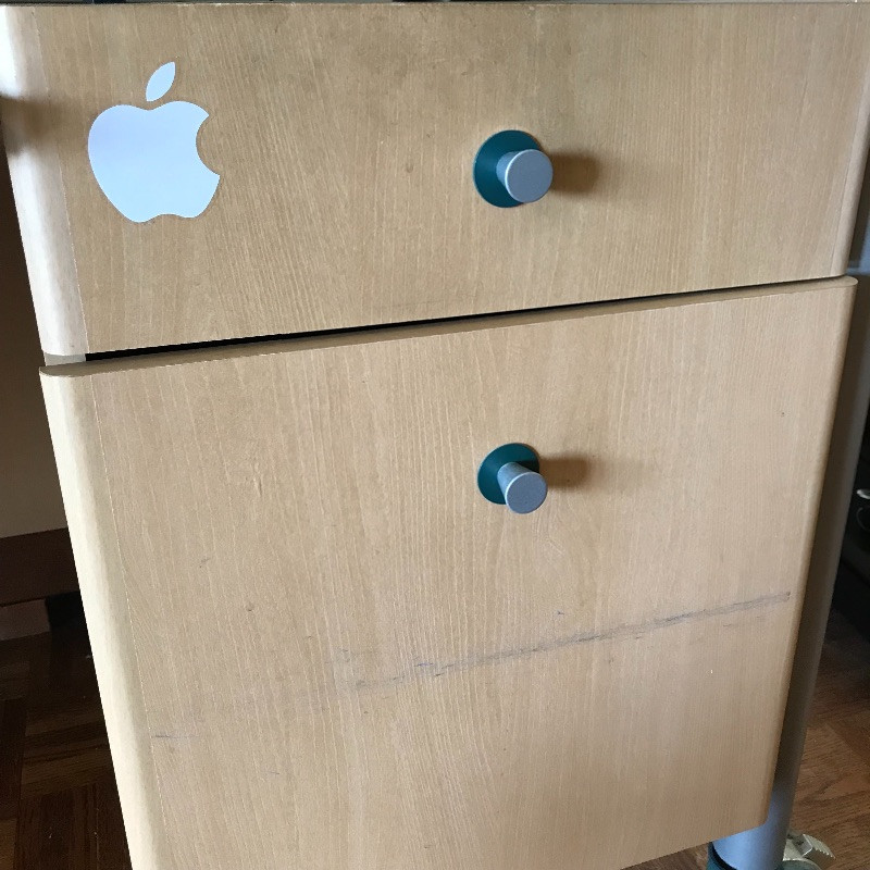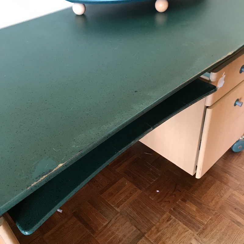 Slick looking modern computer desk with unattached matching riser perfect for organizing or raising your monitor. Desk has a locking pullout keyboard shelf, cabinet space and two drawers, one of which is file ready. Some wear is found on the edges of the green top, see images. Desk looks great from all angles and is on wheels making for an easier move, wheels are lockable. Desk measures 66” x 28.75” x 30” and the riser measures approximately 22.5” x 14” x 3”. Check out the matching unit in lot 2!