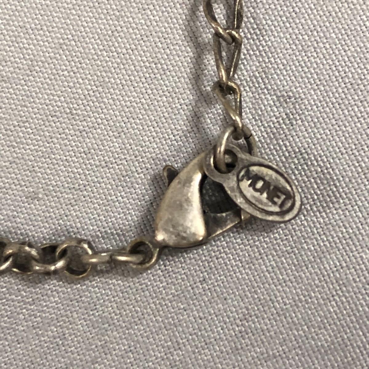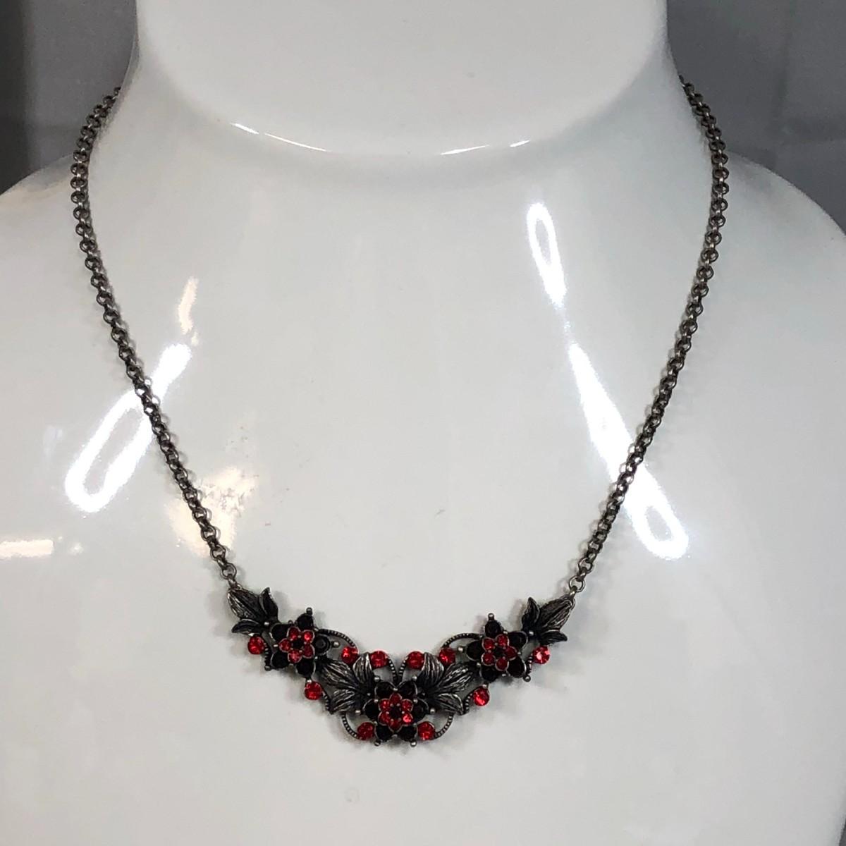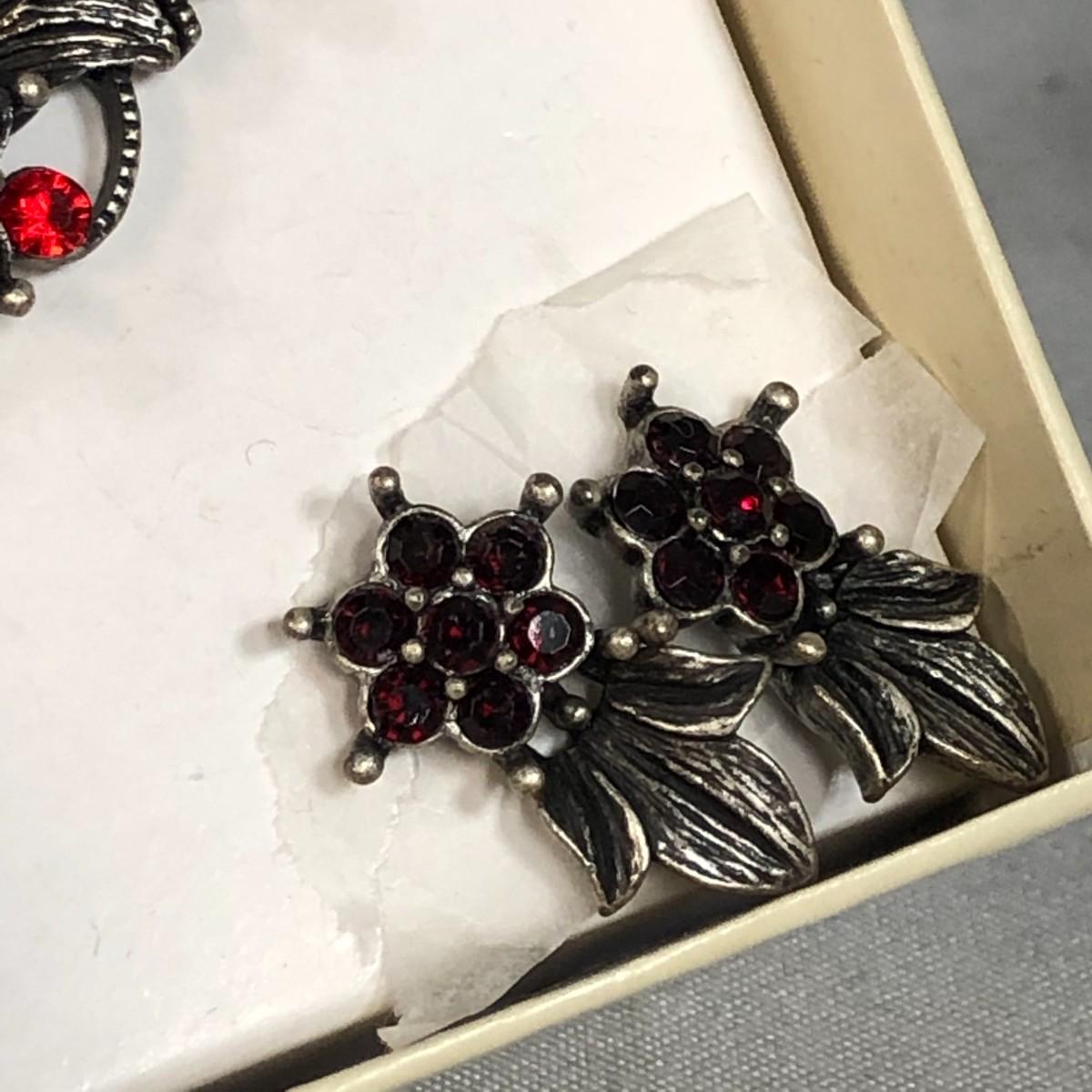 Brushed silver tone metal with bright and dark red crystals. Marked Monet and in excellent condition.