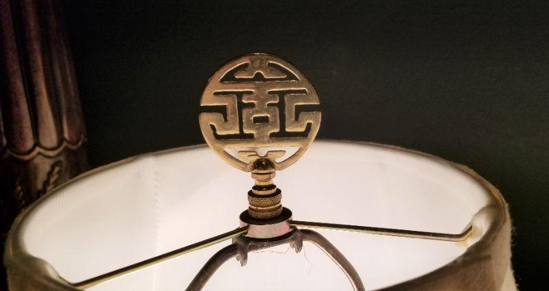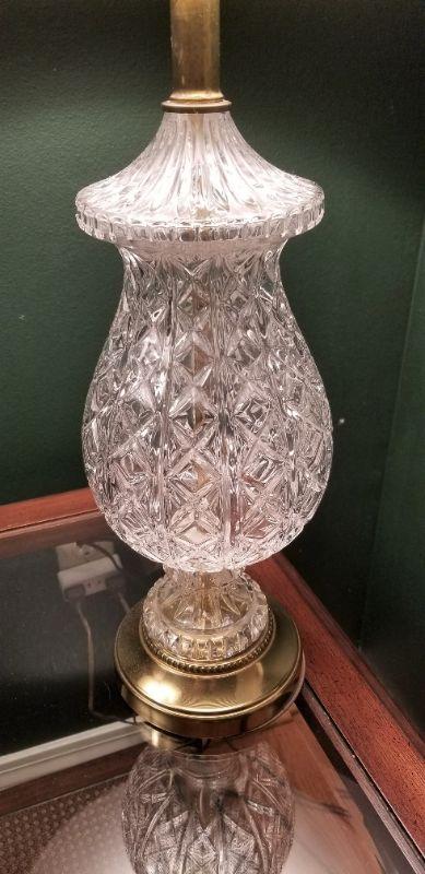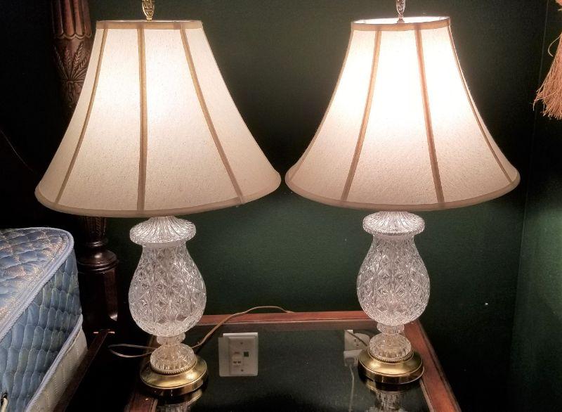 These lamps have classic styling with a pressed glass, crystal-look base and even a little Asian finial to top things off. They work fine. Shades in good condition. Price is for the pair. Each stands 31" tall.