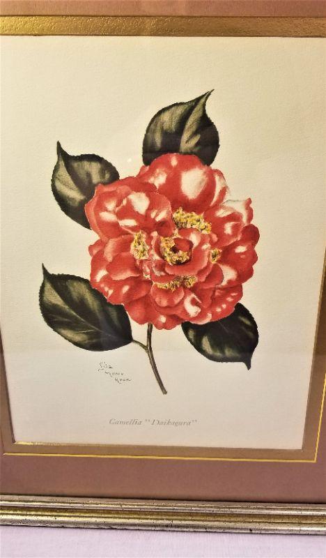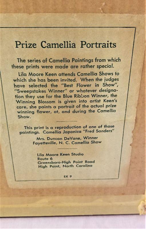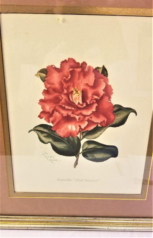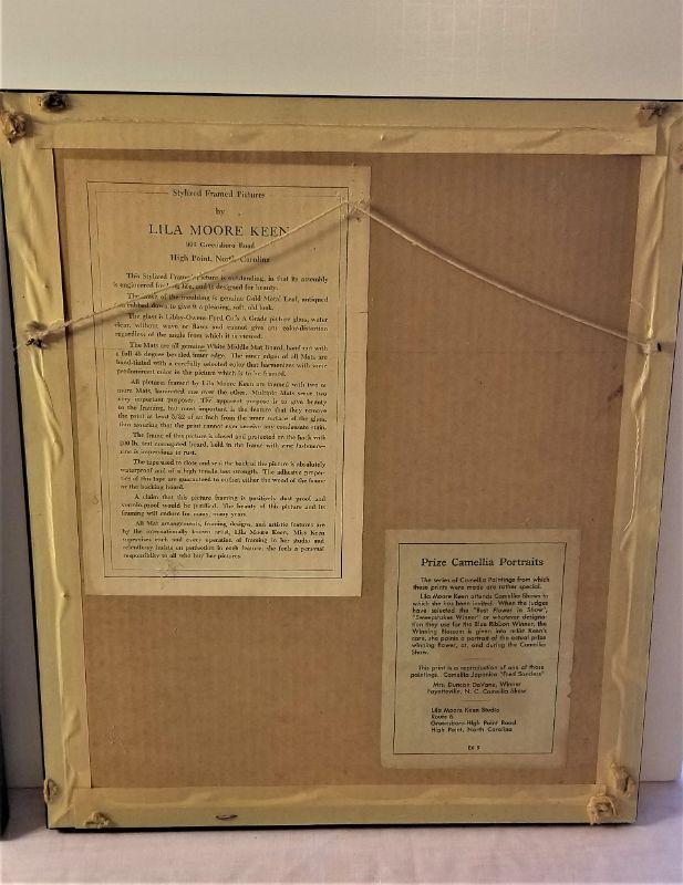 Pretty vintage framed pair of Camellia portraits by Lila Moore Keen of High Point, NC. Each measures 12" x 13.75". One has a bit of dust under the glass. This woman would be invited to Camellia/flower shows and she would do a portrait of the winning entries in the various categories. Provenance on the back of one of the pictures. Very attractive.
